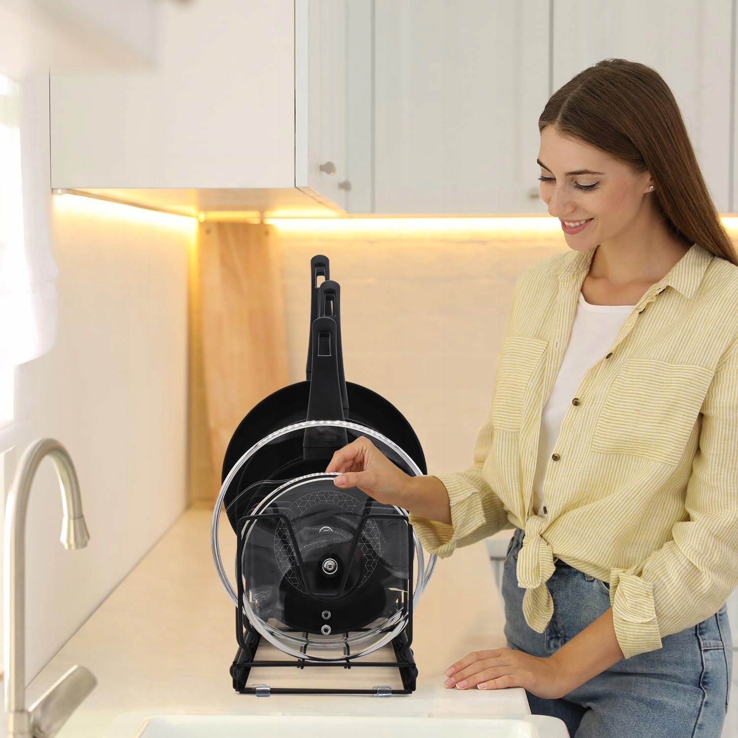 Завдяки організатору для горщиків та каструль ви будете тримати замовлення на кухні. Вам більше не доводиться організовувати страви одне з іншого - тепер у кожного з них є своє місце, яке полегшує доступ і збільшує функціональність шаф.
