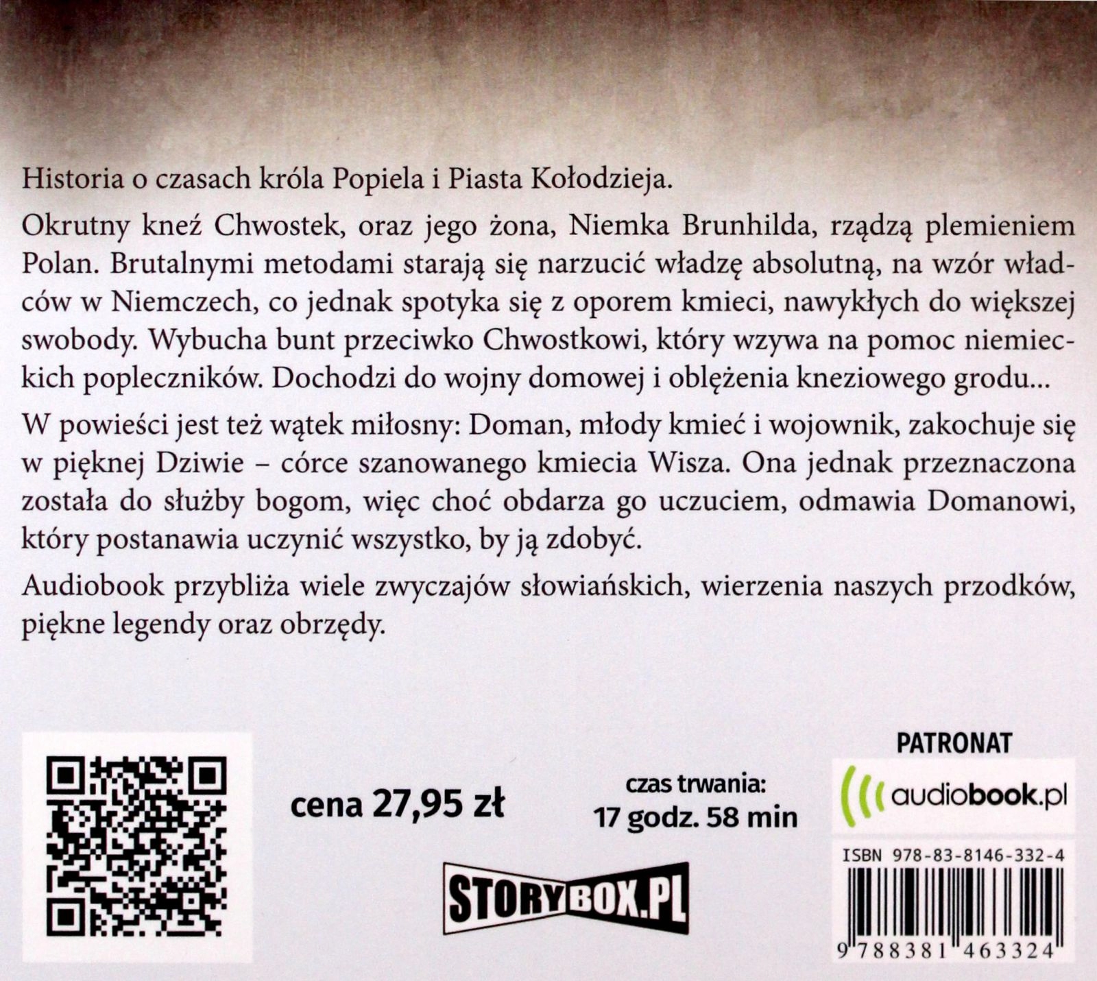 Історія часів короля Попеля та П'яста Колодзея. Племенем полян правлять жорстокий князь Хвостек і його дружина німкеня Брунгільда. Жорстокими методами вони намагаються нав’язати абсолютну владу за прикладом правителів у Німеччині, але це зустрічає опір селян, які звикли до більшої свободи. Вибухає повстання проти Хвостека, який закликає на допомогу німецьких прихильників. Йде громадянська війна й облога княжого міста... Другий сюжет роману — любовний: молодий селянин і воїн Доман закохується в красуню Дзіву — доньку шановного селянина Віша. Однак їй судилося служити богам, тому, хоча вона відчуває до нього почуття, вона відмовляє Доману, який вирішує зробити все, щоб завоювати її. Аудіокнига знайомить з багатьма слов'янськими звичаями, віруваннями наших предків, красивими легендами та обрядами.