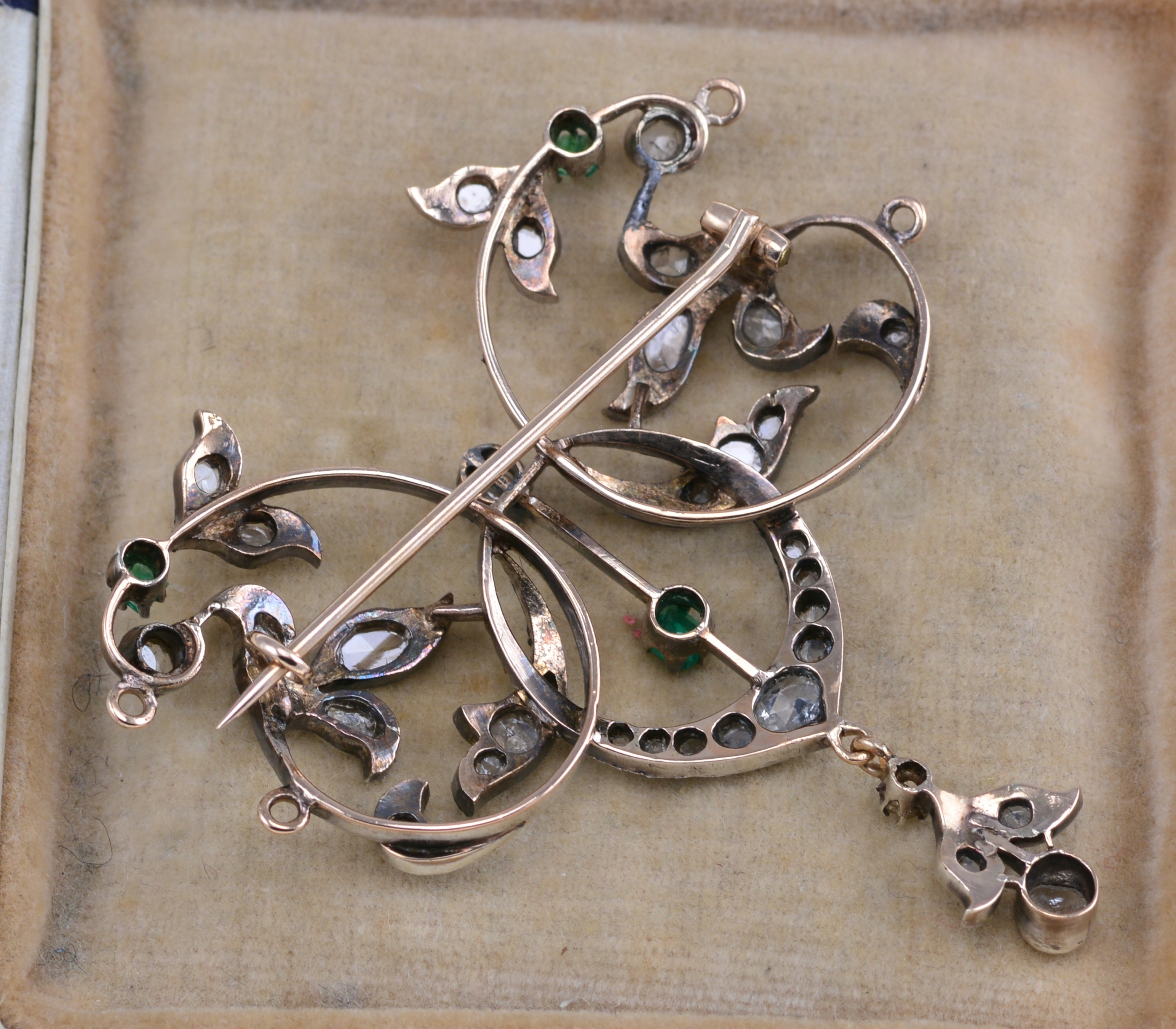 Предметом продажу є елегантний і приваблива брошка, яку можна носити як кулон. Брошка виготовлена зі срібла та золота, каміння оправлене сріблом, низ брошки та шпилька із золота. Прикрашений смарагдами та діамантами в характерній розетці, він створює ніжний квітковий візерунок. Ця позачасова прикраса є ідеальним прикладом ювелірних виробів рубежу 19-го та 20-го століть.