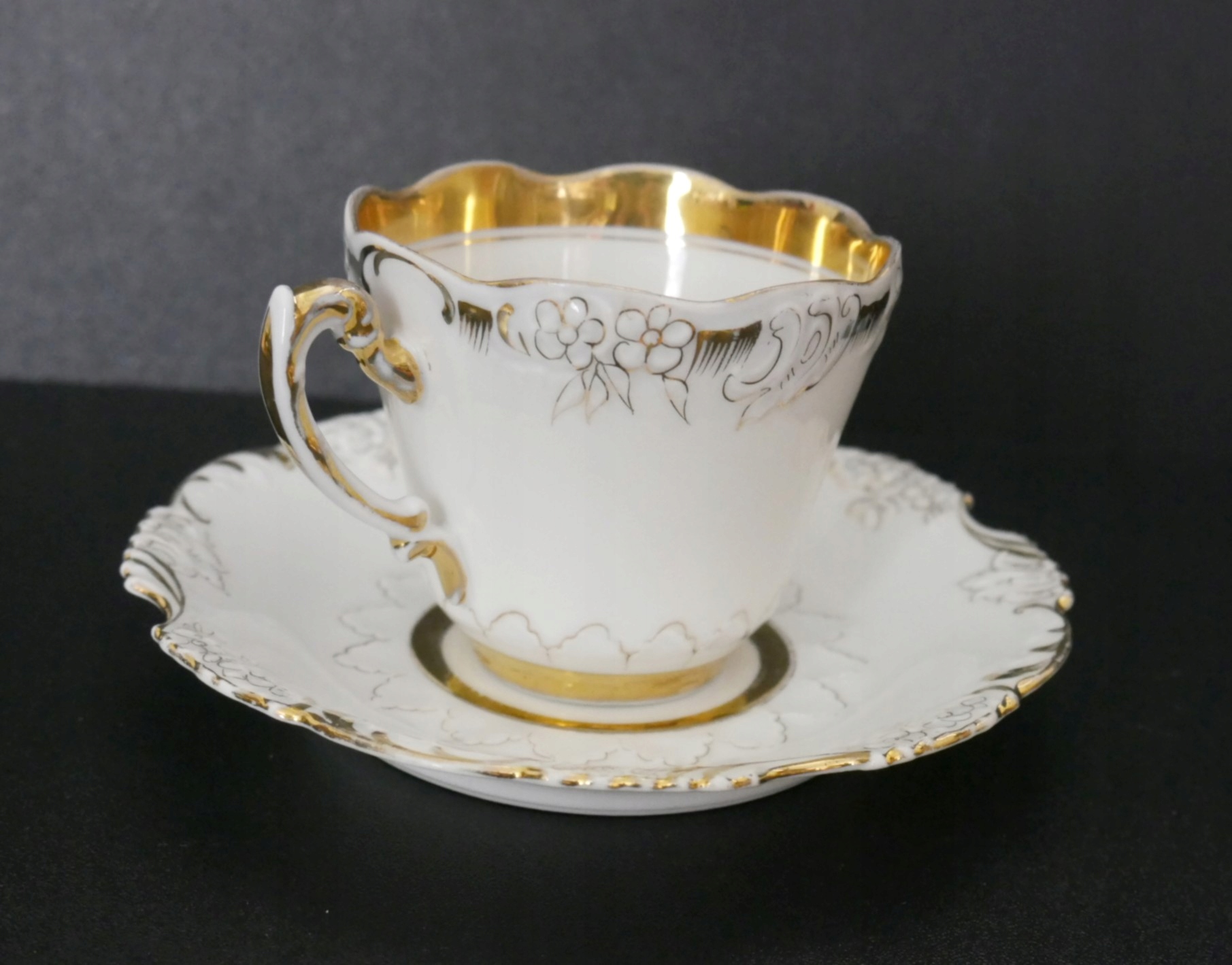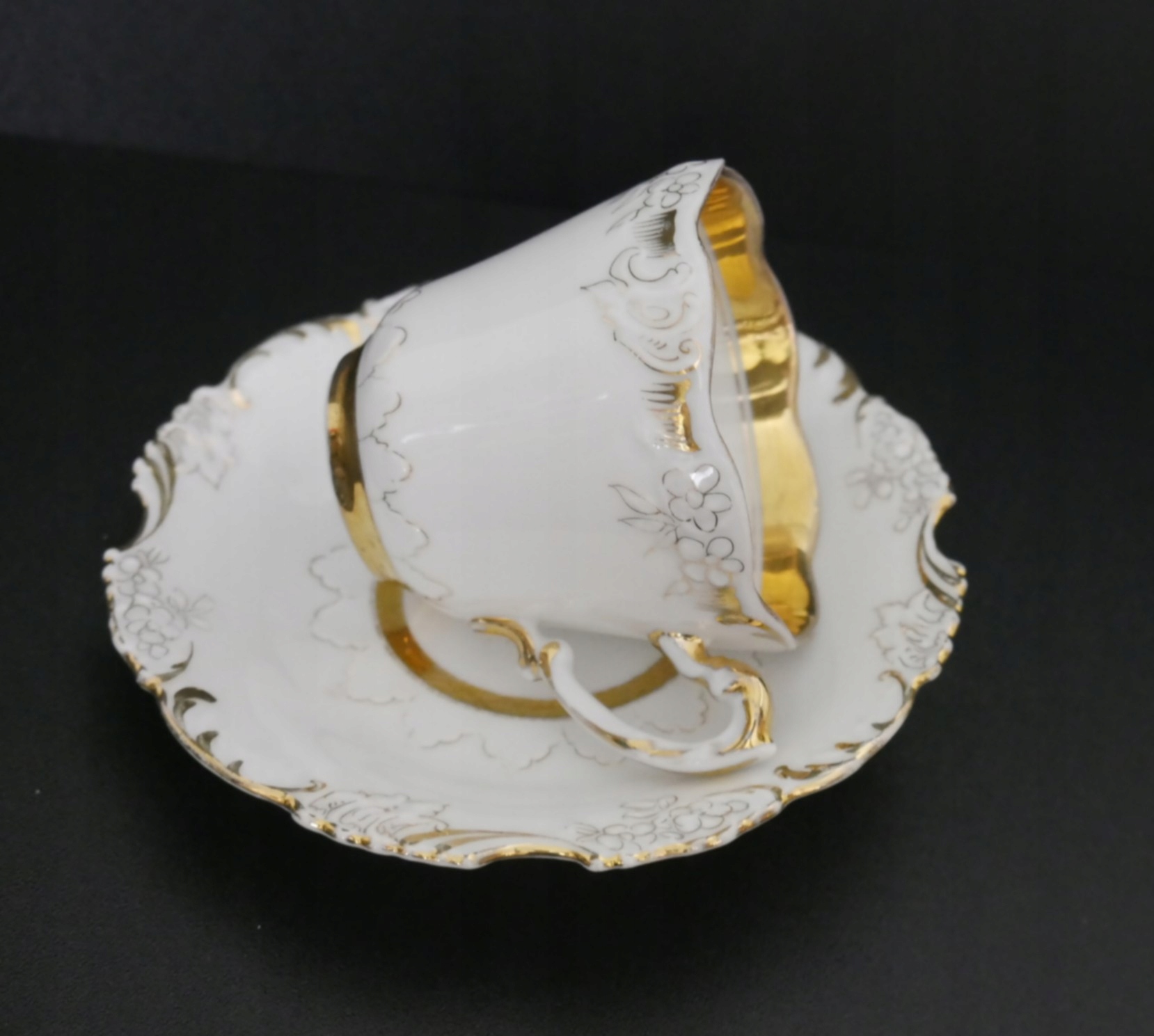 біла порцеляна, тонка, прозора, рельєфи підкреслені сусальним золотом