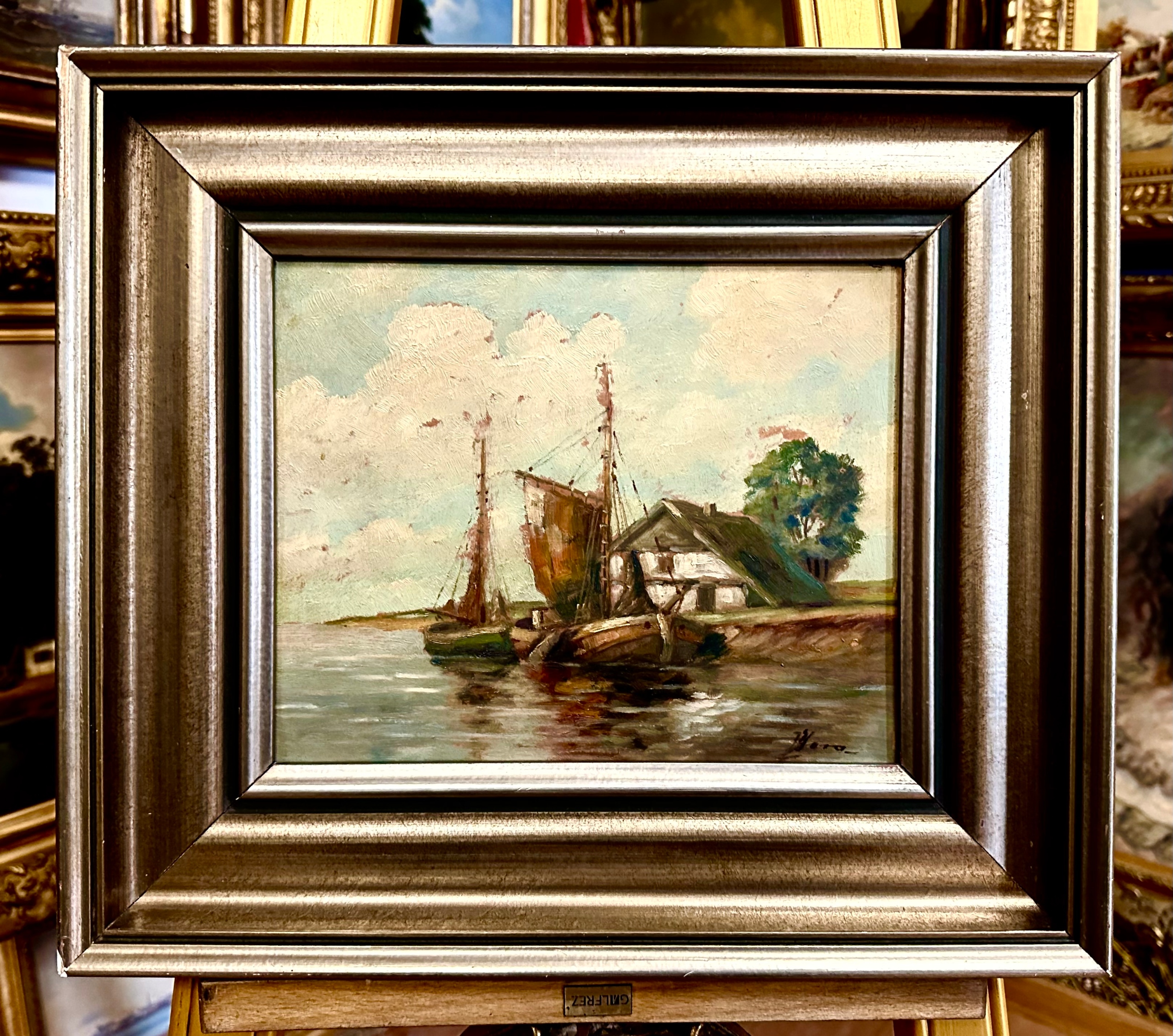 STARA CHATA I ŁODZIE PRZY BRZEGU MORZA CENNY OBRAZ PIĘKNY IMPRESJONIZM