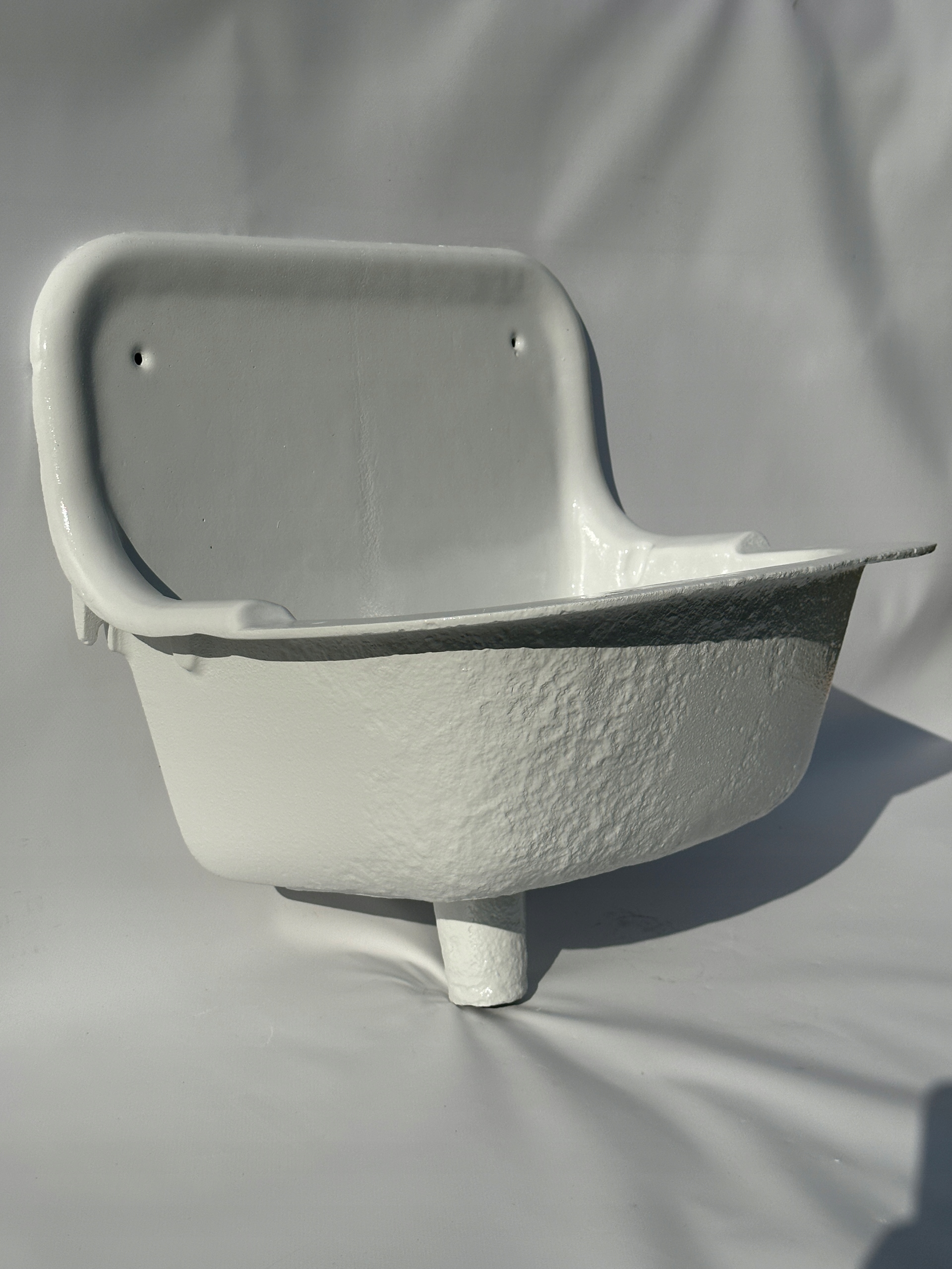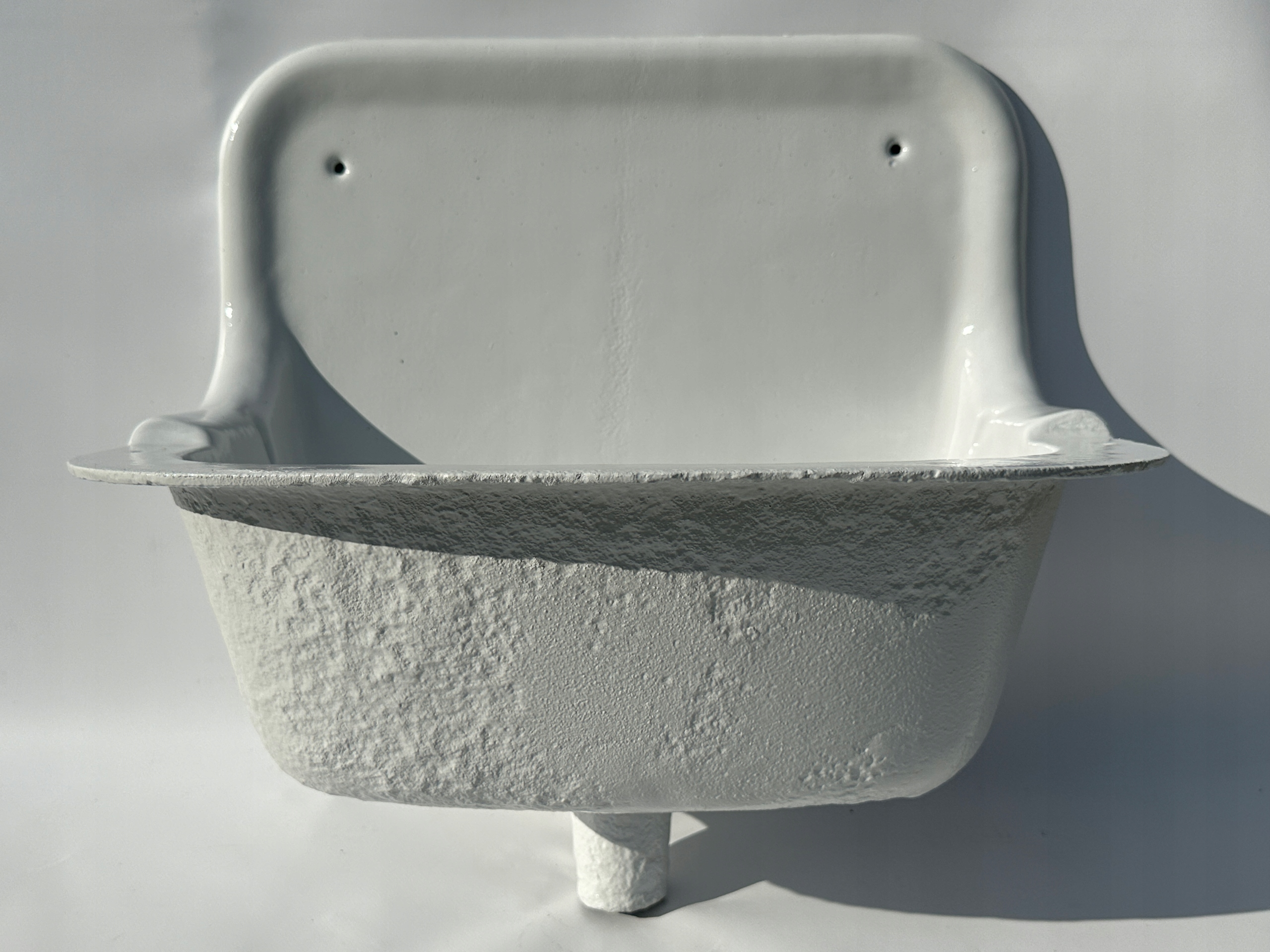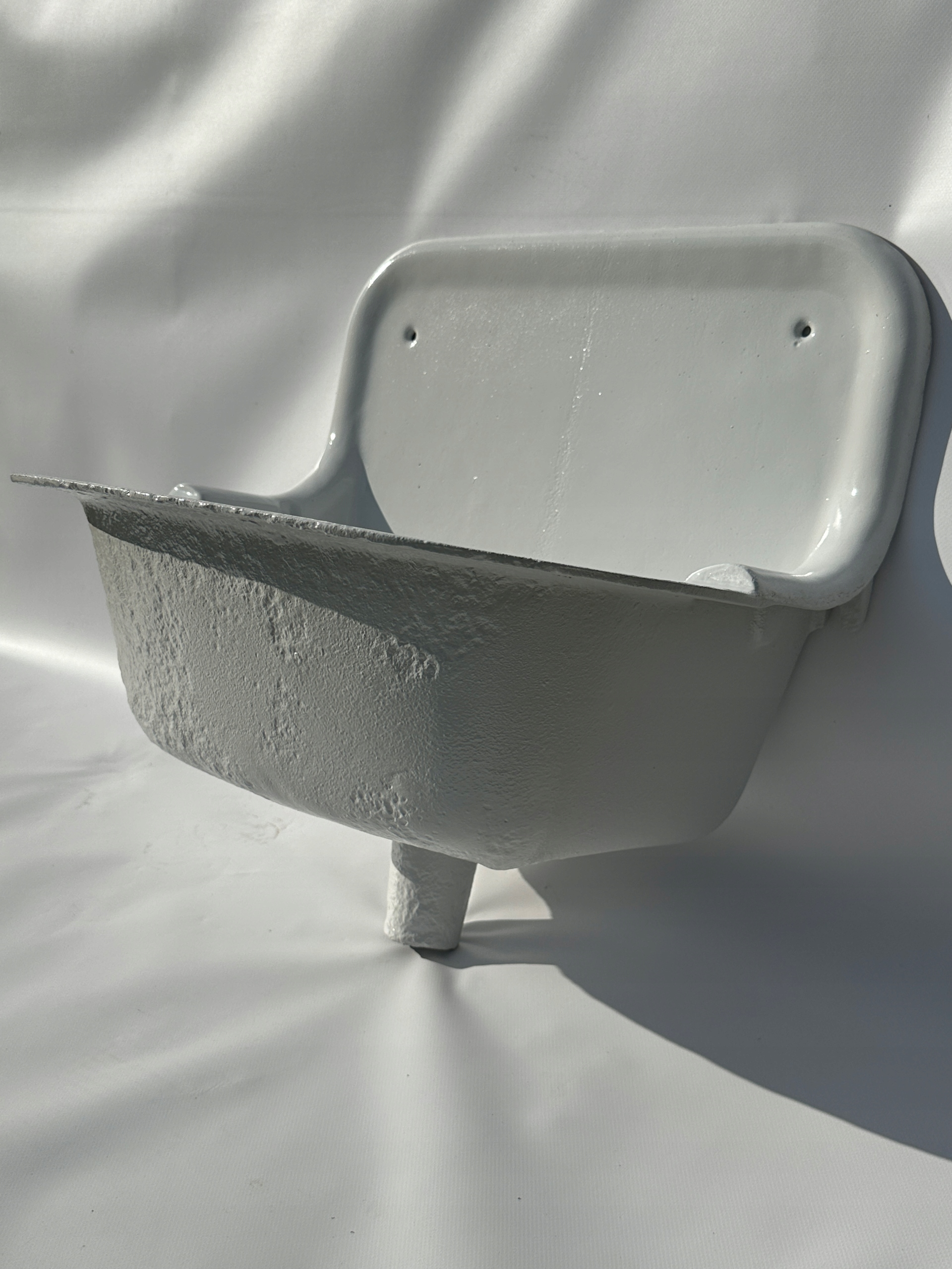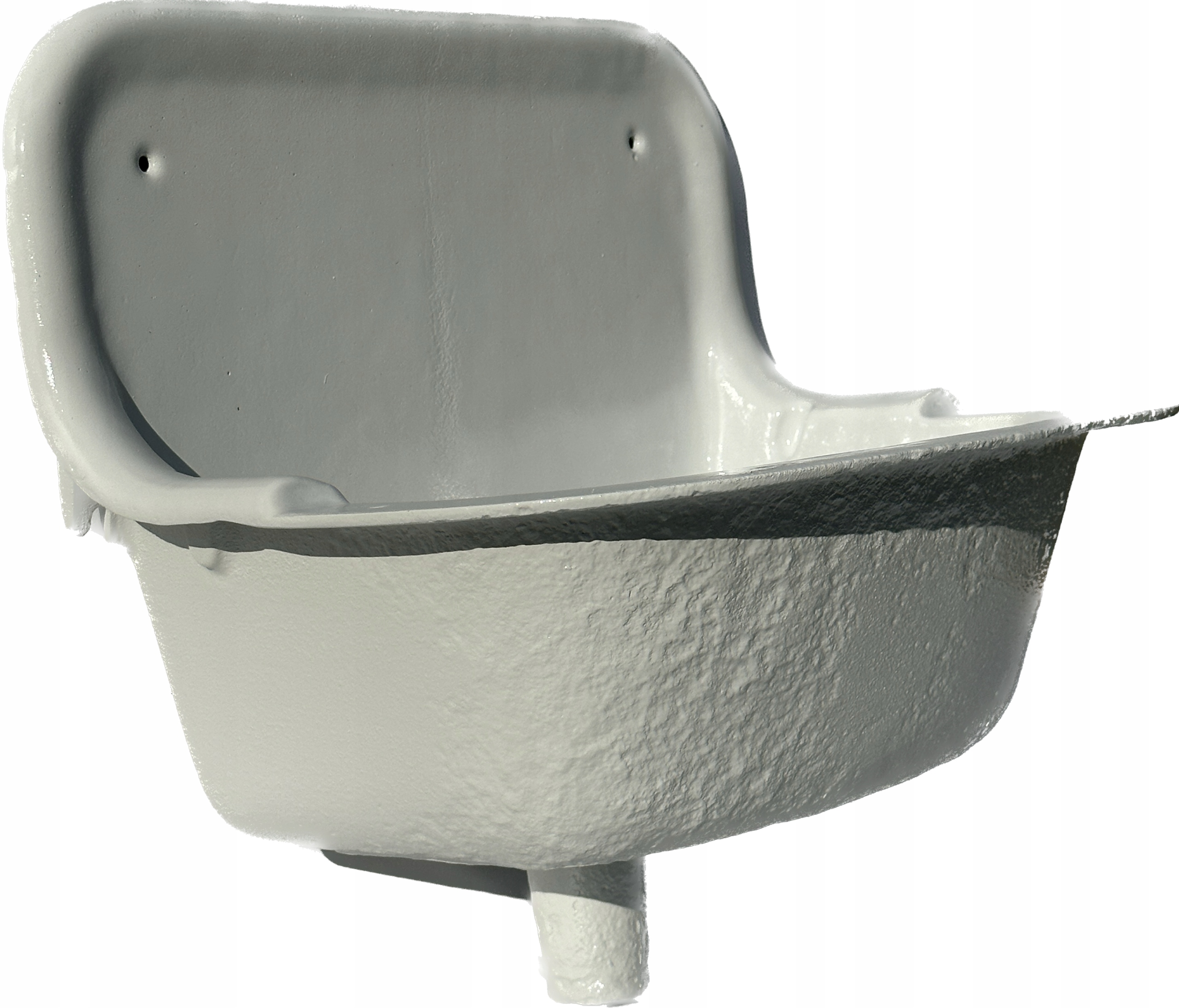 Предмет продажу стара чавунна мийка - умивальник. Дуже гарний візерунок. Цікава модель з плоским широким краєм в передній частині. Раковина ціла, не тріснута. Сито також неушкоджене. Має оригінальні отвори для підвішування. Можна також використовувати як підвісну підставку для квітів.