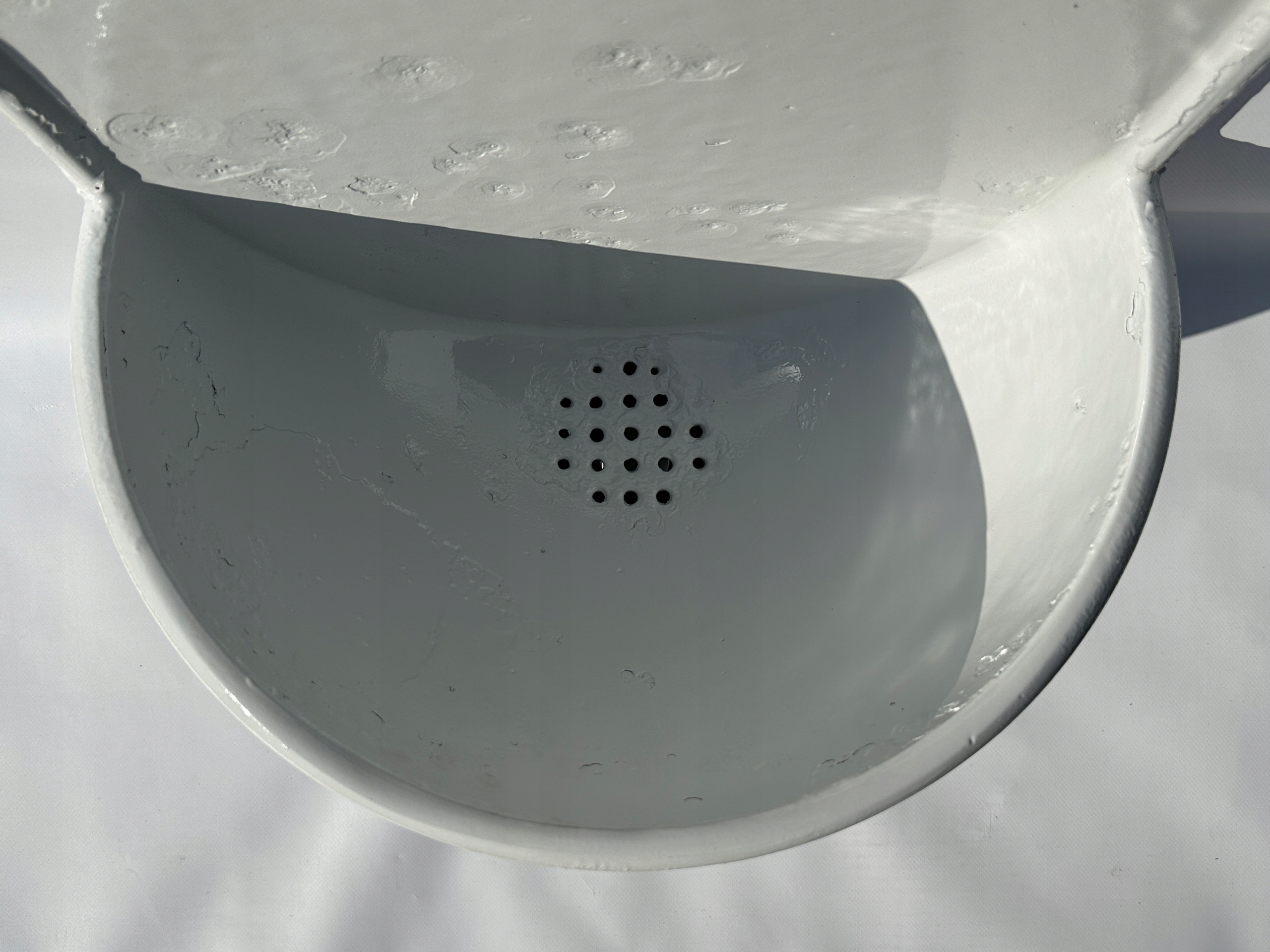 Предмет продажу стара чавунна мийка - умивальник. Дуже гарний візерунок. На звороті видно номер 1045. Раковина ціла, не тріснута. Сито також неушкоджене. Має 4 оригінальних отвори для підвішування. Можна також використовувати як підвісну підставку для квітів.