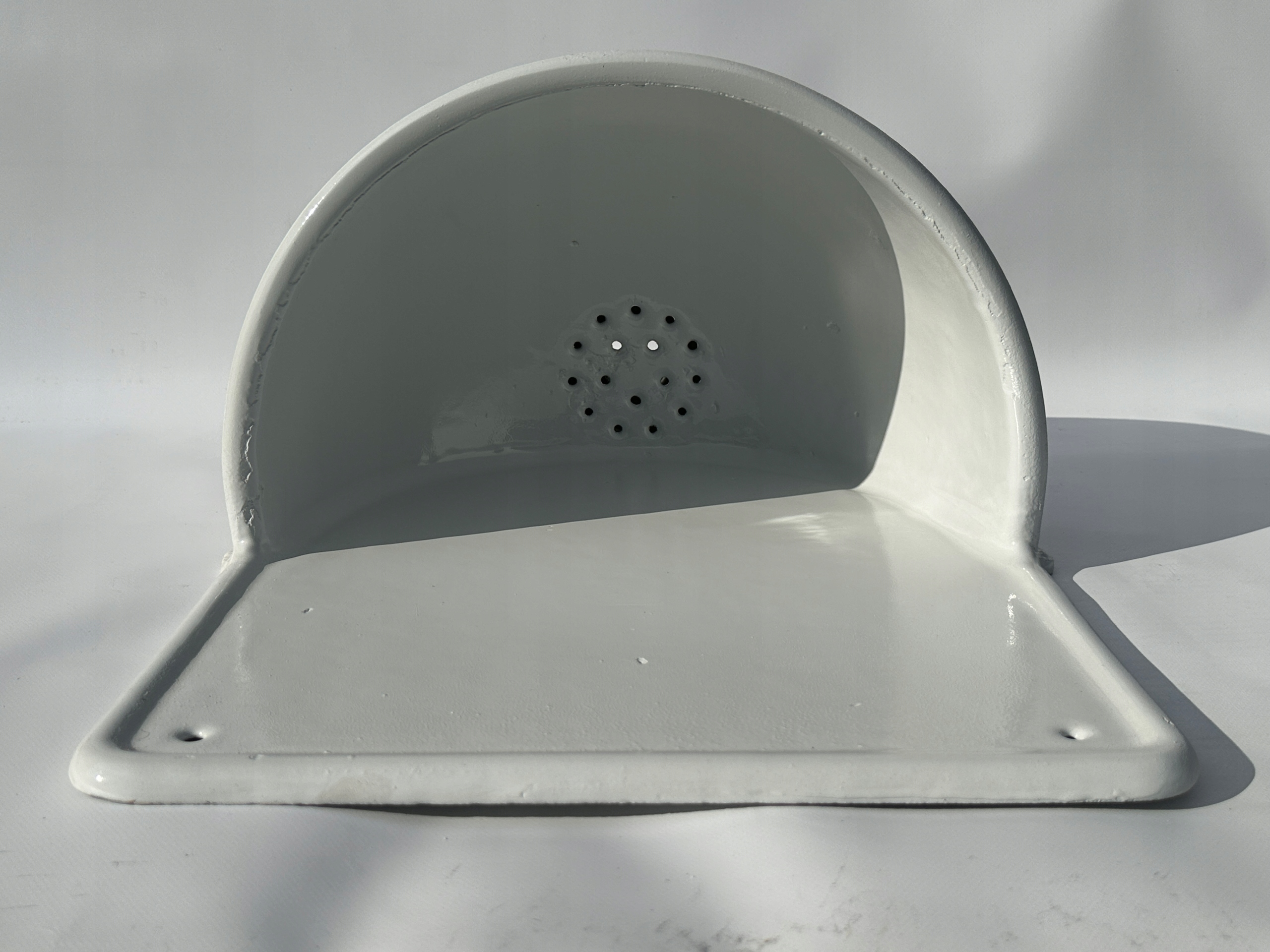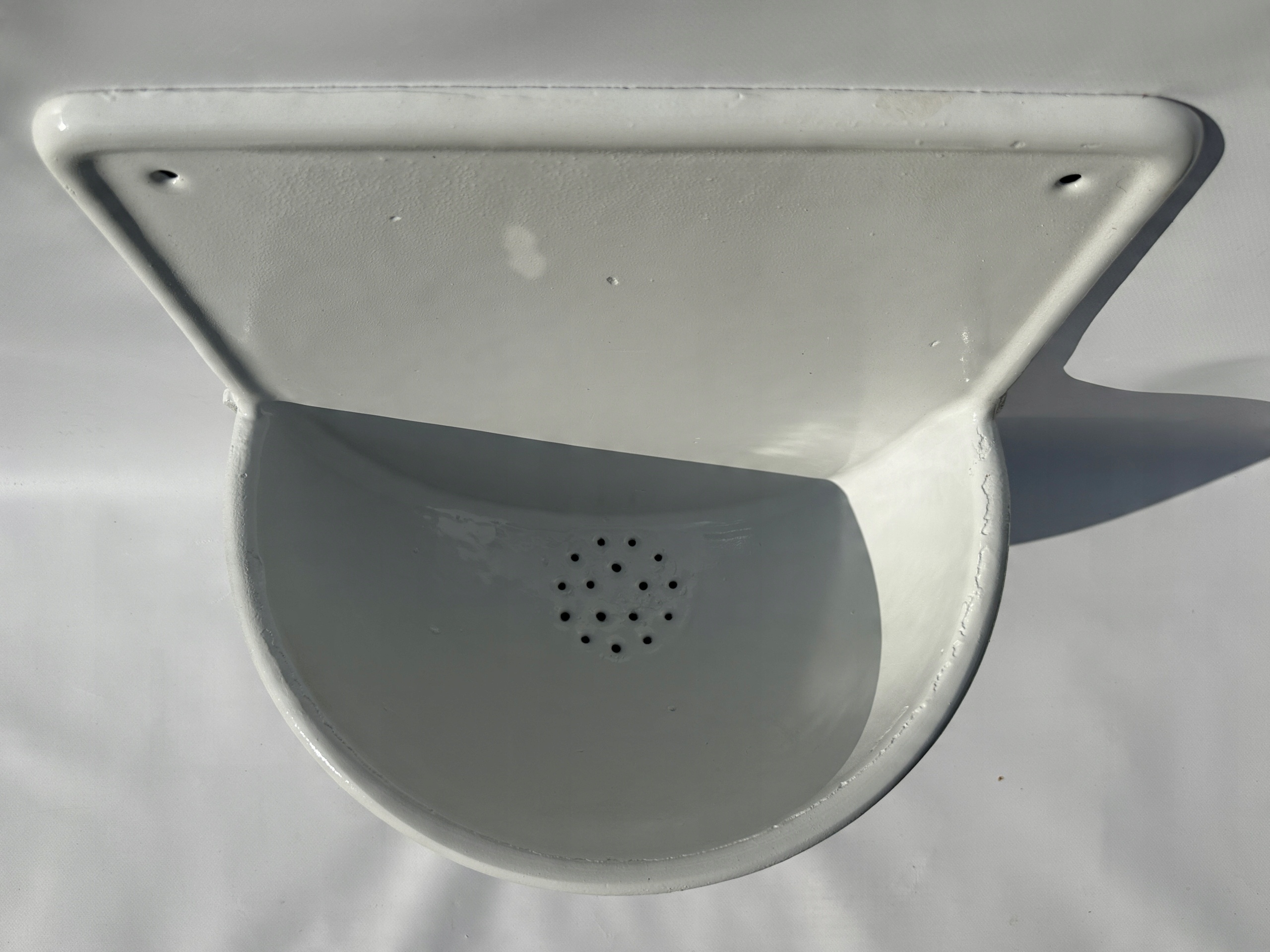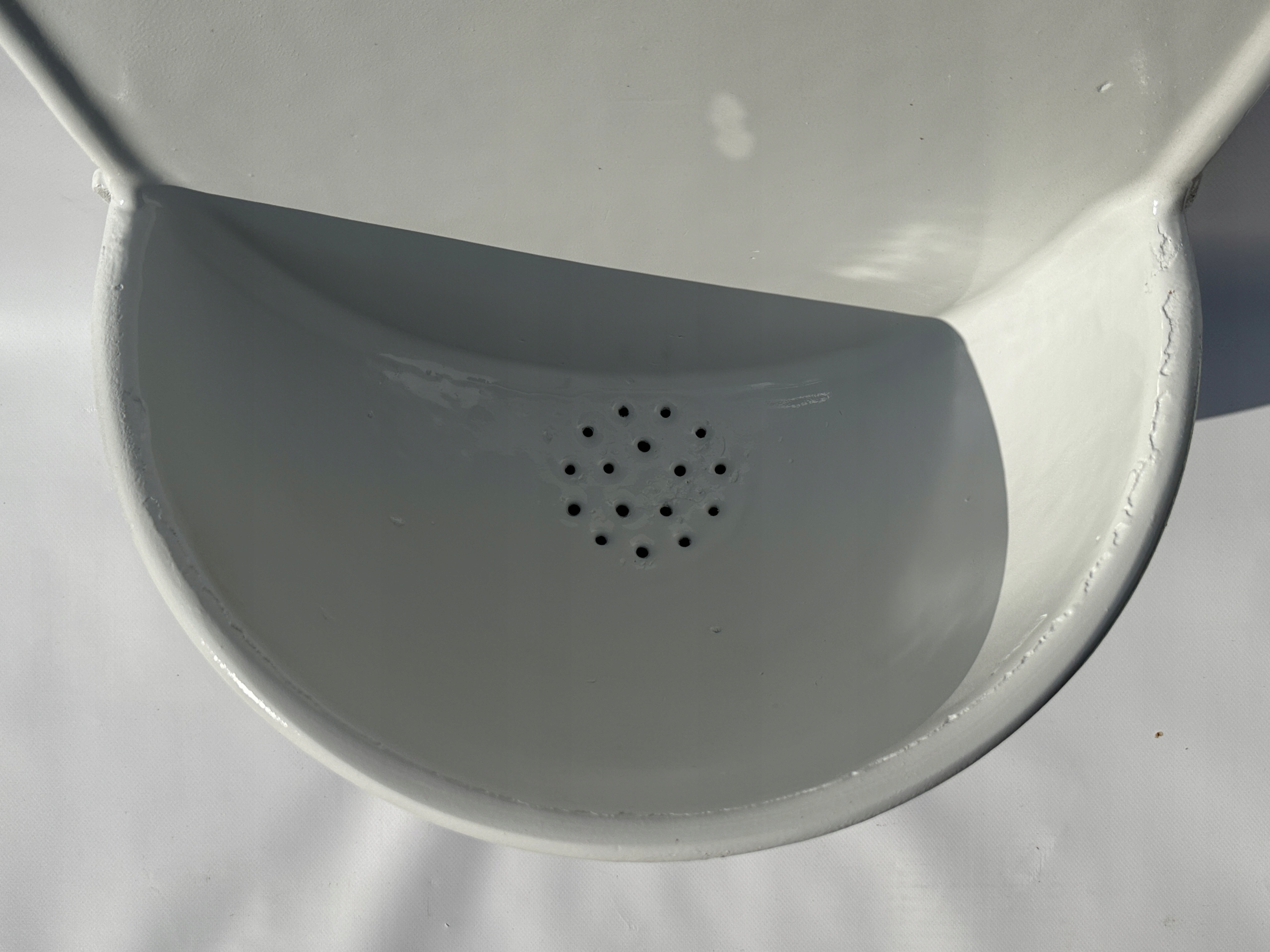 Предмет продажу стара чавунна мийка - умивальник. Дуже гарний візерунок. На звороті видно підпис KORONA 4n і 353 XI 9. Раковина ціла, не тріснута. Сито також неушкоджене. Має 4 оригінальних отвори для підвішування. Можна також використовувати як підвісну підставку для квітів.