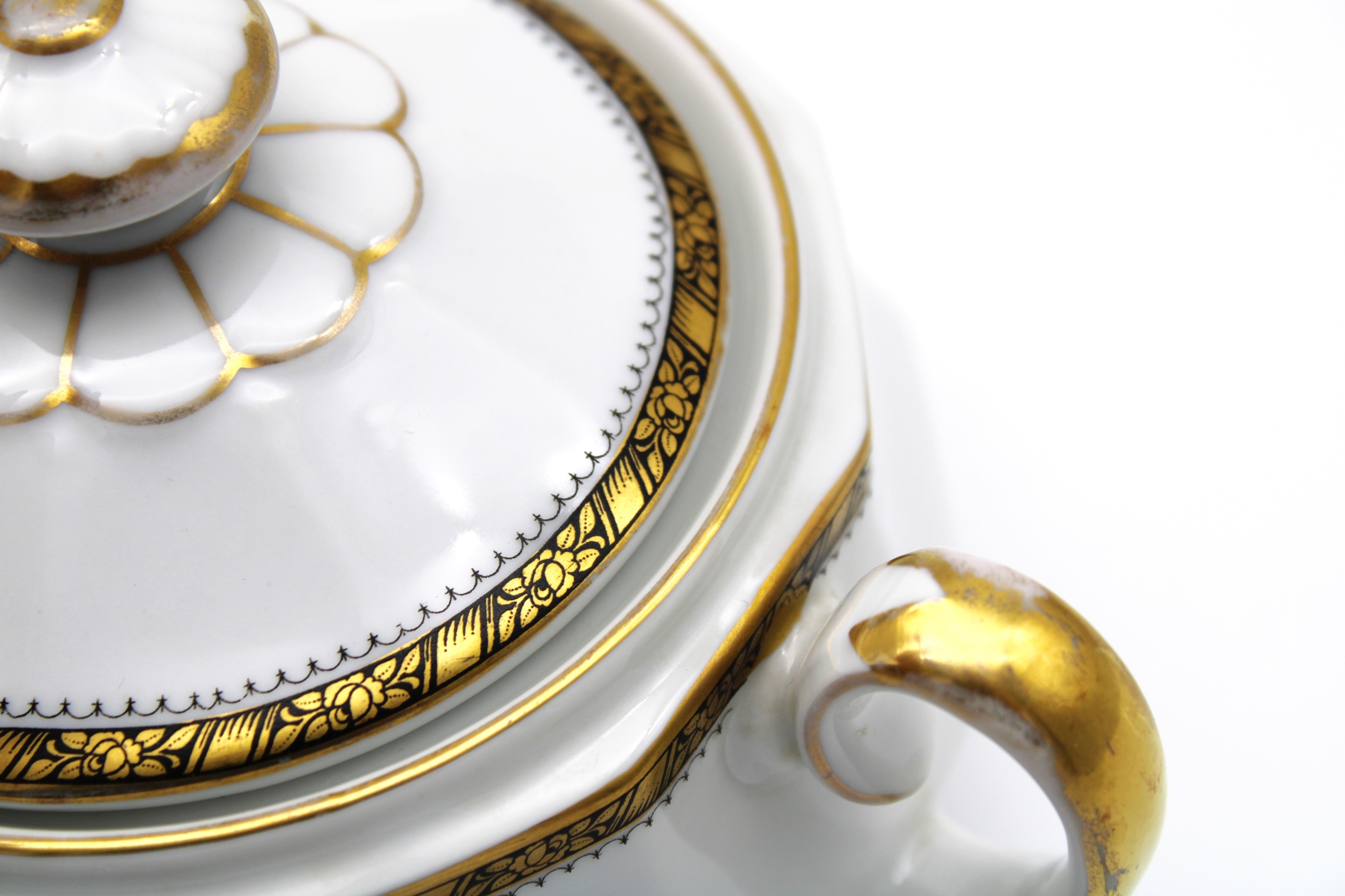 Рекомендую стару цукорницю з порцелянової фабрики у Фрайройті (Саксонія), прикрашену вручну, виготовлену з міцної напівпрозорої порцеляни ** стан такий, як на дуже хорошому скануванні, має лише природні тимчасові потертості на позолоті