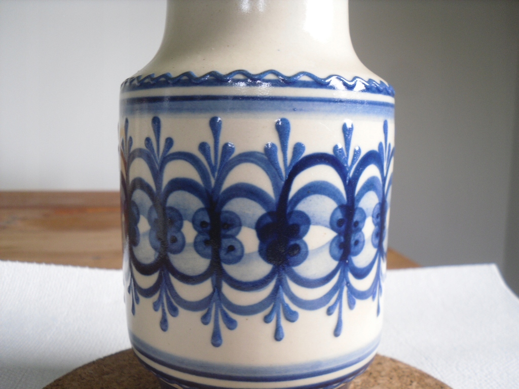 Привіт. На своїх аукціонах я зазвичай пропоную вам речі періоду Польської Народної Республіки. На цьому аукціоні я пропоную гарну керамічну вазу, розписану вручну синьо-білими кольорами, фактура відчувається під пальцями. Ваза з цікавою формою і дуже цікавим малюнком. Ваза ціла, без тріщин та пошкоджень. Незначна зміна кольору всередині, тиснений цифровий підпис. /видно на фотографіях/