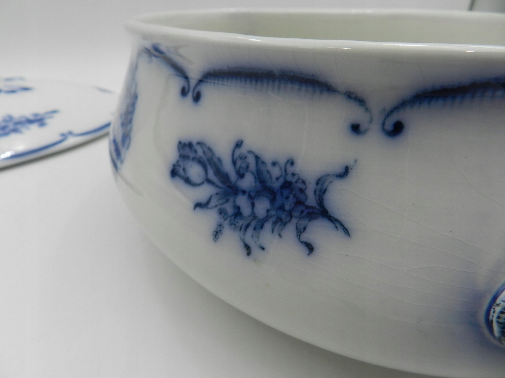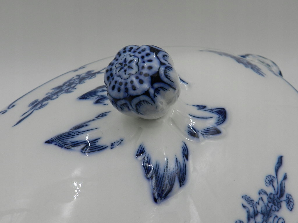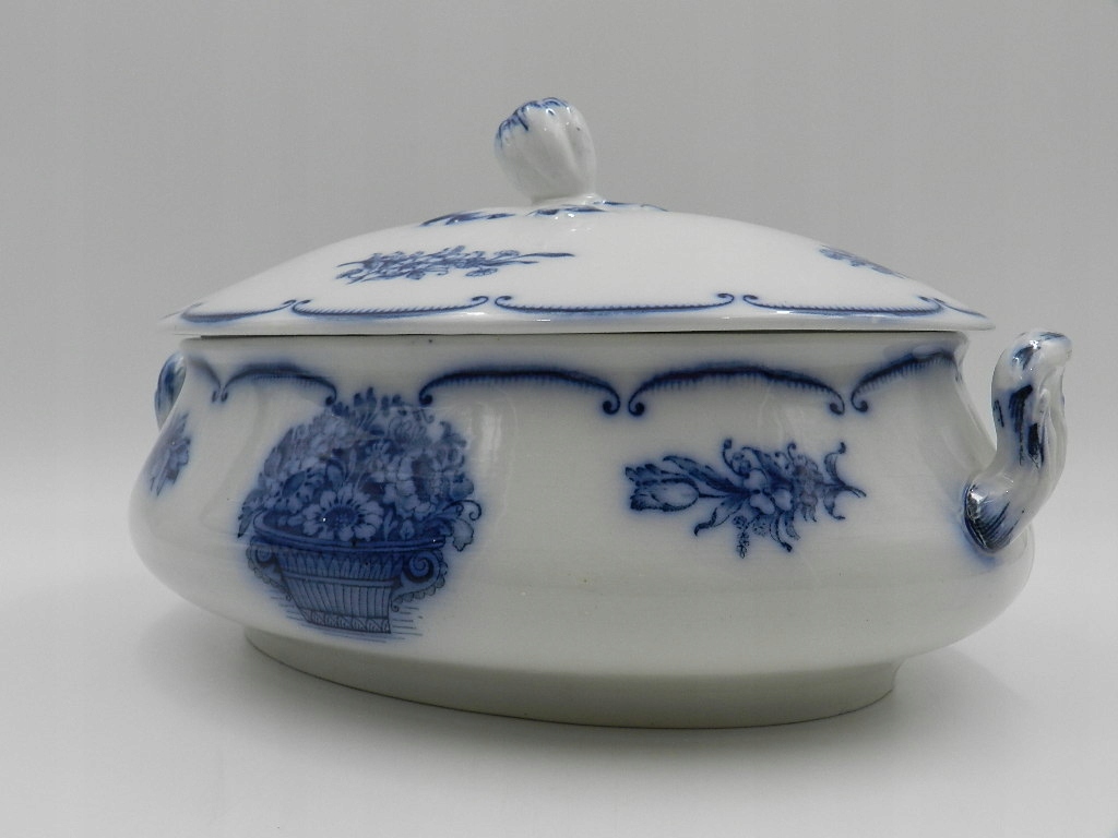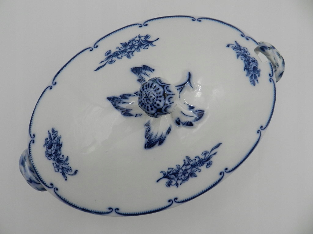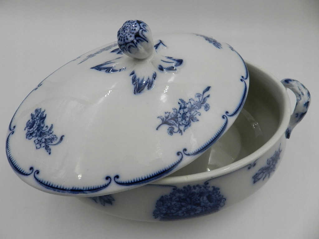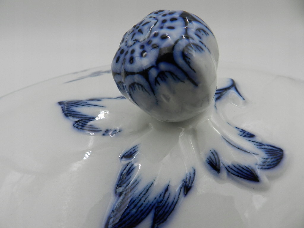 Біла порцеляна щедро декорована кобальтово-блакитними мотивами у вигляді складних квіткових композицій і ніжних смуг.