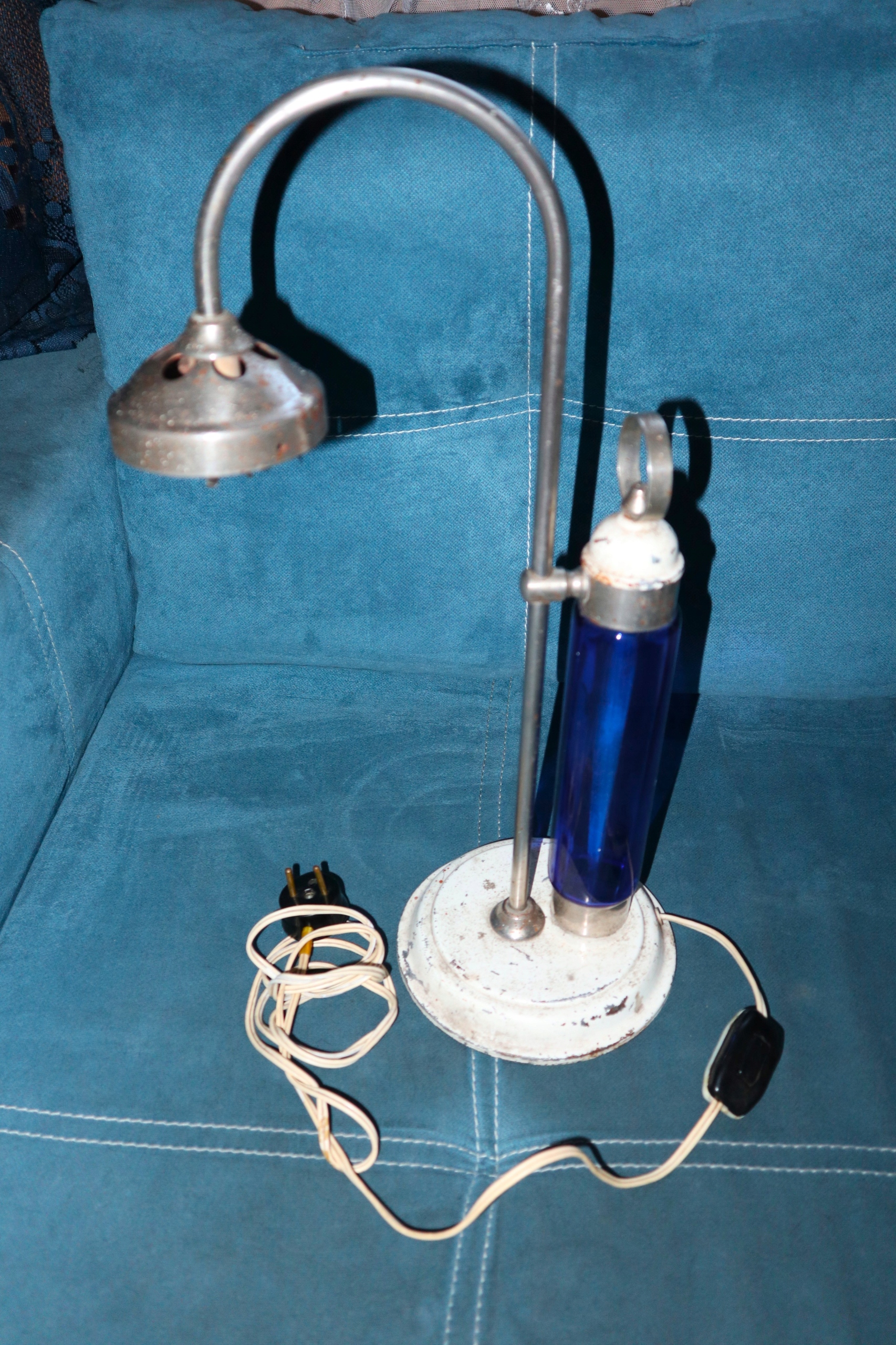 ГАРНИЙ СТАРИЙ ЛАМПА З ТЕМНО-СИНІМ СКЛОМ ДЕКОРАТИВНЕ СКЛО ЗБОКУ, ПІСЛЯ ВІДКРИТАННЯ ВЕРХНЬОЇ ЧАСТИНИ З КРУГЛОЮ РУЧКОЮ МОЖНА ЗНЯТИ СКЛЯНУ ВСТАВКУ, ЗАГАЛЬНА ВИСОТА ЛАМПИ 46 см, ДЕКОРАТИВНЕ СКЛО НЕ ПОШКОДЖЕНО!! ВИСОТА 18см. Я ПОКАЗАВ СТАН ЛАМПИ НА ФОТО, І ВИ БАЧИТЕ, ЩО ВІДСУТНИЙ НИЖНИЙ ТРИМАЧ - ПІСЛЯ ПРИКРУЧЕННЯ ВІДСУТНЬОЇ ПОЛОВИНИ ЛАМПА БУДЕ ПРАЦЮВАТИ. ВДАЧИХ ЦІНОК