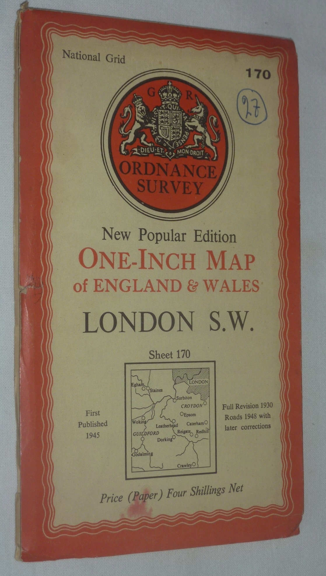 Stara mapa Londynu S-W, jednocalowa, Ordnance Survey, nr 170, 1945 rok.