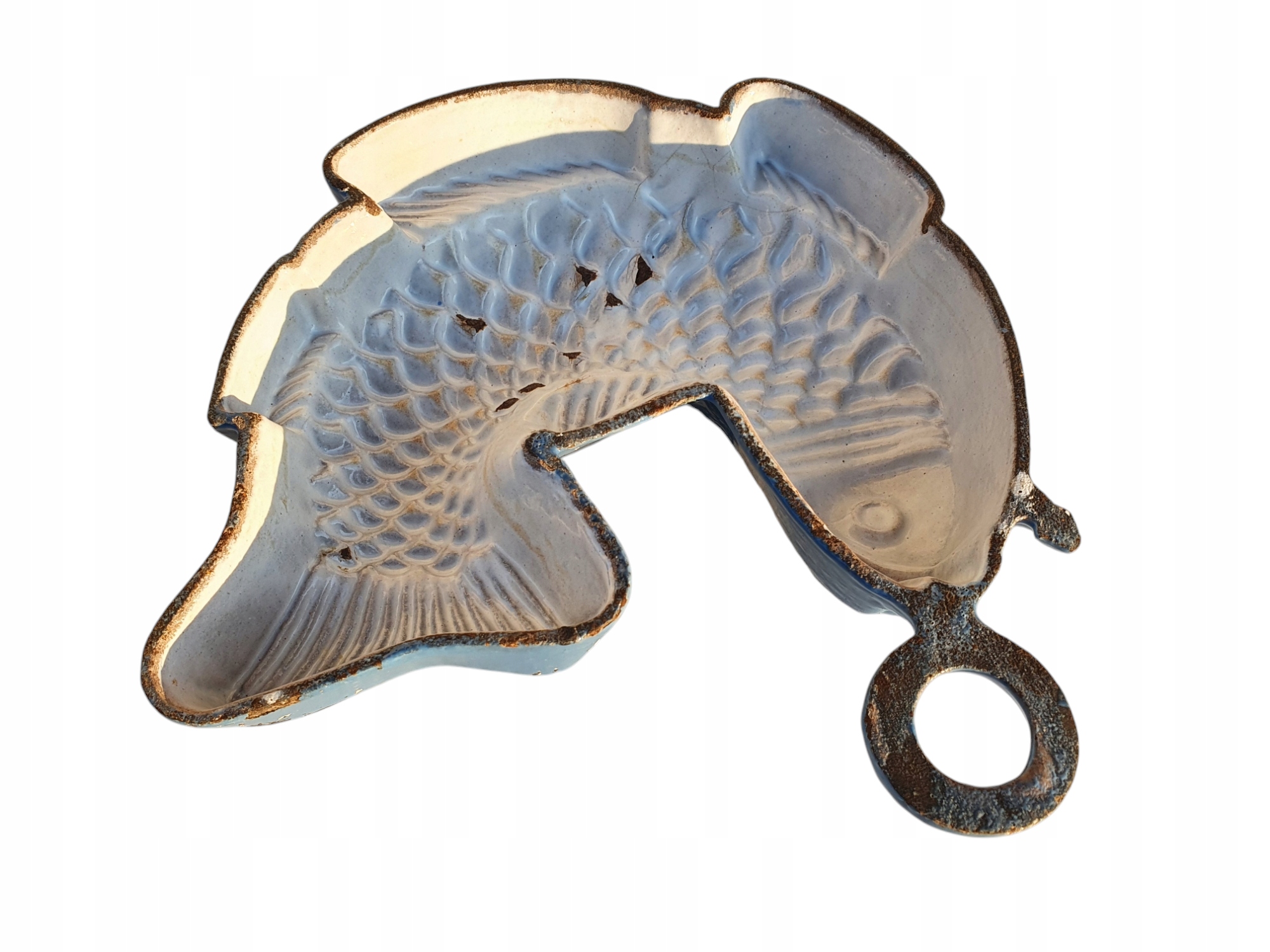 Стара металева форма для тортів у формі риби, з 1950-х років, ймовірно, вироблявся в Чехословаччині. Це надзвичайно оригінальний і рідкісний виріб, виготовлений з цільного металу, що забезпечує довговічність і міцність. Форма відрізняється унікальним дизайном - детальне відтворення луски, плавників і характерної форми риби свідчить про високу точність виготовлення.