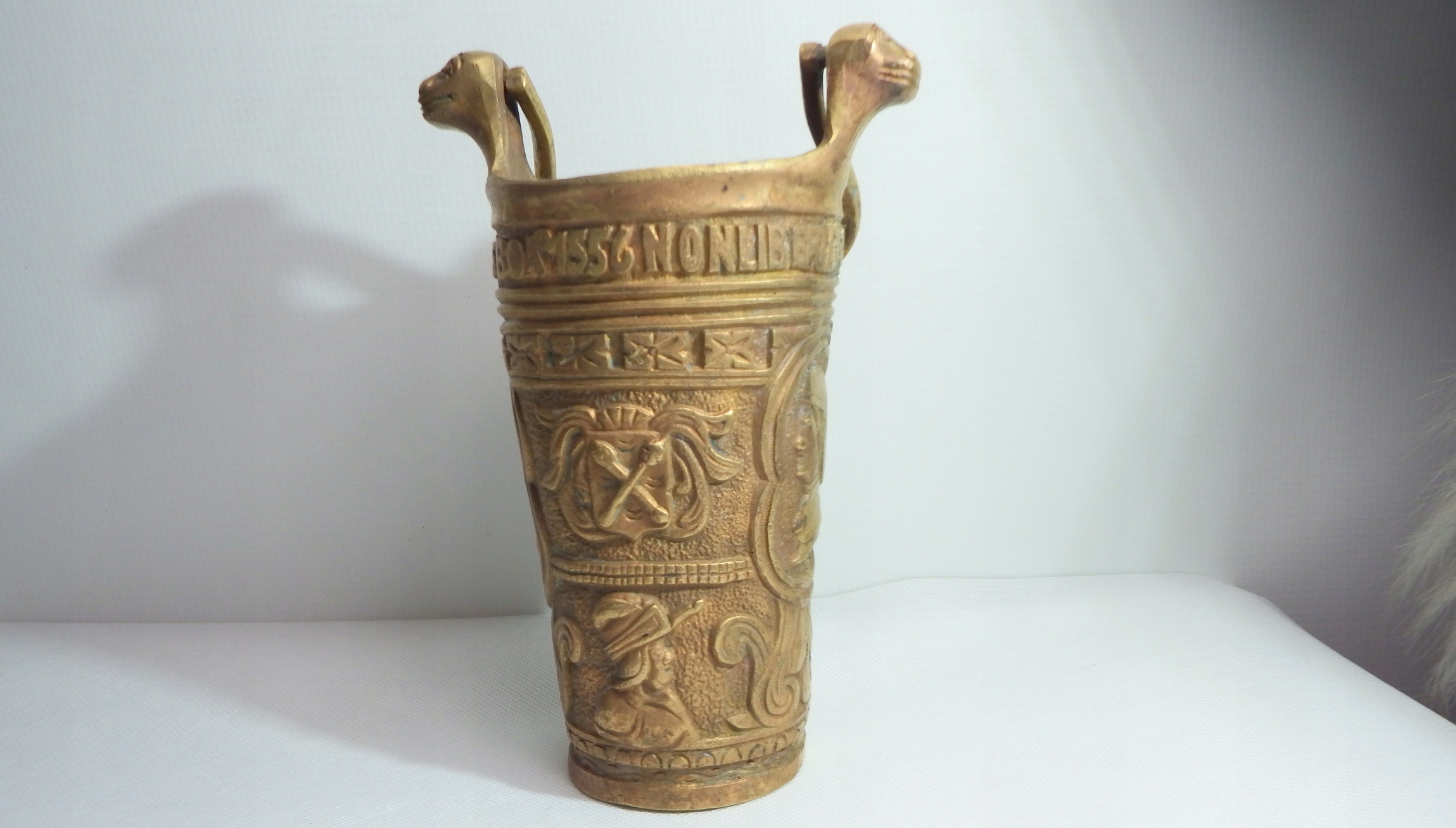 Старий контейнер для латуні святої води 1,6 кг висоти ручки 21 см, напис у верхній частині Джоанеса Бервольвса BOA 1556 Nonlibertat - це Princeps. Стен видимий на знімках, щоб очистити. Запропонуйте фотографії з галереї, я запрошую вас на інший аукціон