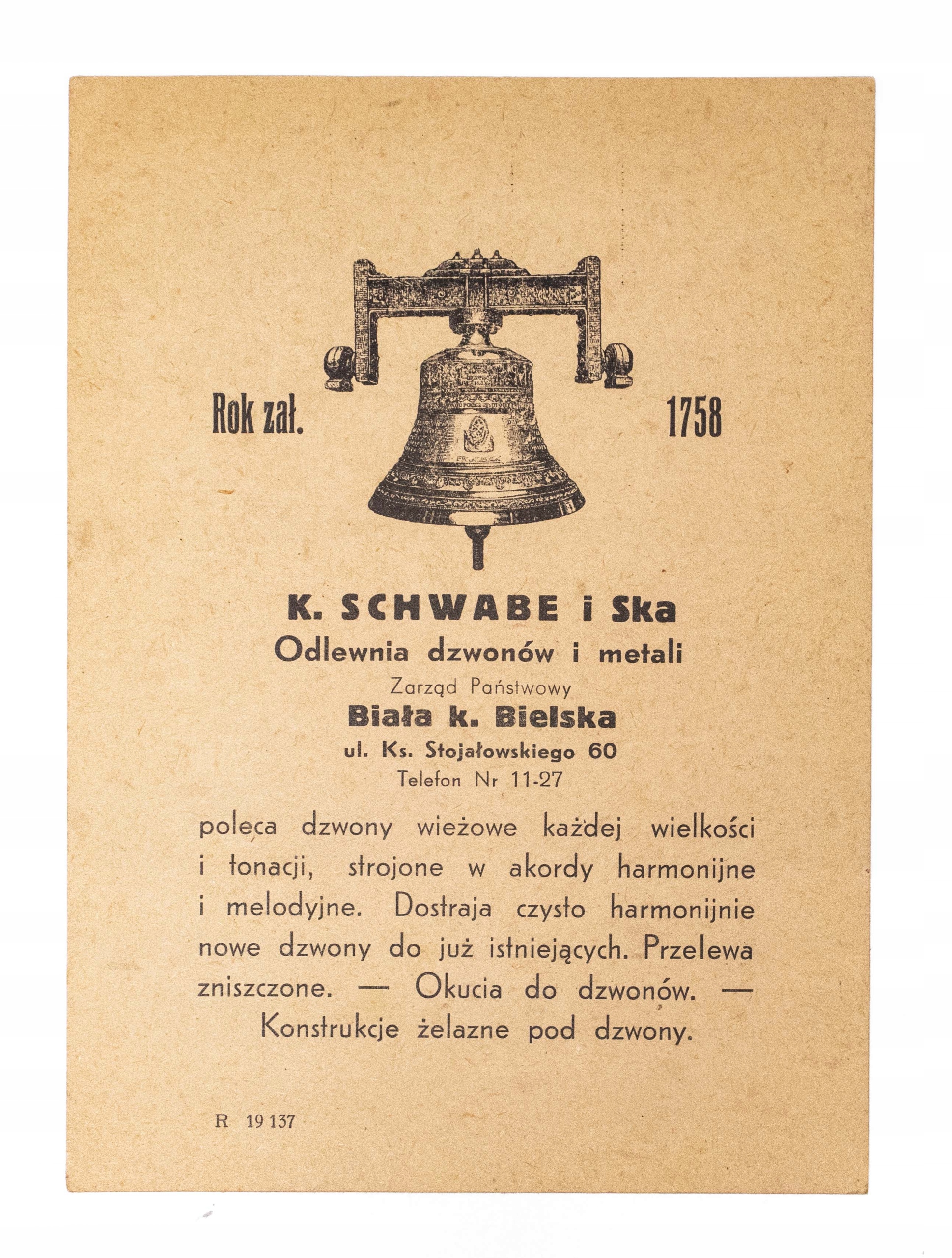 СТАРА РЕКЛАМА - K. SCHWABE I SKA, ДЗВОНОЛИВНИЙ ТА МЕТАЛЛИВНИЙ ЗАВОД, BIAŁA K. BIELSKA