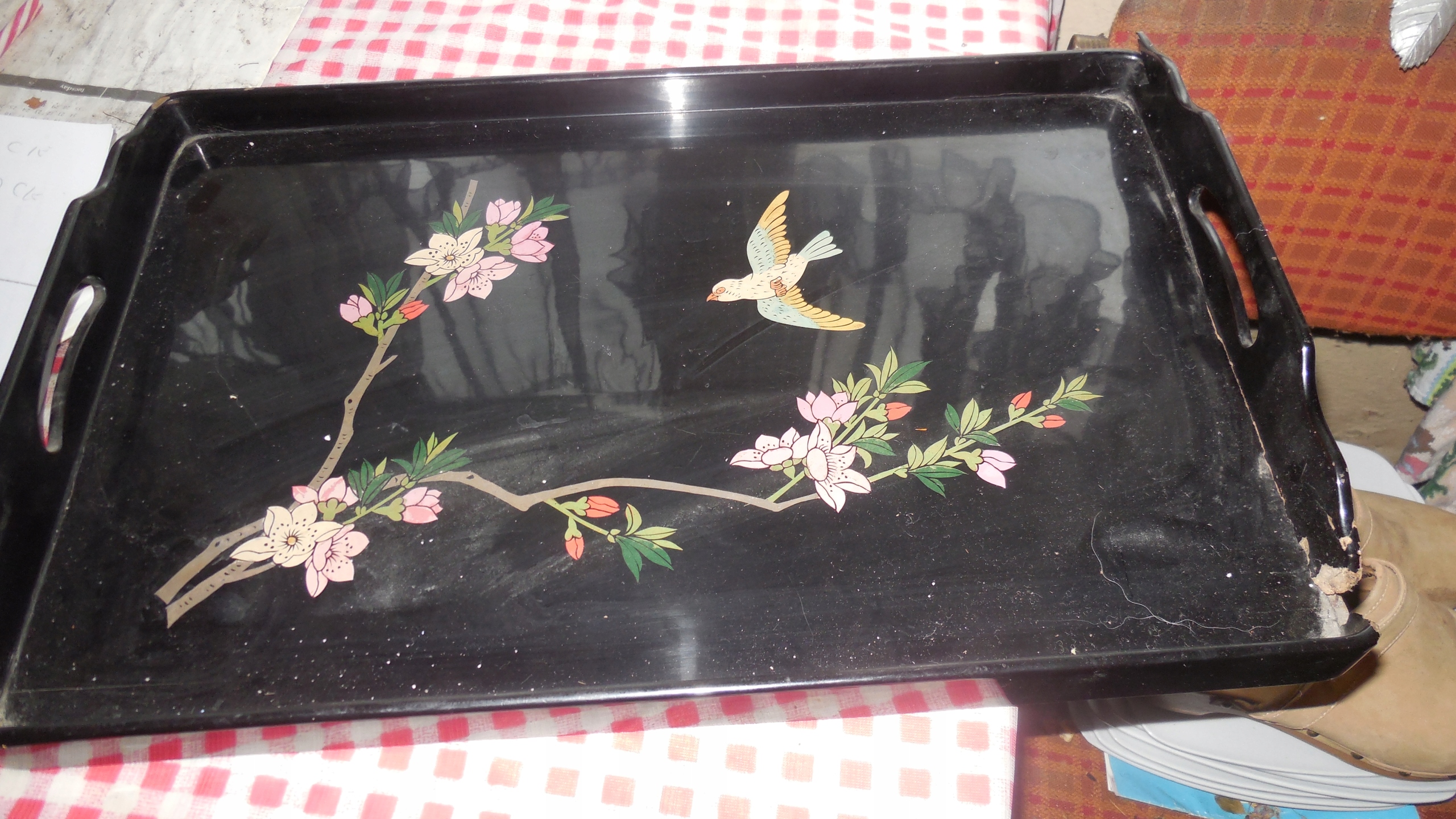 Продам піднос старий лаковий але пошкоджений як на фото дл47 ширина 31 треба один куточок заклеїти може хто полагодить