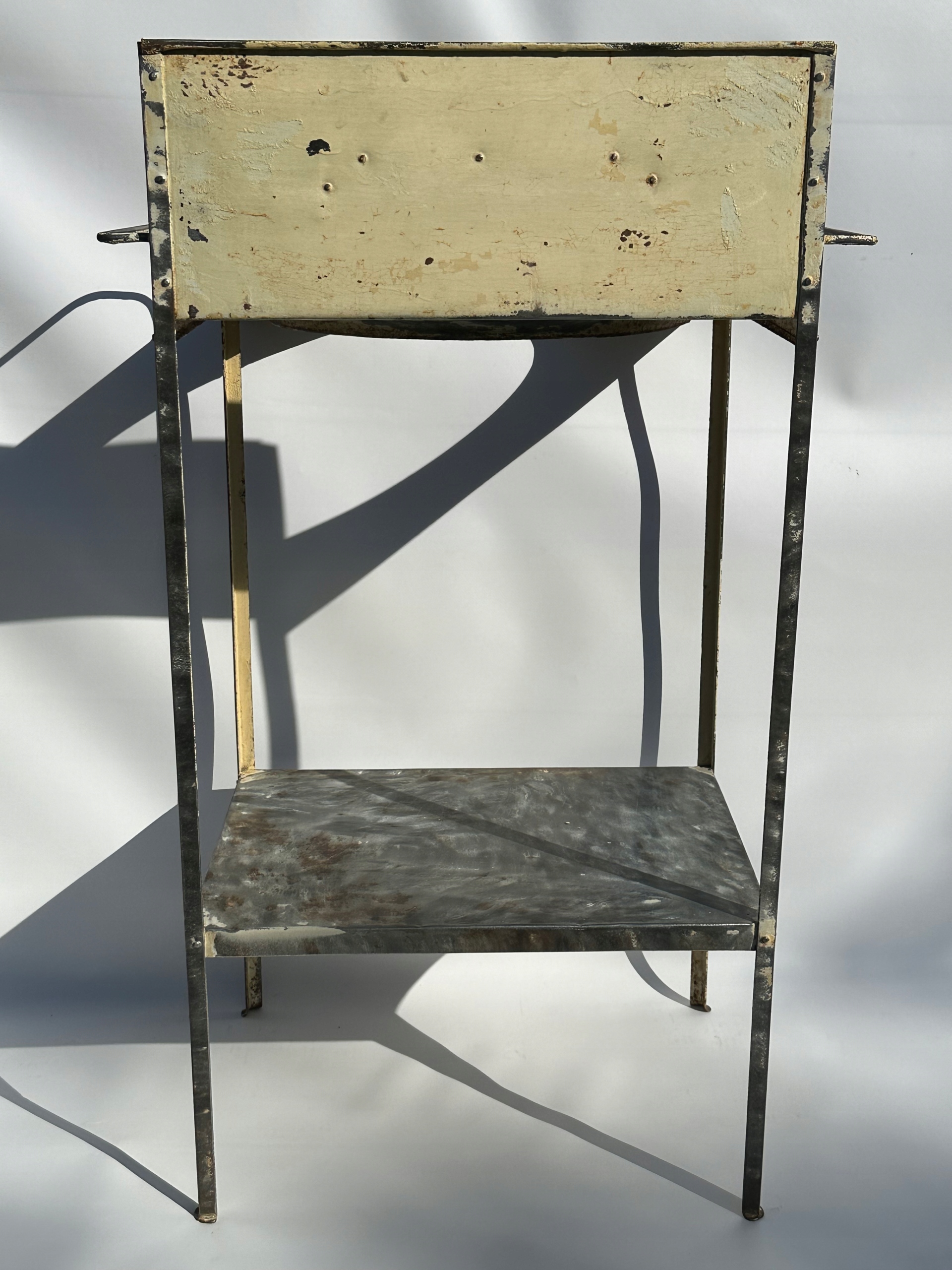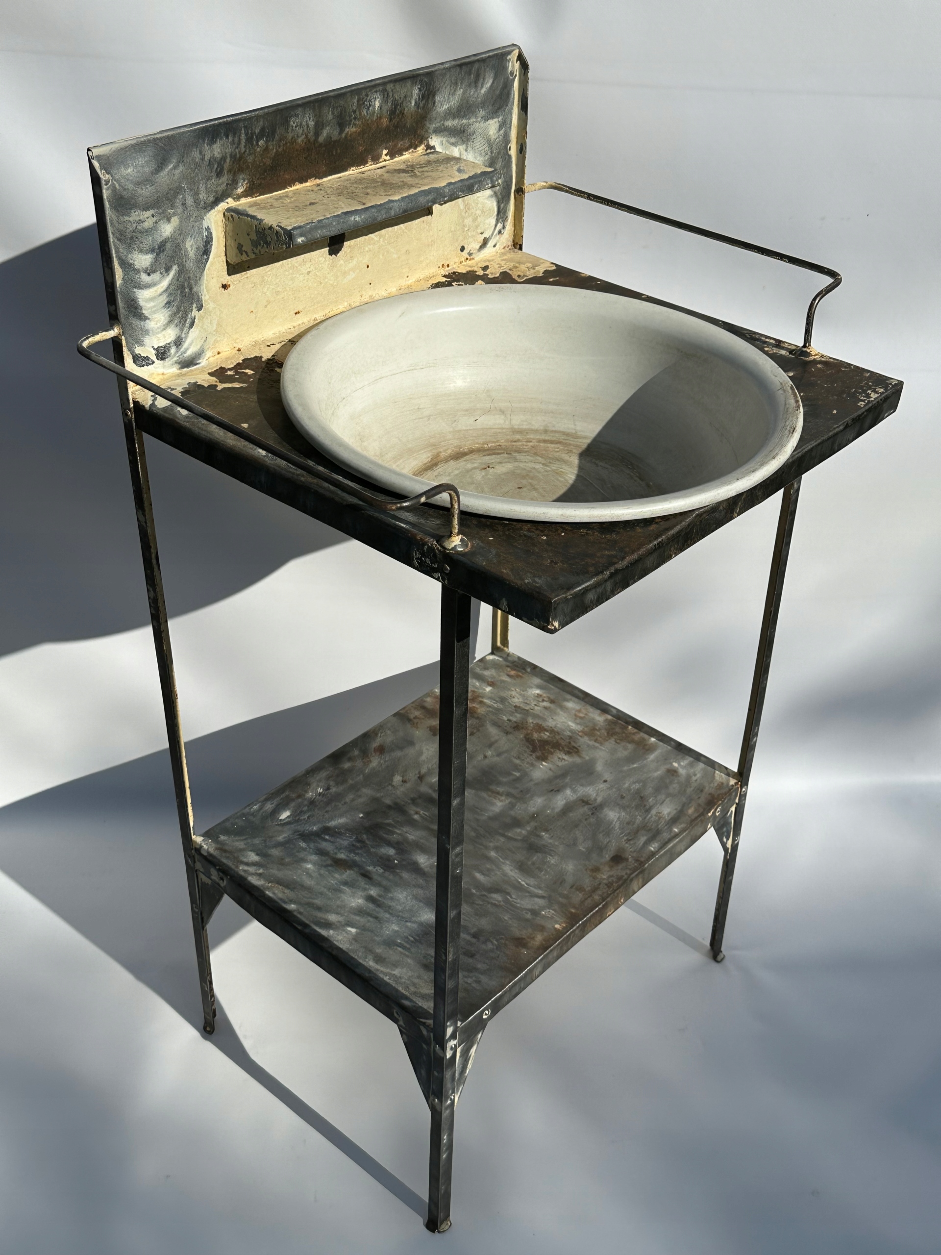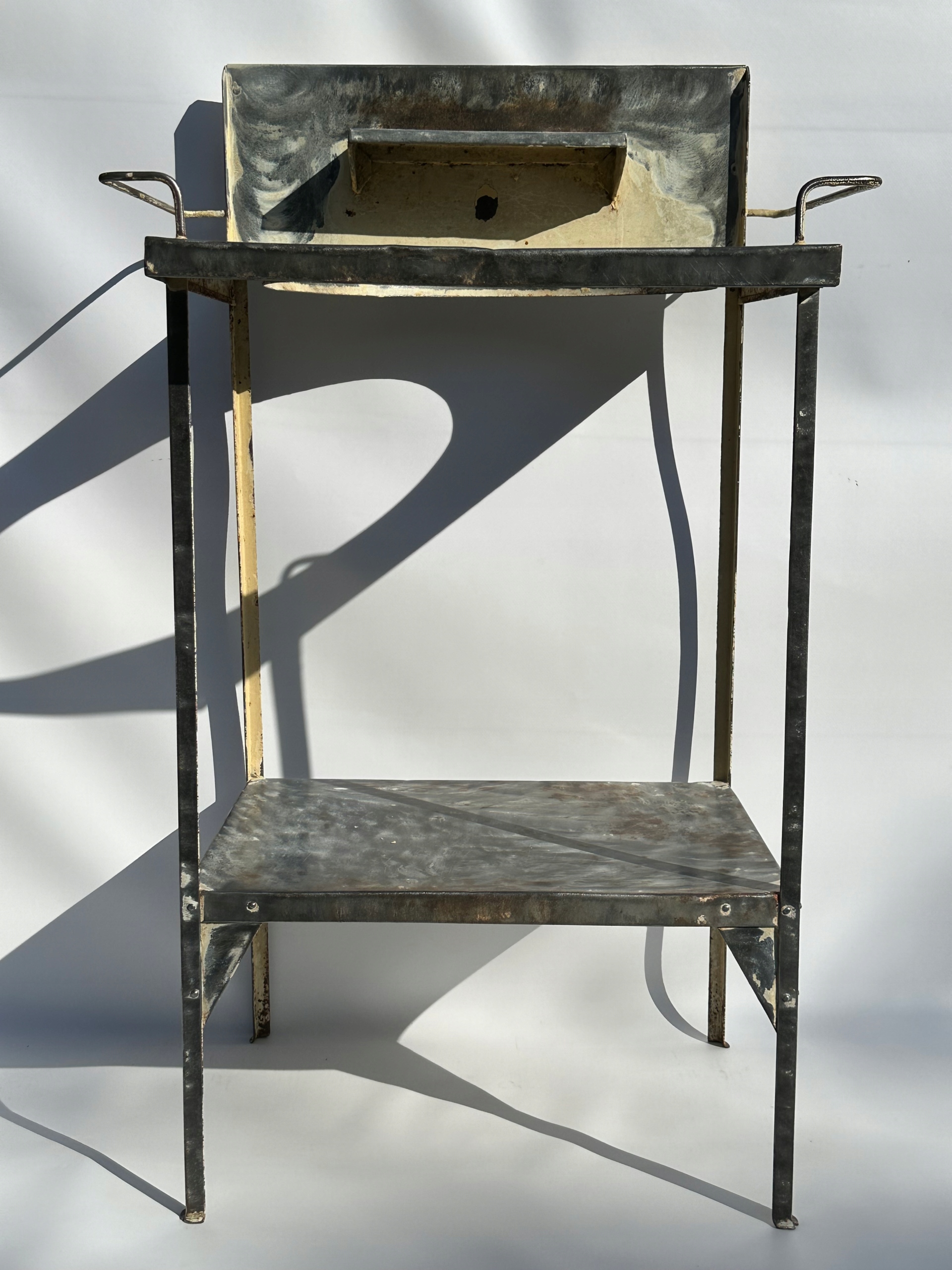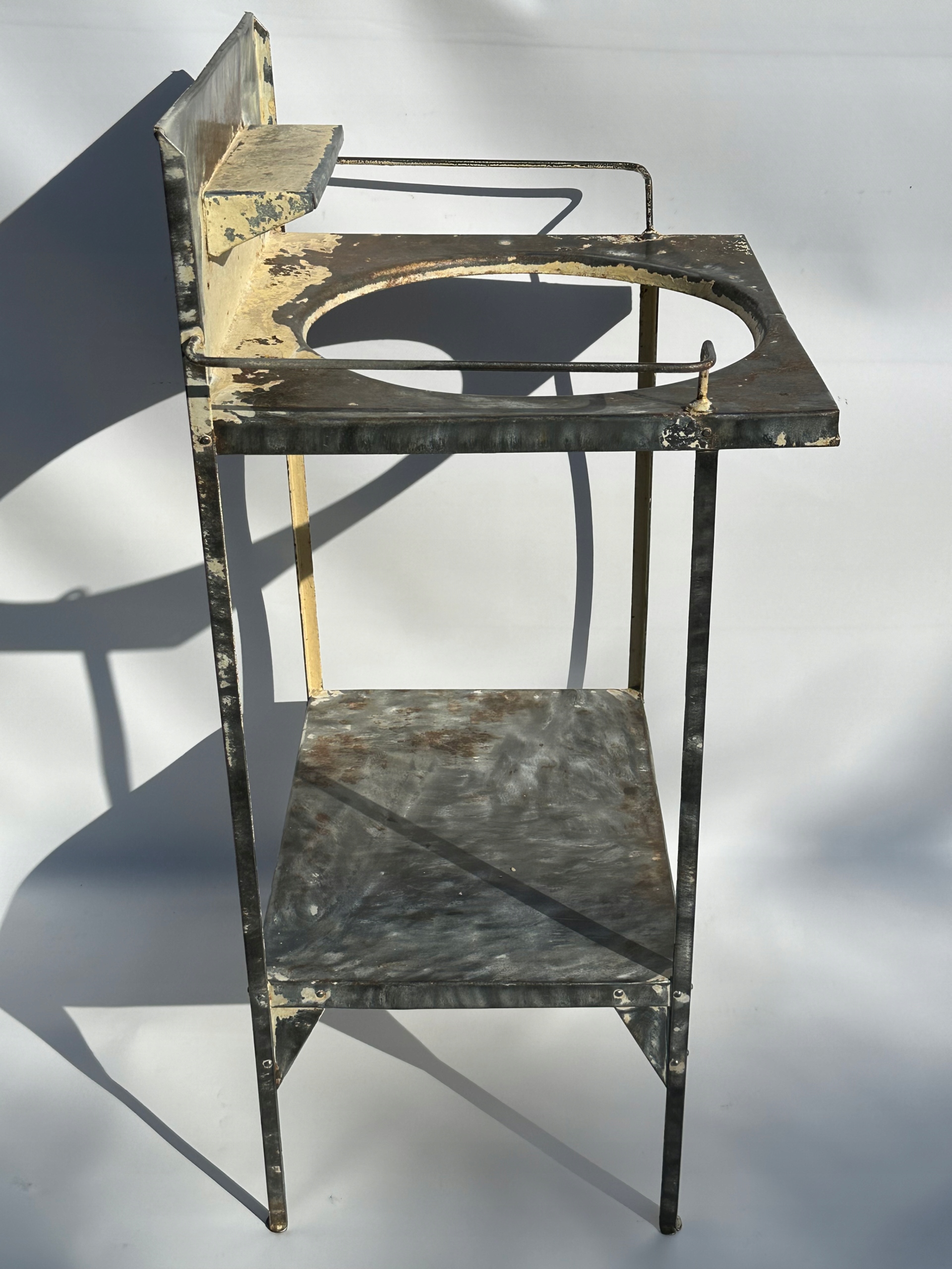 Предмет продажу старий туалетний столик та умивальник. Дуже гарний дизайн з тримачами для рушників, поличкою і оригінальним отвором для миски. Повністю виготовлений з металу.