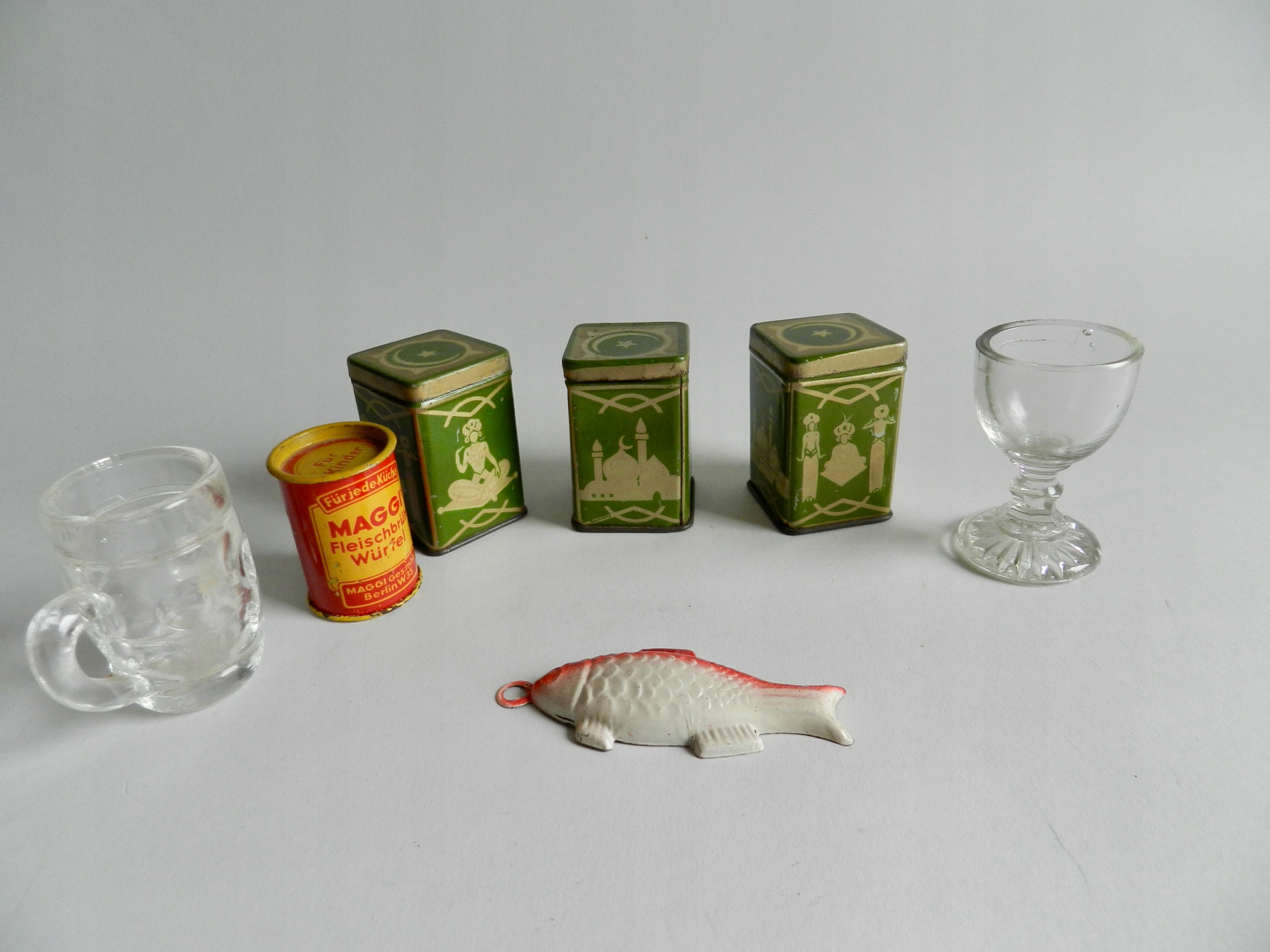 Склянка, склянка, три банки для чаю, одна банка Maggi та мініатюрна форма для запікання у формі рибки. .