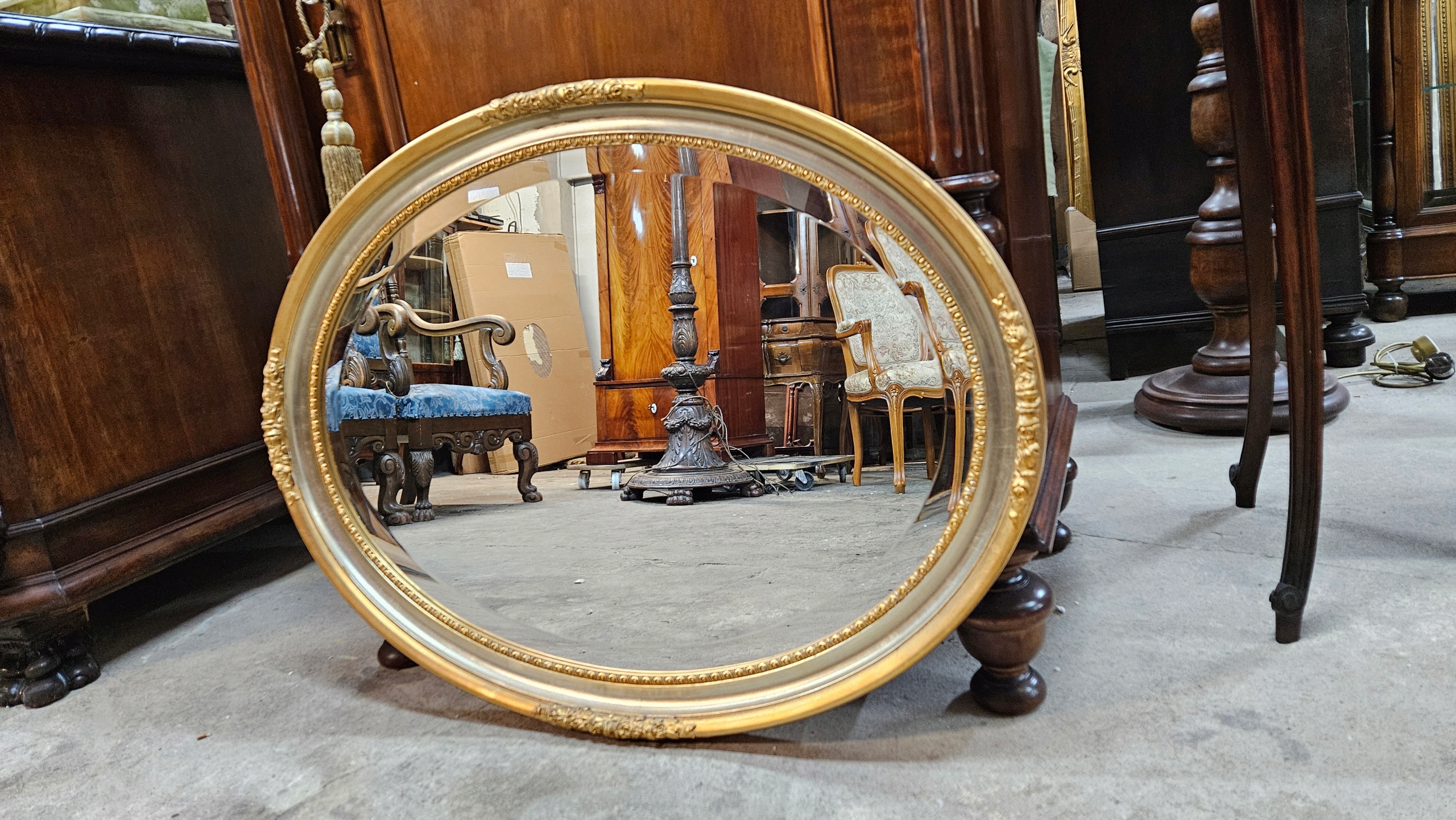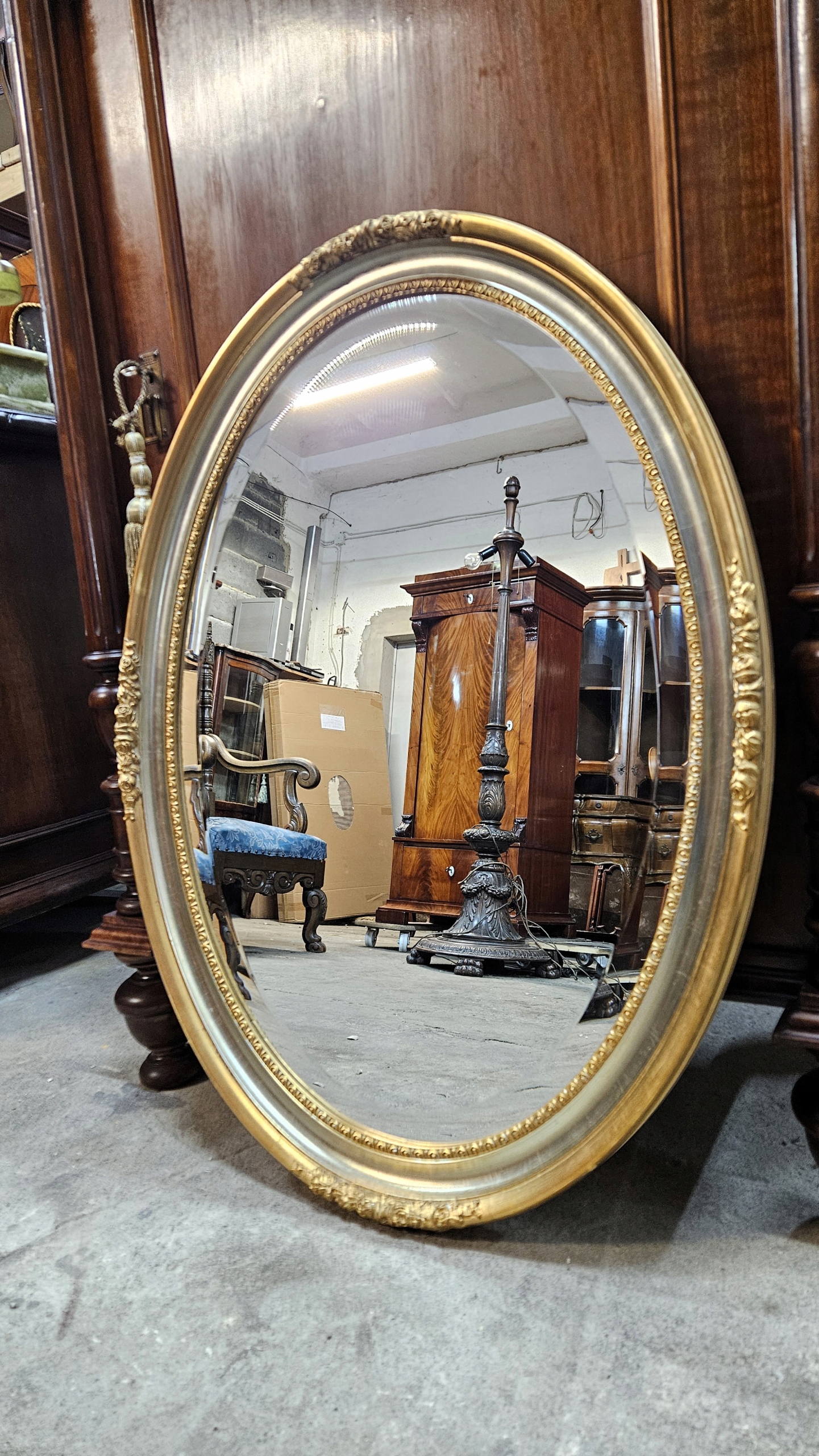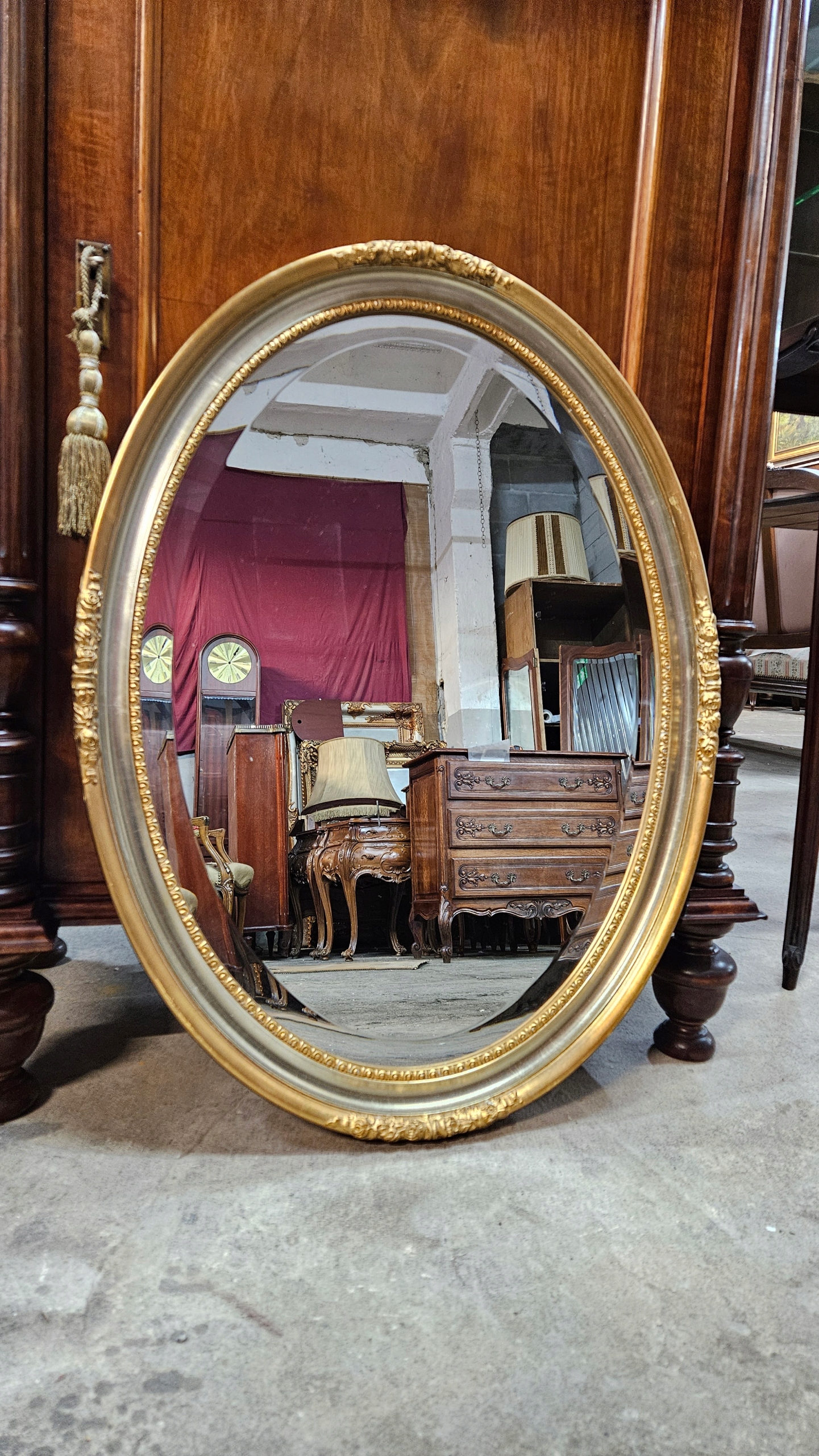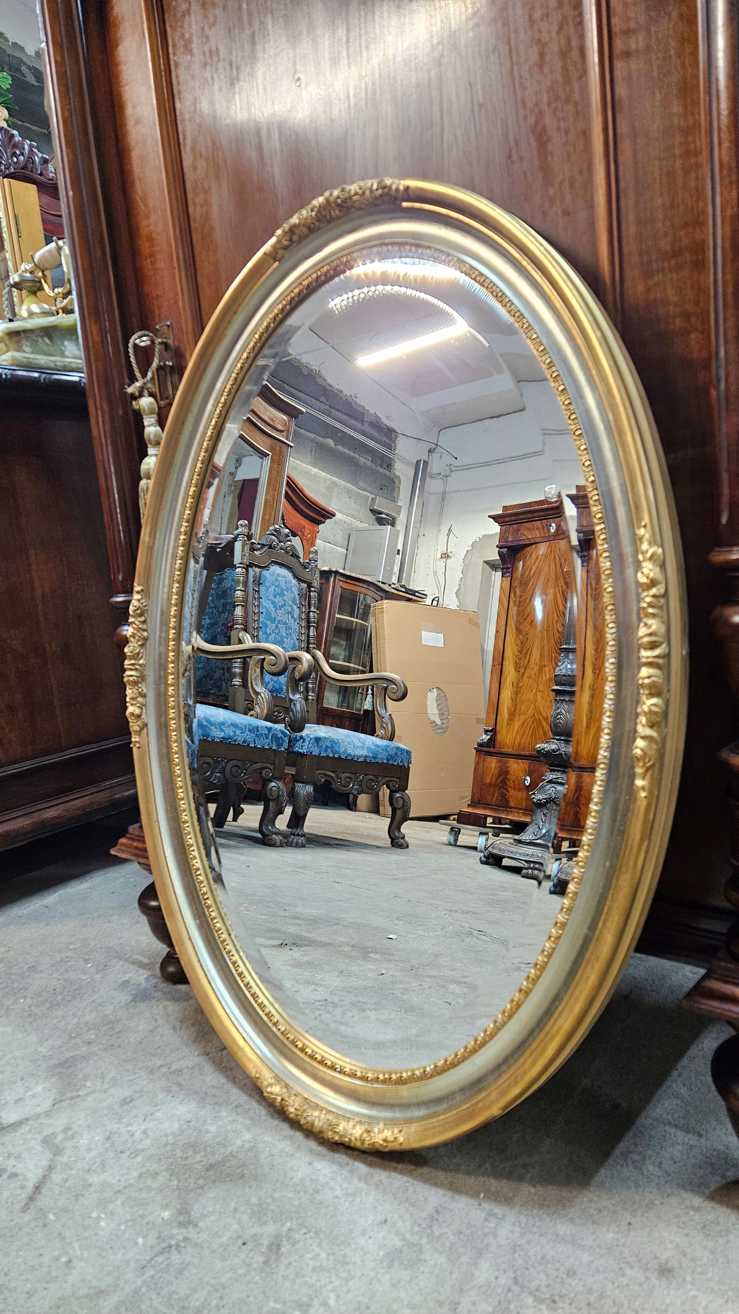 Старе красиве дзеркало з різьбленою овальною рамою