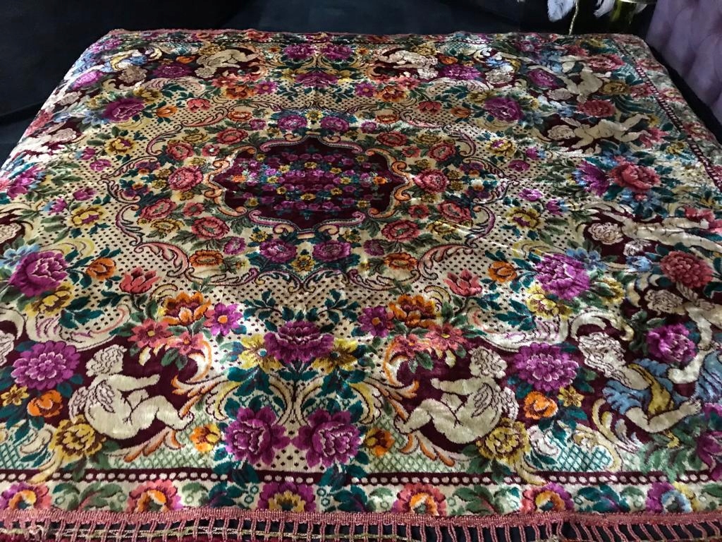 Предметом аукціону є дуже оригінальне, дуже старе покривало/покривало, привезене з Іспанії. Гобелен, оксамитове покривало 1940-х років, воно старе, але в дуже хорошому стані - практично не використовувалося. З плином часу дефекти видно лише на окантовці бахроми - однак цей невеликий дефект можна виправити, і ви все ще можете насолоджуватися прекрасним зовнішнім виглядом покривала. Крім того, поверхня товстого гобелену в дуже хорошому стані, без будь-яких плям і дефектів. Наше чудове покривало прикрашене чудовими картинами, повними різноманітних кольорів. Кожна частина ковдри представляє певний образ - історію за участю маленьких янголят. У центральній частині виробу розташована чудова овальна розетка, що радує райдугою кольорів. Предмет може мати різне призначення, його можна використовувати як килим/настінну повішку. Його цікавий і неповторний зовнішній вигляд зачарує кожного. Гобелен/покривало буде використовуватися в дерев'яних будинках, ідеально підходить для сільського або стильного інтер'єру заміського будинку. Товар виглядає чудово! Я дуже раджу вам придбати цю чудову річ!!! Придбане покривало прикрасить і зігріє будь-яку кімнату, створивши неймовірну атмосферу. Ідеальний подарунок для колекціонерів мистецтва!!! Рекомендую!!