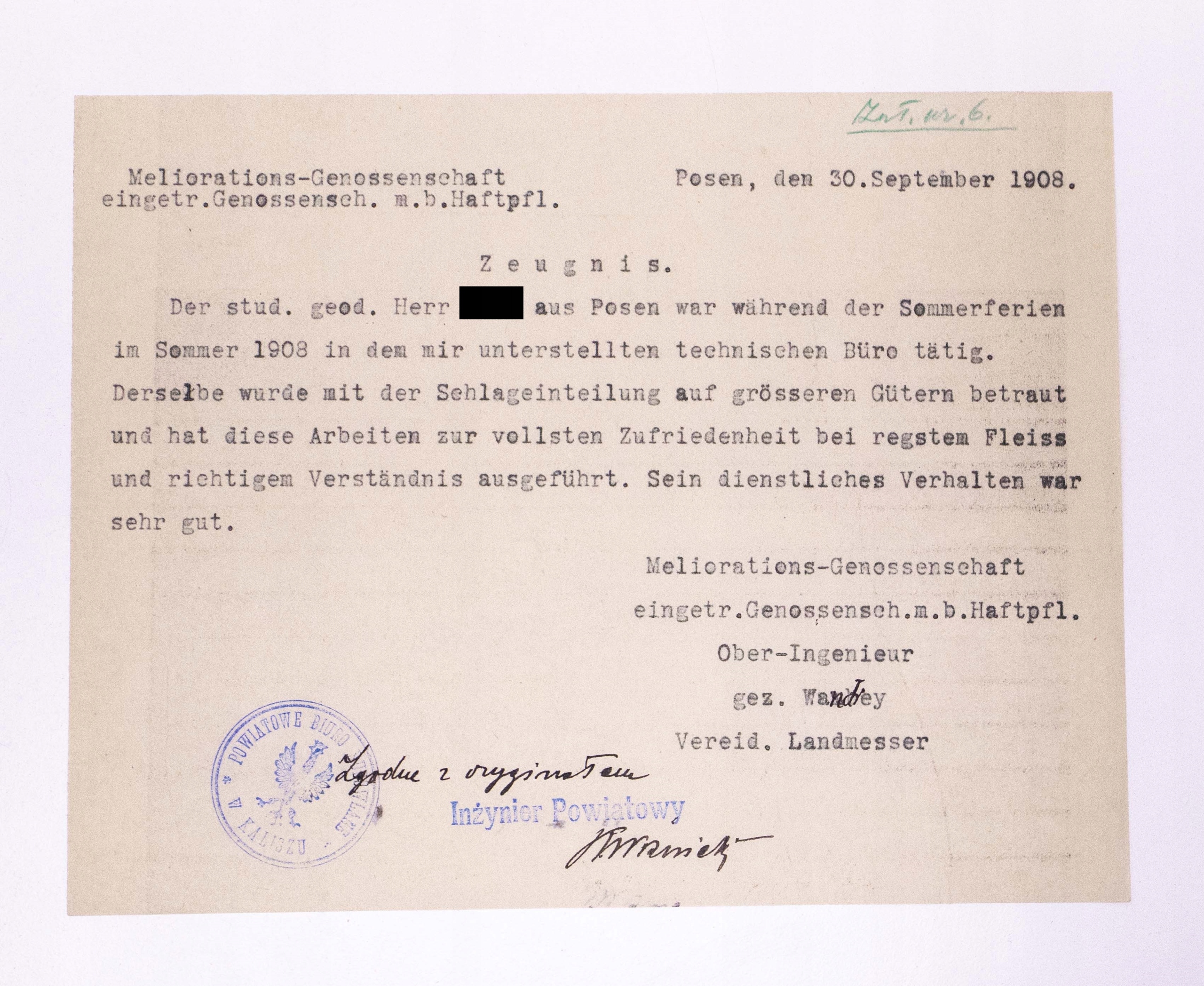 STARE PISMO - SPÓŁKA MELIORACYJNA, POŚWIADCZENIE PRACY, POZNAŃ, KALISZ 1908