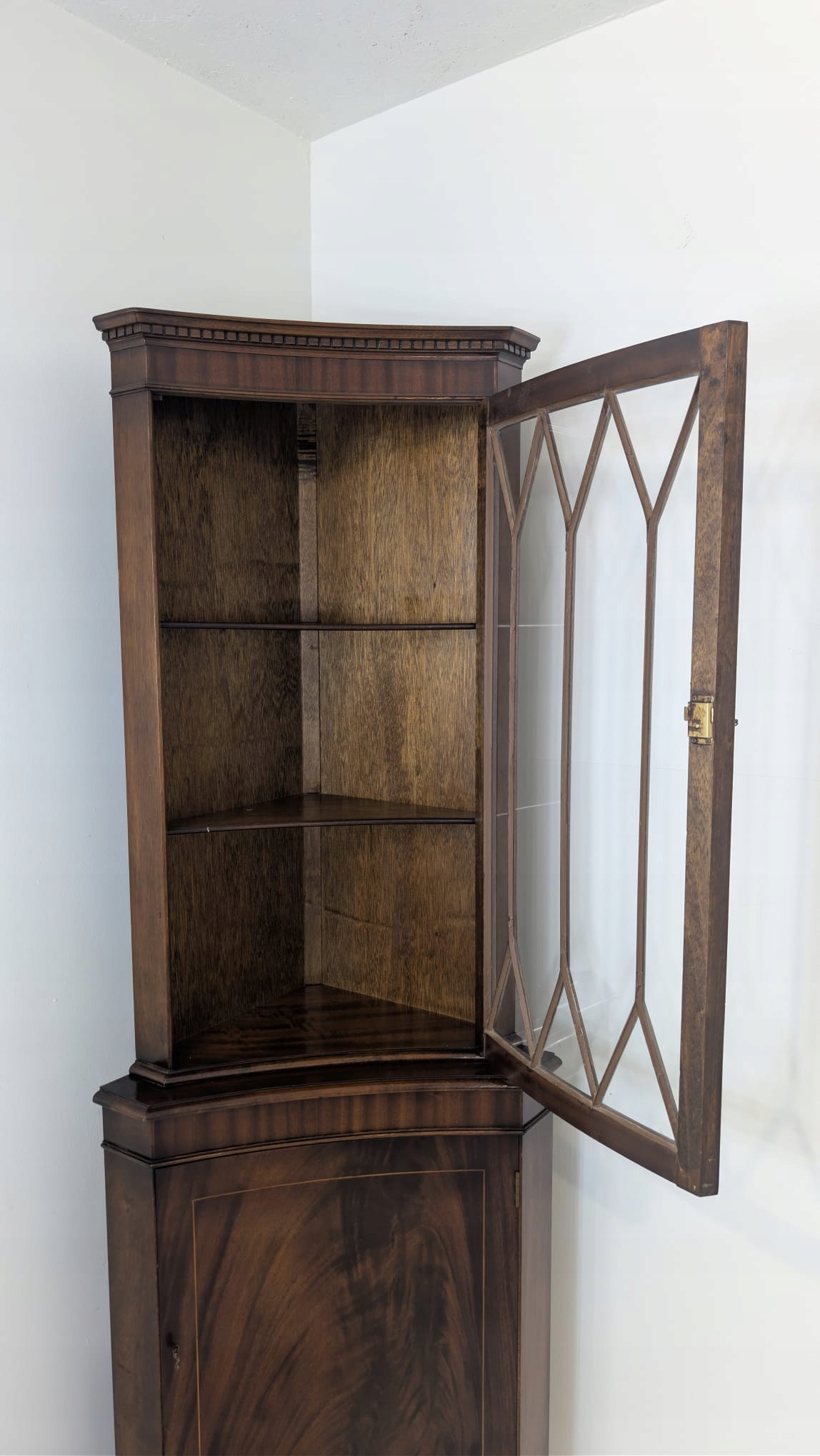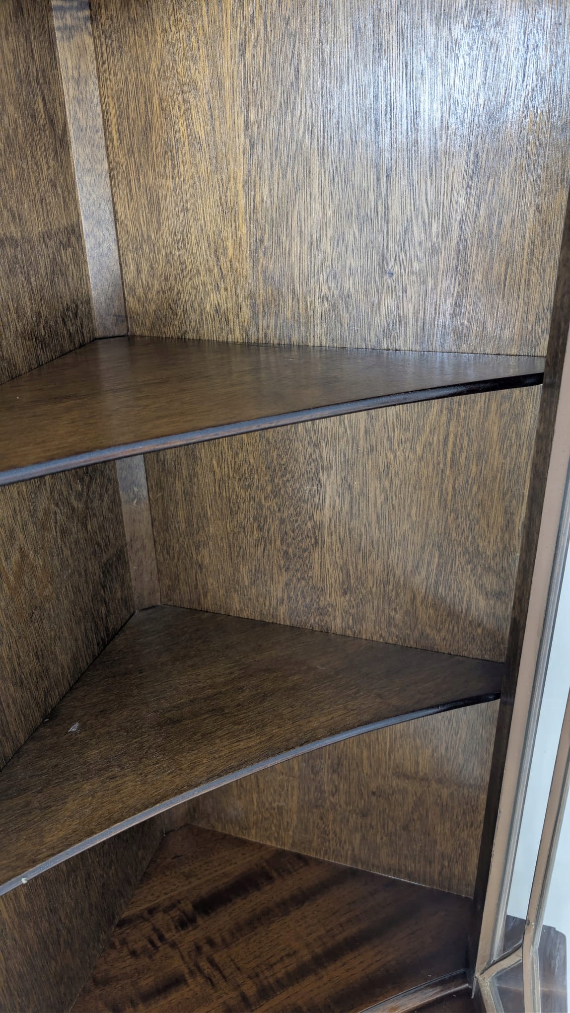 Старинна дерев'яна вітрина в григоріанському стилі. Має двері з характерним малюнком. Меблі в хорошому стані, ідеальні як прикраса або для зберігання дрібниць.