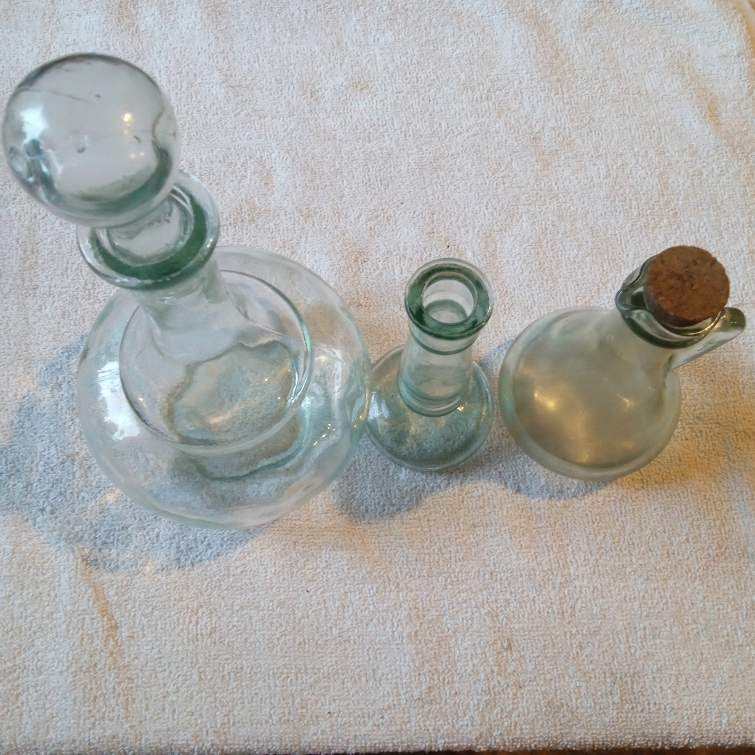Продам набір старого пресованого скла, напевно 19 ст.. В комплект входить: графин, свічник і ампула для оцту або оливкової олії. Предмети зі світло-зеленуватого пресованого скла, т. зв відтінок пляшки. Графин з пробкою, висота 27,5 см. Висота без пробки 21см. Діаметр (зверху) 4,3 / 3 / 8,5 / 13 / 7,5 см. Висота пробки 10см. Діаметр 4,4 см. Пробка всередині порожня. Графин має оптичний візерунок на черевці, що нагадує "забитий" металевий лист. Стан хороший. Над дном графина є великий волосяний дефект, довжиною приблизно 12 см. На пробці є кілька бульбашок повітря, а на внизу ковпачка є невелика чорна пляма діаметром приблизно 2 мм Підсвічник порожній центр висота 15 см Діаметр (зверху 3,4 / 2,3 / 3,6 7,2 см. Отвір для свічки 2 см. Добре стан, трохи повітряних бульбашок в масі.Ампула з ручкою, закрита звичайною пробкою (не знаю чи оригінальна, але припасована і стара).Висота 15,5 см. Діаметр (зверху) 3,5 / 3 / 9 / 7,5 см. Досить хороший стан.Мабуть чимось грубим вимито,щоб зняти оливкову олію,бо зверху дуже багато дрібних подряпин,наче в жорсткій посудомийній машині.Ціна вказана за весь набір.
