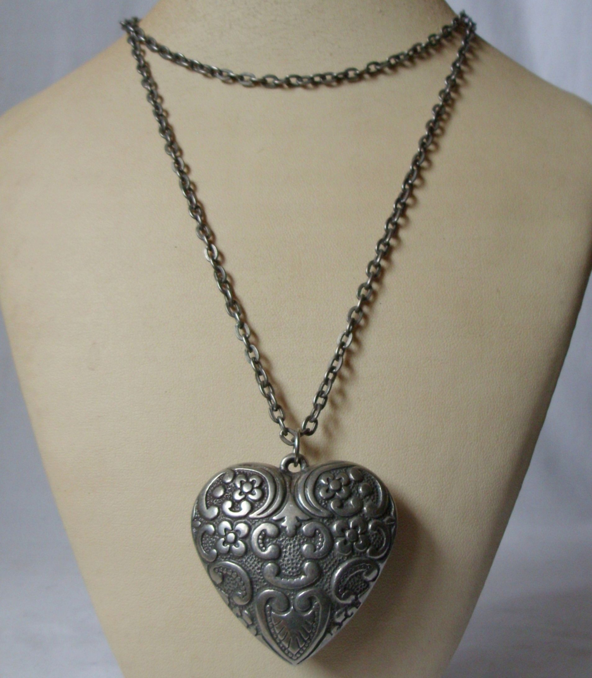 Предметом аукціону є старовинне, гарне,величезне, надзвичайно виразне та символічно романтичне намисто з кулоном у формі серця. Виконано все це з металу сріблястого кольору, який красиво і стильно затемнено. Все в чудовому стані, покрите натуральною патиною.