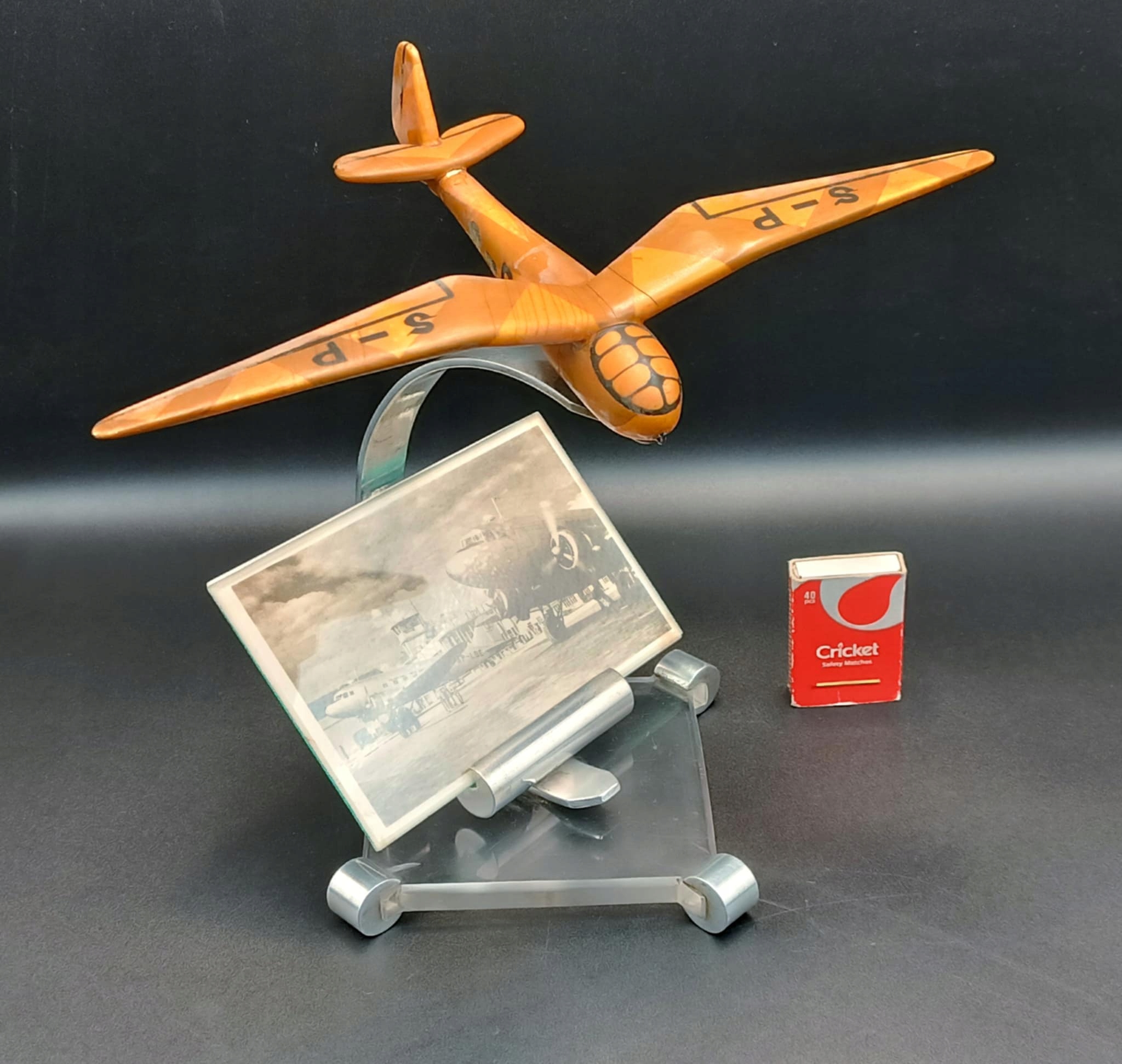 Стара фоторамка на авіаційну тему. 1950-ті роки. Весь номер оформлений у стилі ар-деко. Планер є рухомим і може обертатися навколо осі, розташованої під кабіною. Розмір основи 15,5х15,5см. Скляна фотоплитка форматом 9х14 см. Стан: як мінімум хороший. Власне, єдиним недоліком (цілком оборотним) є часткова тьмяність лакофарбових покриттів на планері, який повністю виготовлений з дерева. Крім того, звичайні ознаки минулих років. Шановний предмет. Ласкаво просимо!!!