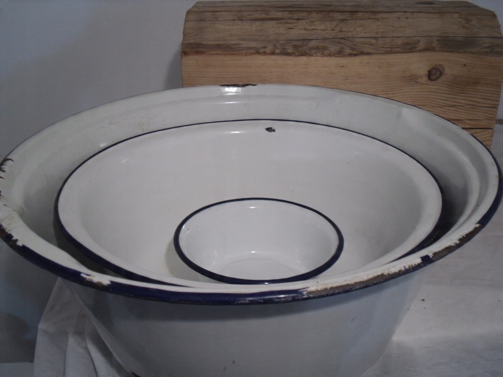 Ласкаво просимо на мій аукціон. На аукціонах я зазвичай пропоную вам предмети з періоду PRL. На цьому аукціоні я пропоную оригінальні 2 сталеві чаші, емальовані безкоштовно / 3 / третьої найменшої форми миски, як два більші, на набір. Досить великі глибокі незвичайні миски виглядають як великі миски або невеликі ванни. Білі миски з синіми краївами. Чаші через їх вік мають нормальні ознаки використання у вигляді невеликих подряпин та делікатних потертостей, знебарвлення та емалі. Найбільша шкода краю, найменша без пошкоджень. Всі чаші підписали. /Див. Фотографії/