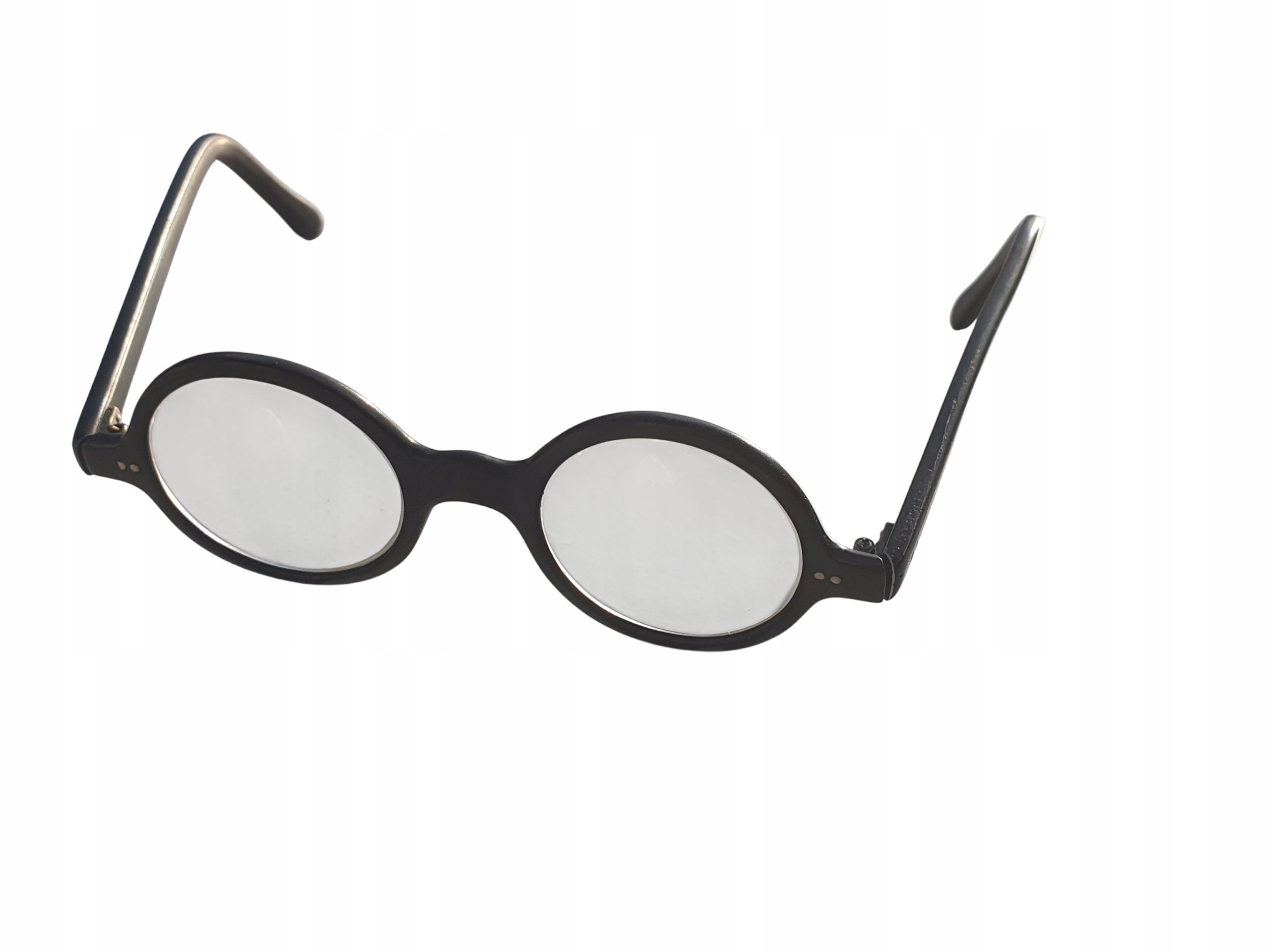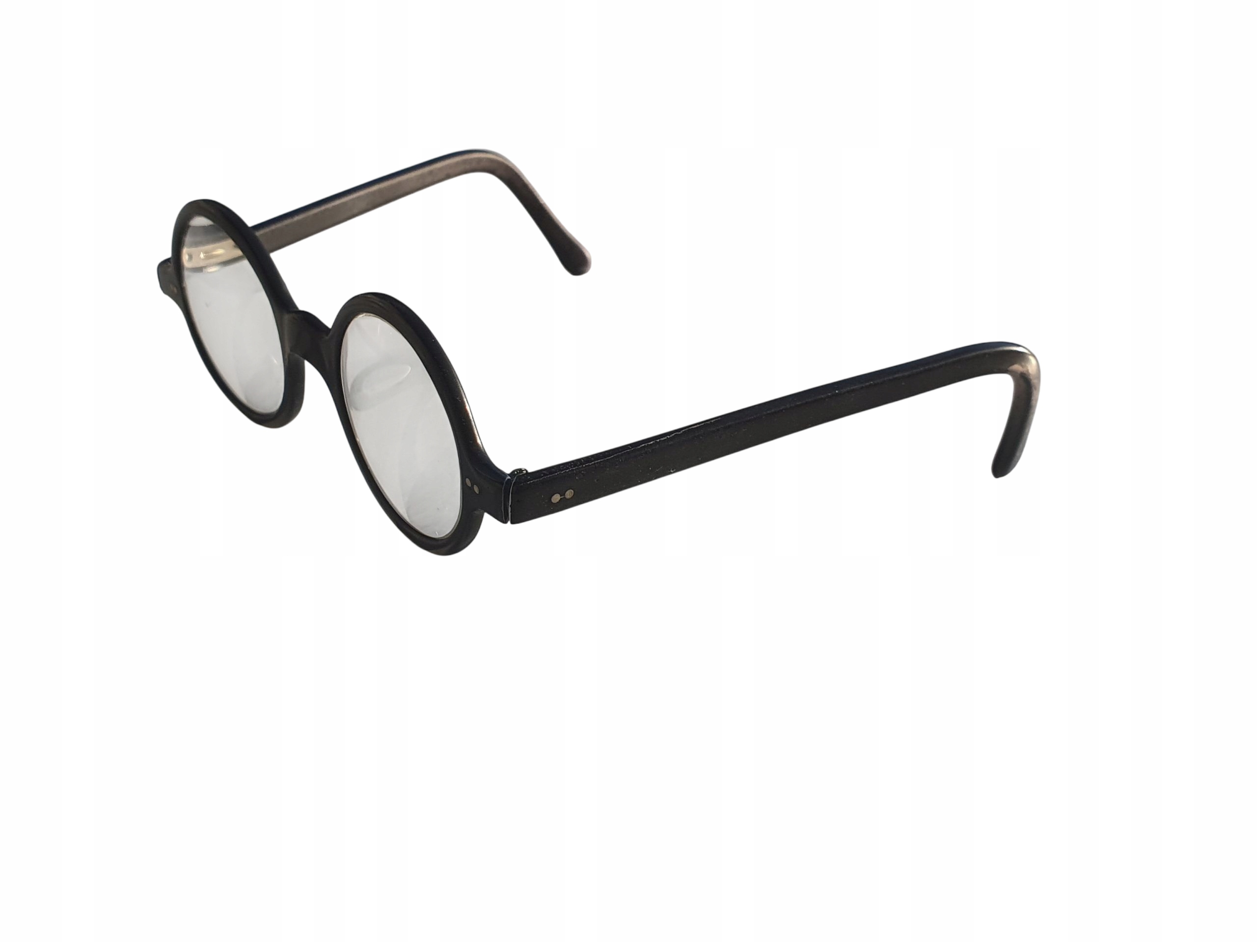 Окуляри характеризуються класичною, позачасовою формою - вони мають круглі лінзи та суцільну оправу темного кольору. Все зроблено з увагою до деталей, що свідчить про високу якість старих оптичних виробів. Зберігаються в дуже хорошому стані, враховуючи їхній вік, із природними слідами використання та старіння, що додає їх автентичності.