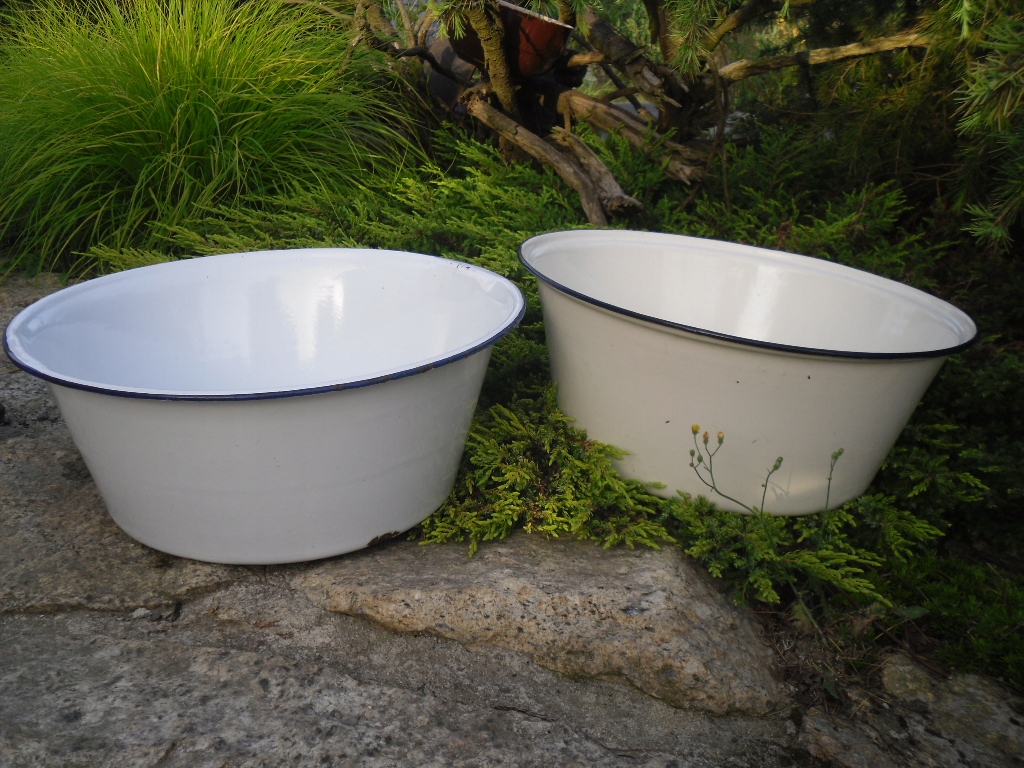 Ласкаво просимо на мій аукціон. На аукціонах я зазвичай пропоную вам речі часів Польської Народної Республіки. На цьому аукціоні я пропоную 2 ОРИГІНАЛЬНІ сталеві емальовані миски. Досить великі ГЛИБОКІ чаші, незвичайні, виглядають як великі чаші або маленькі ванни. Білі миски з синіми обідками, одна з них, здається, має чорний обідок, але дуже темно-синій/темно-синій. Через свій вік миски мають звичайні сліди використання у вигляді дрібних подряпин і делікатних потертостей, зміни кольору та вм’ятин на емалі. Проте пошкоджень емалі практично немає, другий з внутрішньої і нижньої сторони, а край трохи загнутий. Чаші НЕ гнуті. /див. фото/