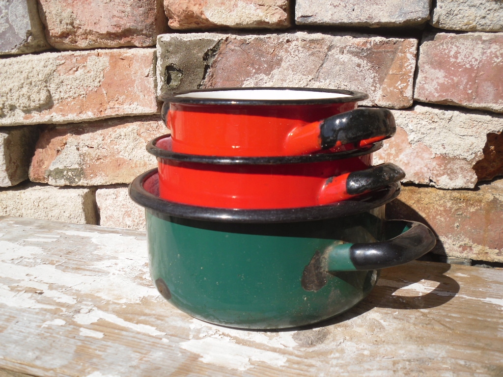 Ласкаво просимо на мій аукціон. На аукціонах я зазвичай пропоную вам речі часів Польської Народної Республіки. На цьому аукціоні пропоную ОРИГІНАЛЬНІ старі емальовані каструлі з трьома такими ж каструлями з ручками/ручками для перенесення. Два червоних, білий центр і чорна рамка, і один темно-зелений з білим центром і чорною рамкою. На каструлях є звичайні сліди використання у вигляді подряпин, відколів емалі (їх небагато) або зміни кольору, найбільше змінилася зелена каструля всередині, сильно знебарвлене покриття та помітні плями корозії. Усі вони мають підписи. Горщики НЕ погнуті, горщики ТУГІ> Гарна прикраса нашого житла/саду. Горщики очищені та вимиті, але не змащені на випадок, якщо покупець захоче використовувати їх як ванни для птахів або квіткові горщики. До найменшого можу додати червону кришку. /див. фотографії/.