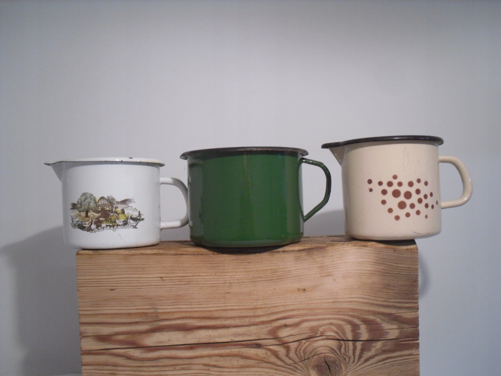 Ласкаво просимо на мій аукціон. На аукціонах я зазвичай пропоную вам речі часів Польської Народної Республіки. На даному аукціоні пропоную ОРИГІНАЛЬНІ старі емальовані каструлі, три схожі каструлі дві з носиком/наливкою і одна без наливки традиційна гладка. Горщики білого кольору з наклейкою, світло-кавового/бежевого кольору з принтом у крапки та без носика та зелені. Горщики мають одну ручку/ручку. Каструлі мають звичайні сліди використання, зміни кольору, подряпини та невеликі відблиски емалі. Прекрасна прикраса для нашого середовища проживання/саду. /див. фото/.
