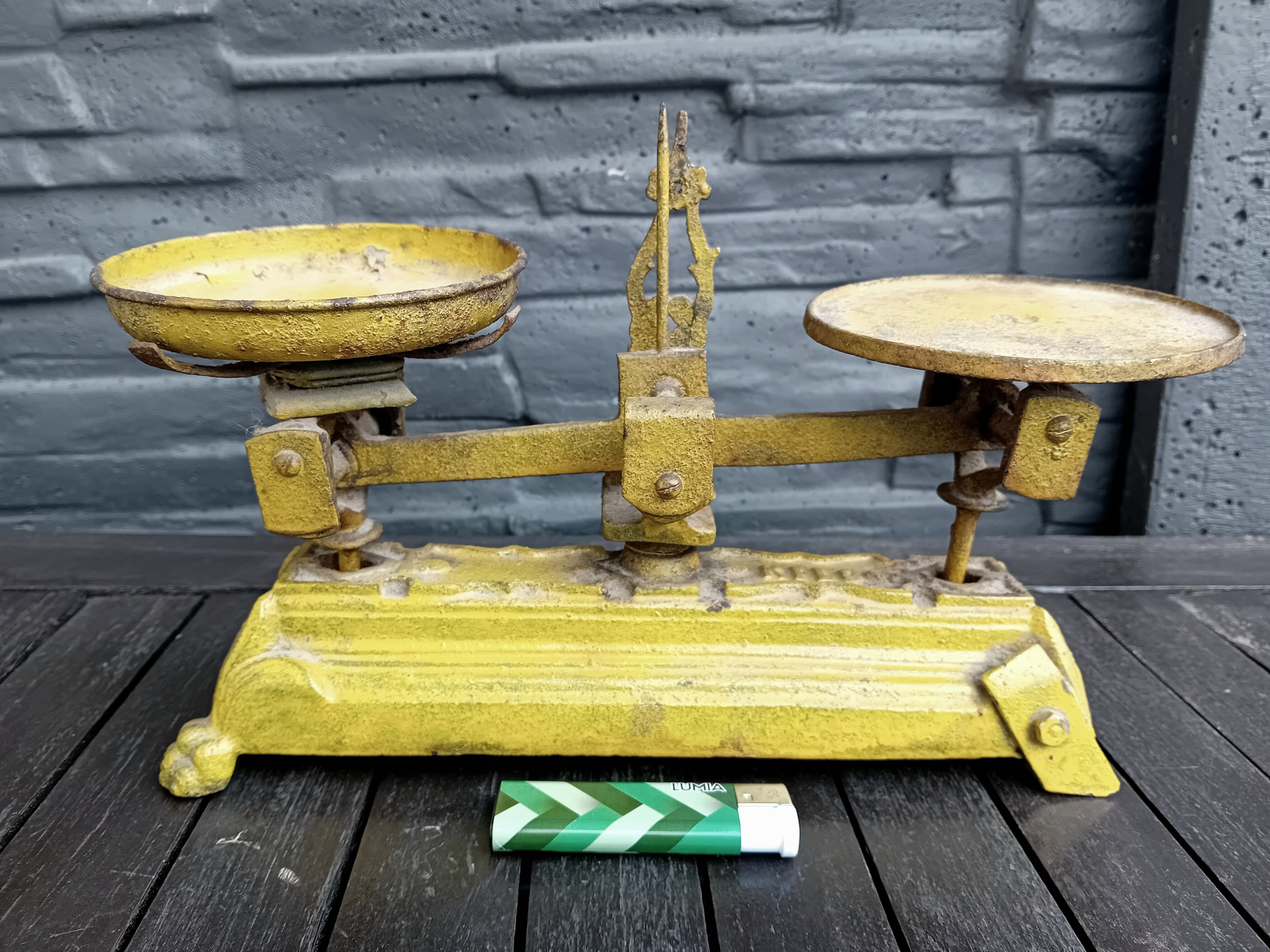 СТАРІ МАЛІ ЧАВУННІ ВАГИ, РОЗМІР ОСНОВИ - (+-) 28см х 9см, РОБОЧІ ВАГИ, потребує ремонту (не знаю, наскільки точно), додано одну ніжку, фото.