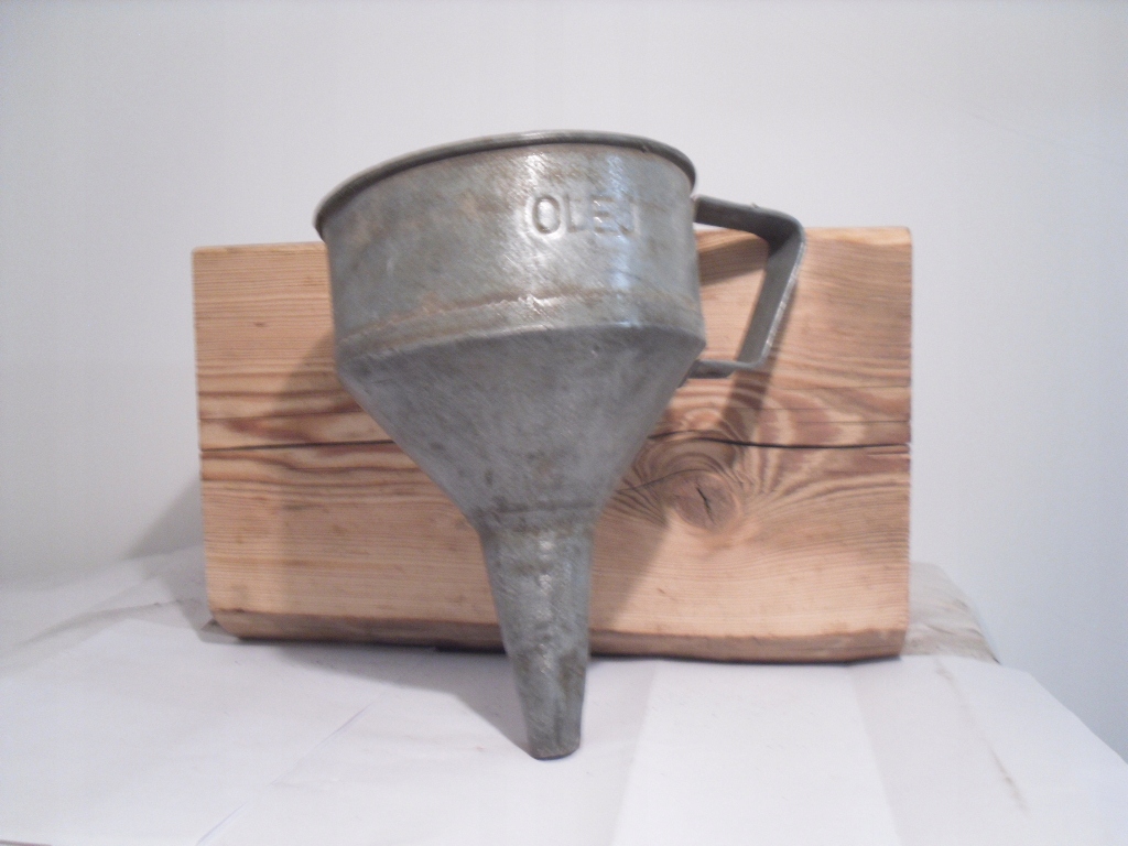 Старий, оригінальний, гнута паливна воронка з ПНР, оцинкована, РЕКОМЕНДУЮ, напис МАСЛО