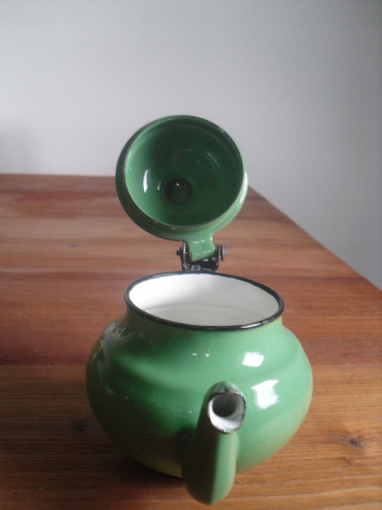 Старий чайник, чайник, емальований глечик, зелена кришка, підпис PRL