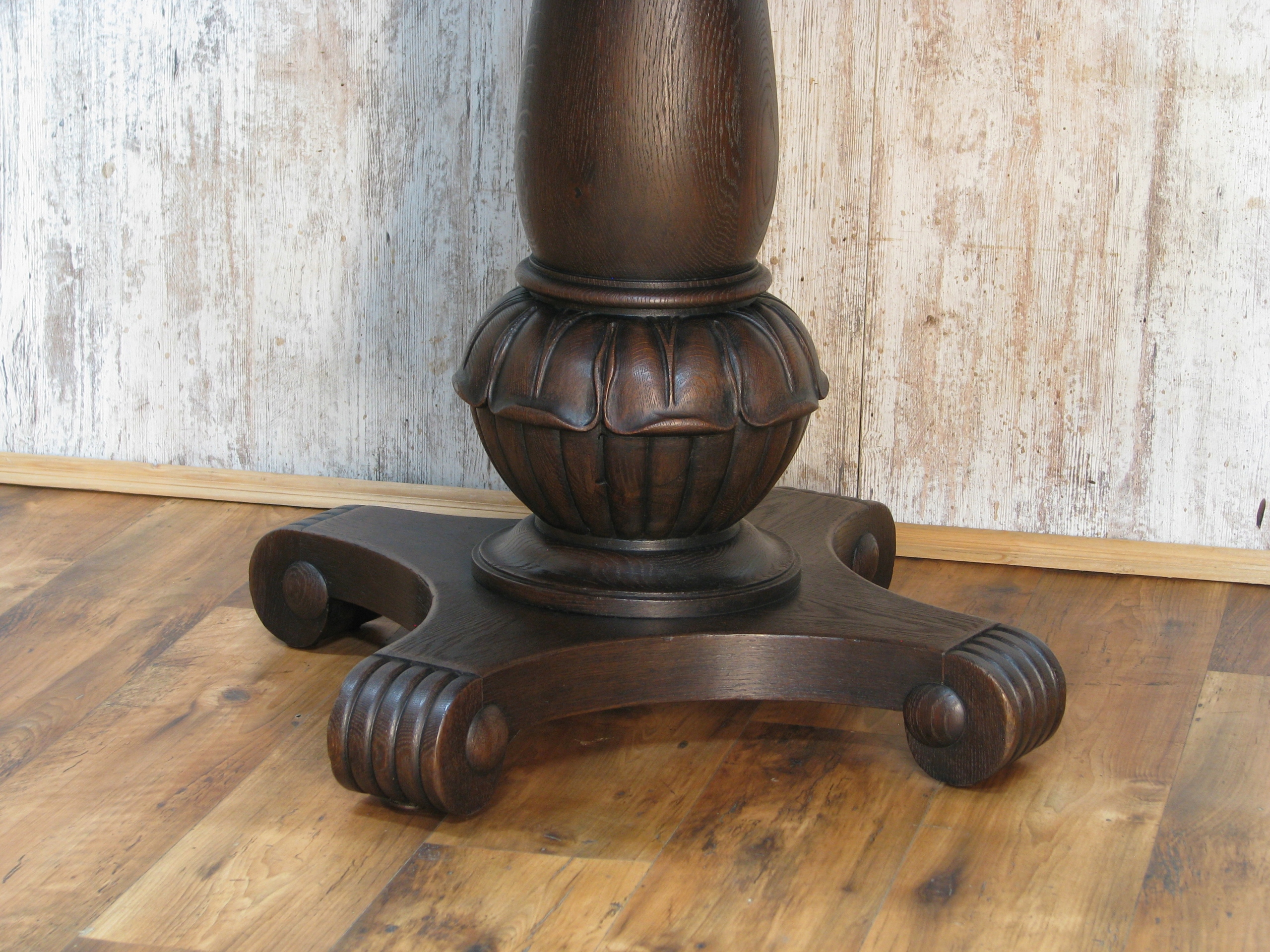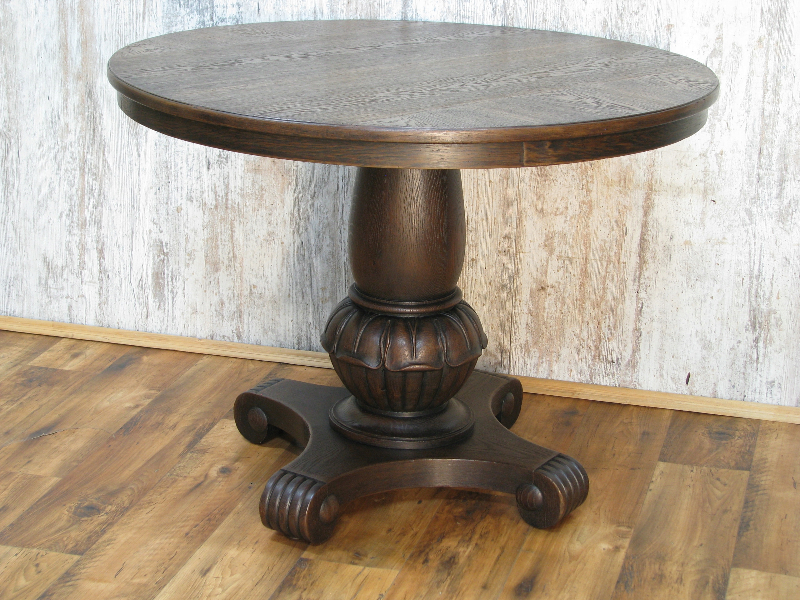 Проглядається оригінальна красива текстура старого дерева, предмет меблів з масиву дуба з масивною товстою різьбленою ніжкою, шпонованим верхом.