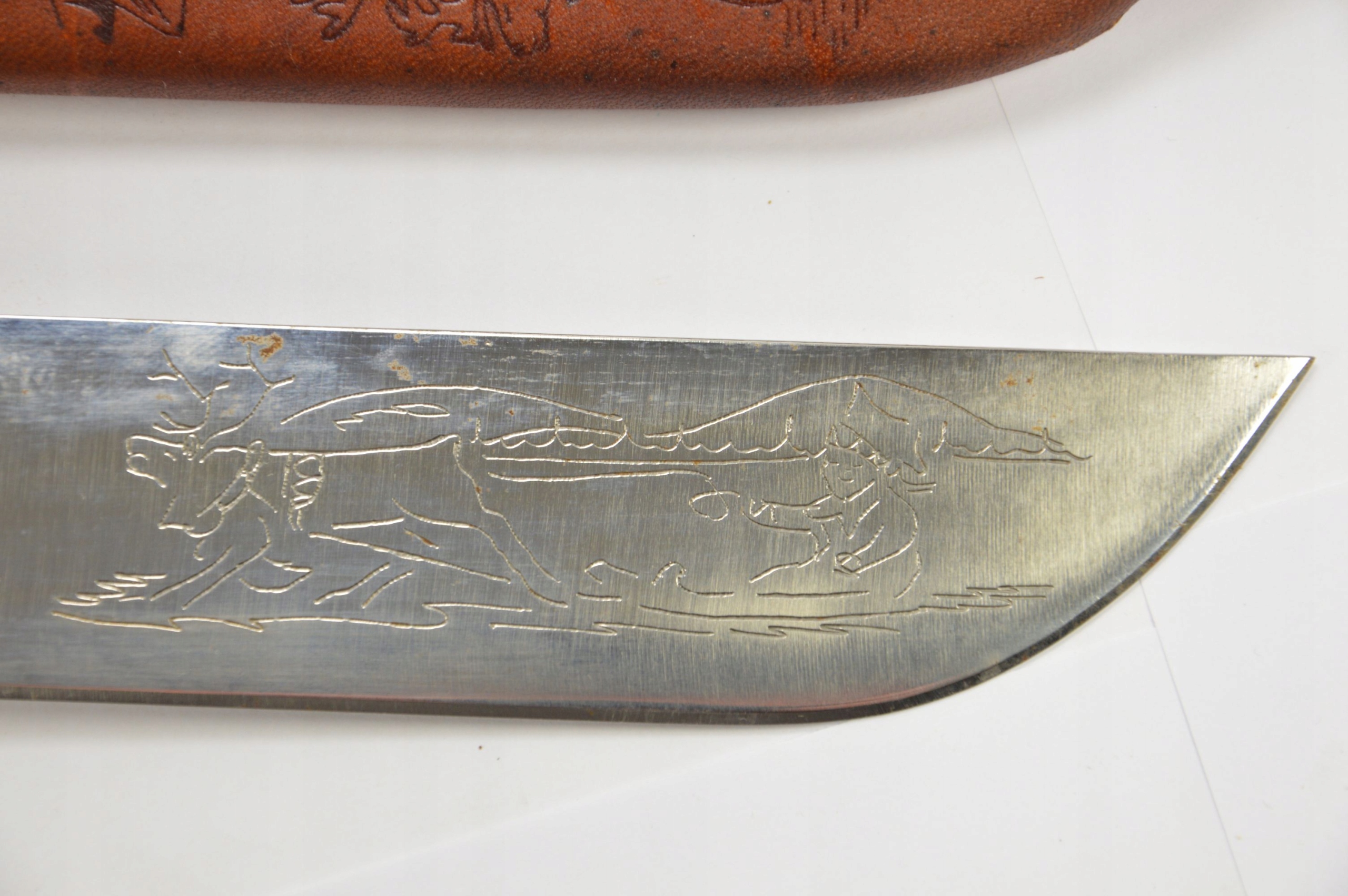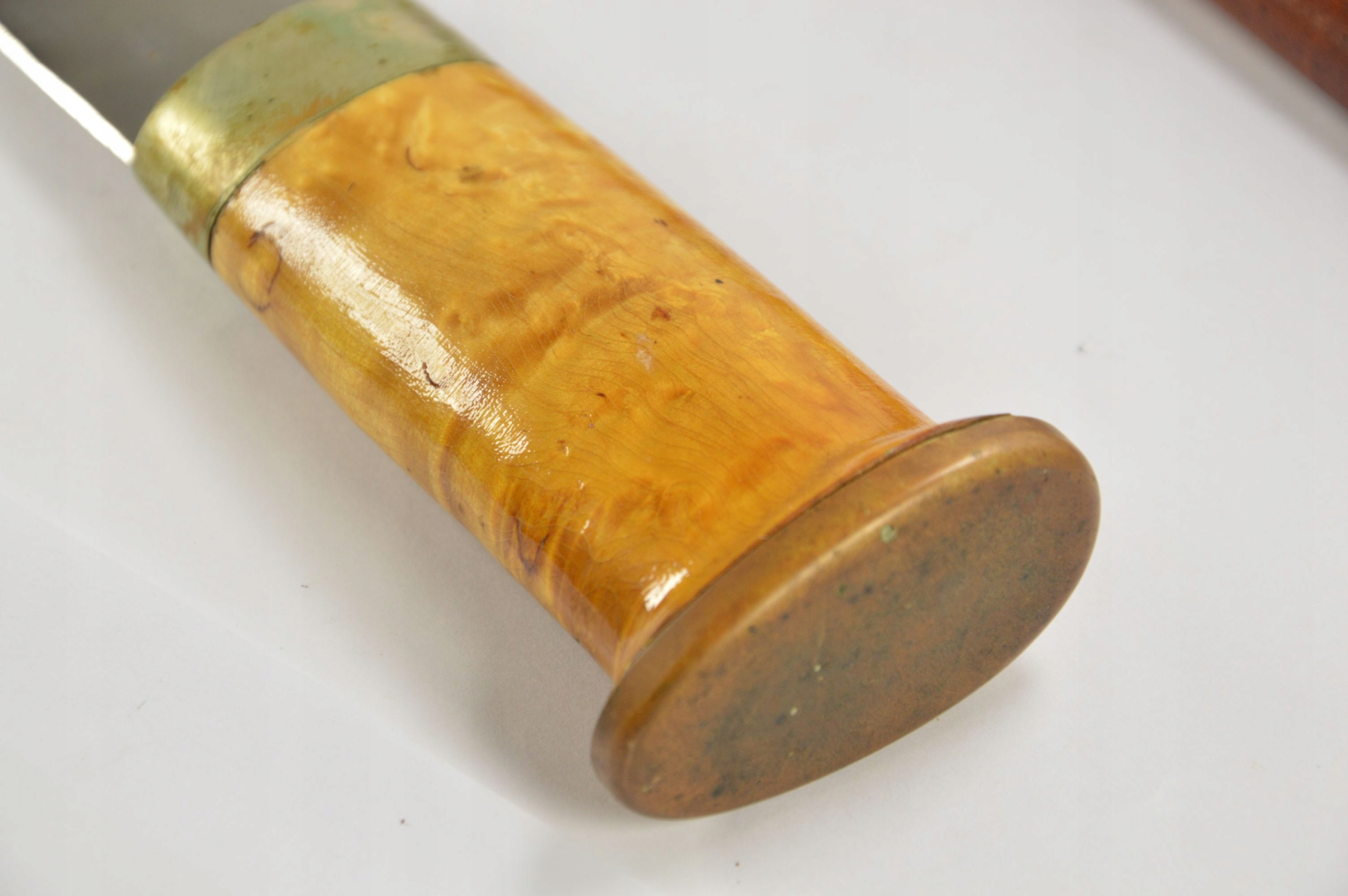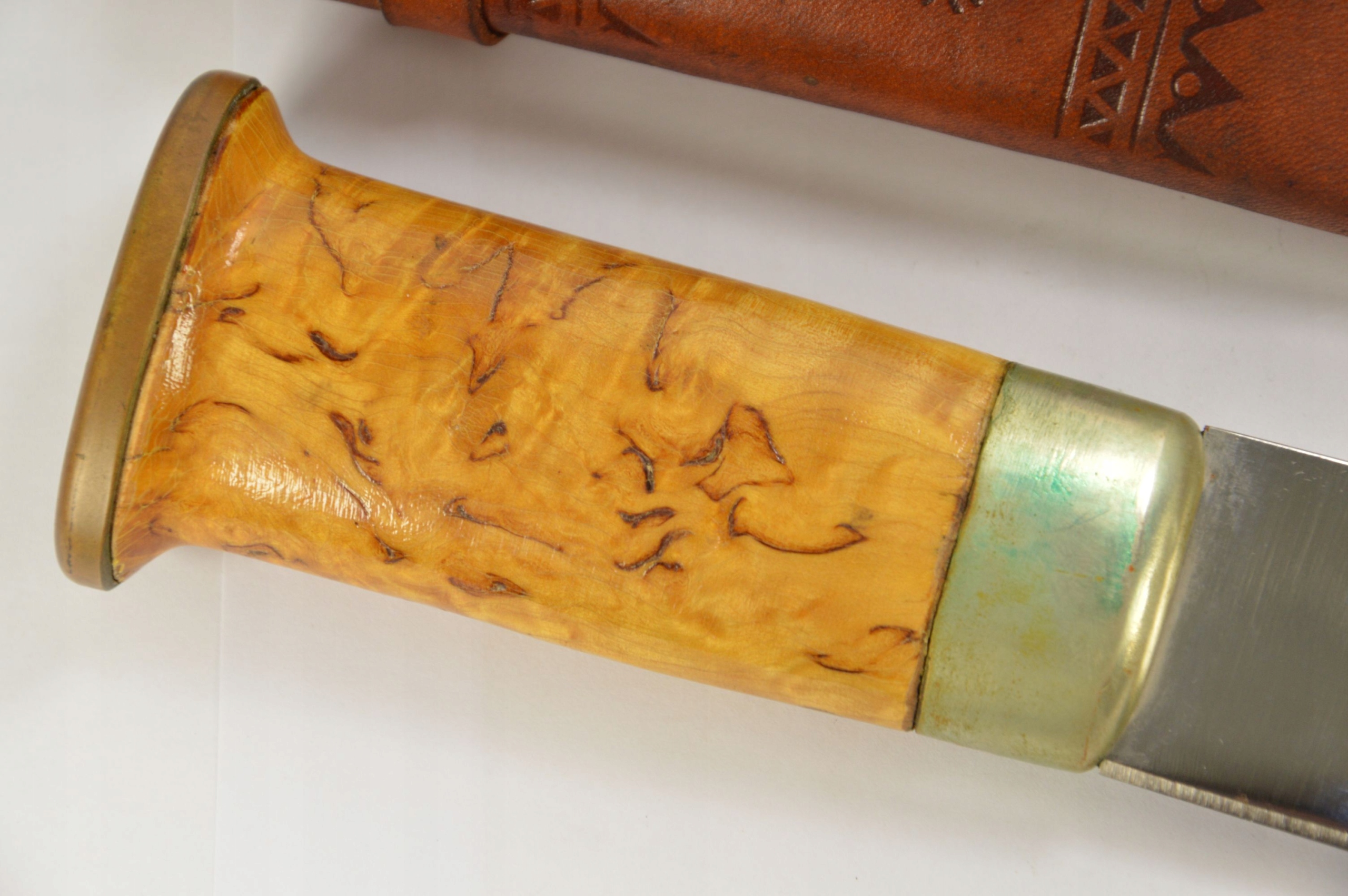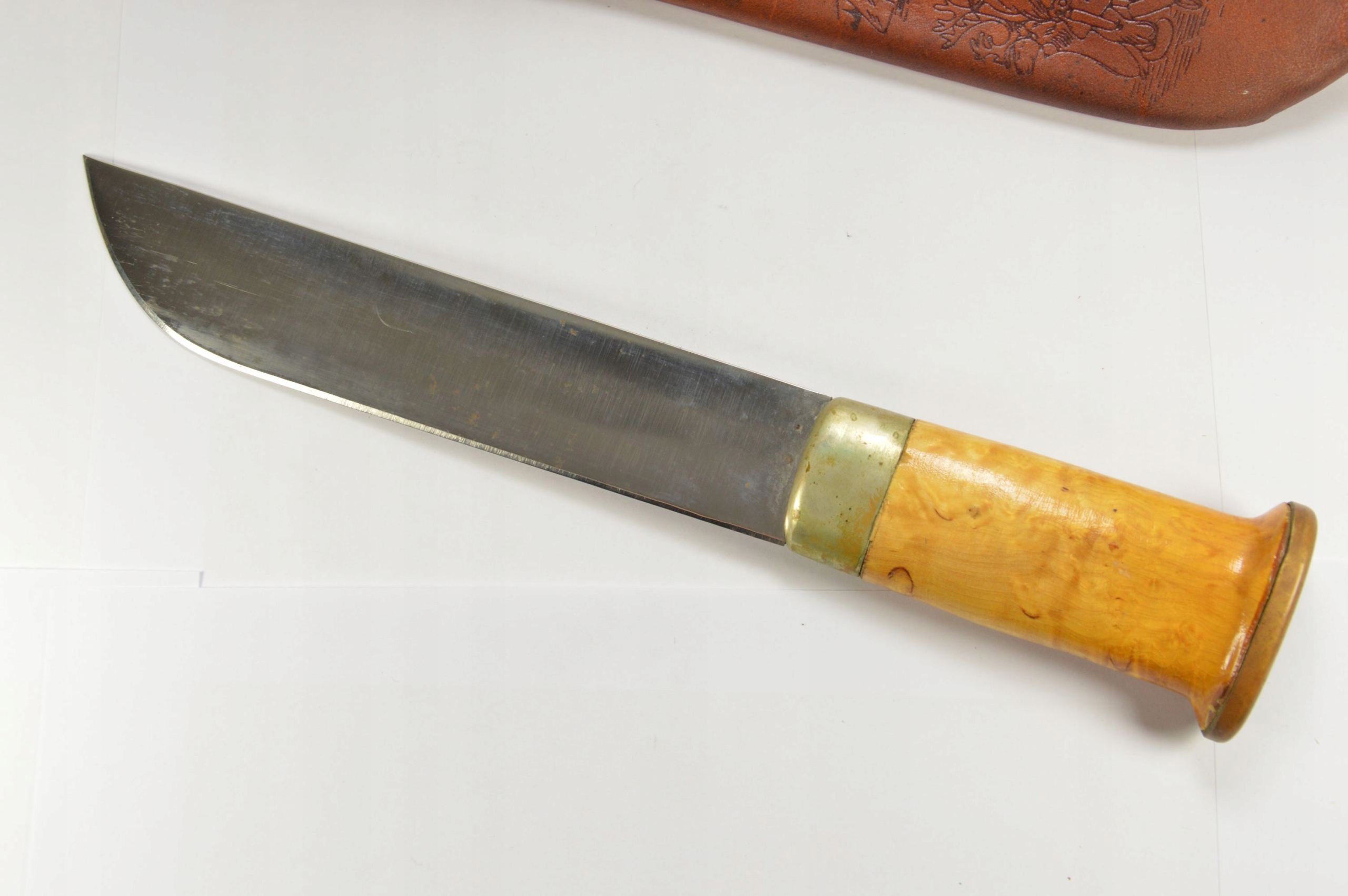 Оригінальний, старий фінський ніж Дж. Мартіні. Лезо оформлене, підписане, гостре, рукоятка з берези. Підписана шкіряна піхва на ножі зі зламаним судном. На ножі видимими незначними слідами нормального використання.