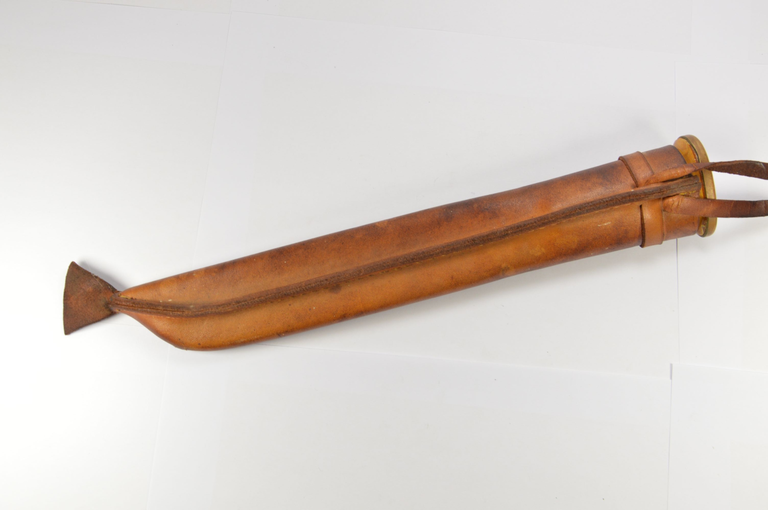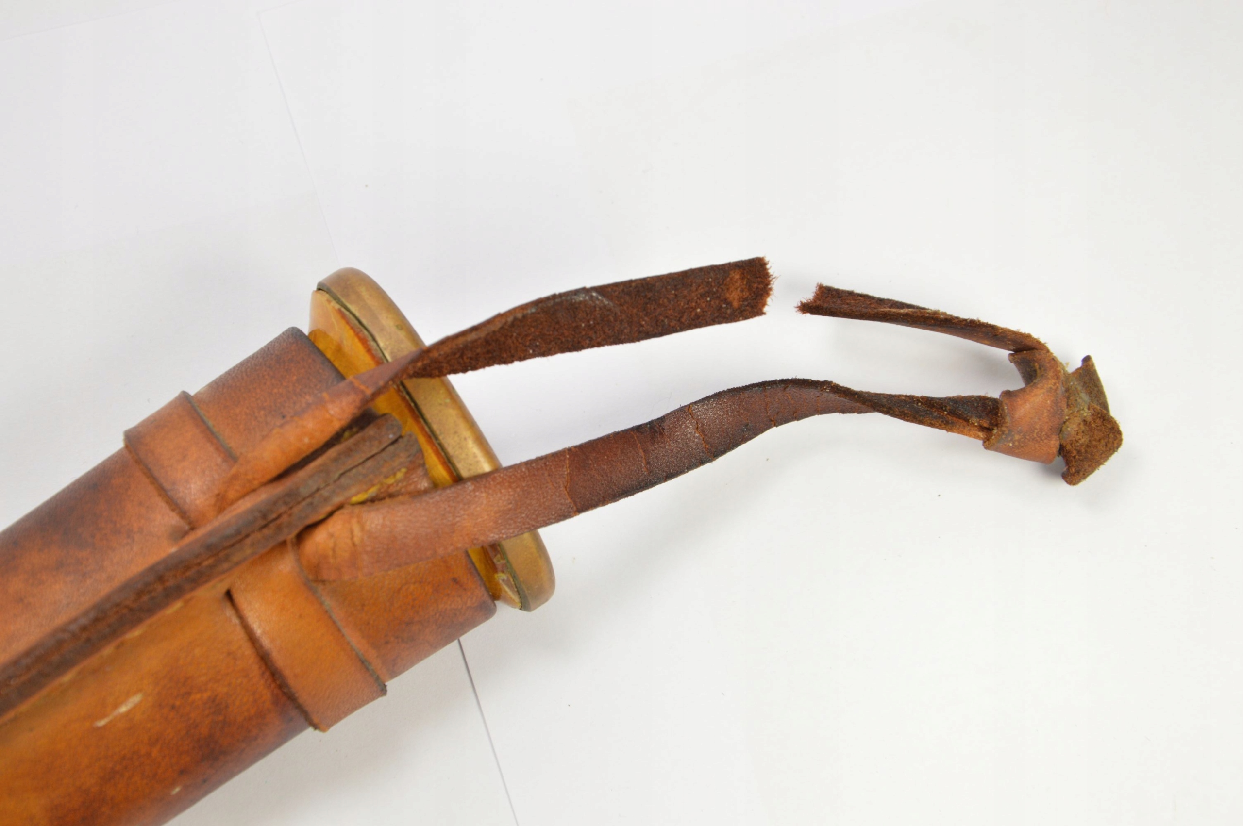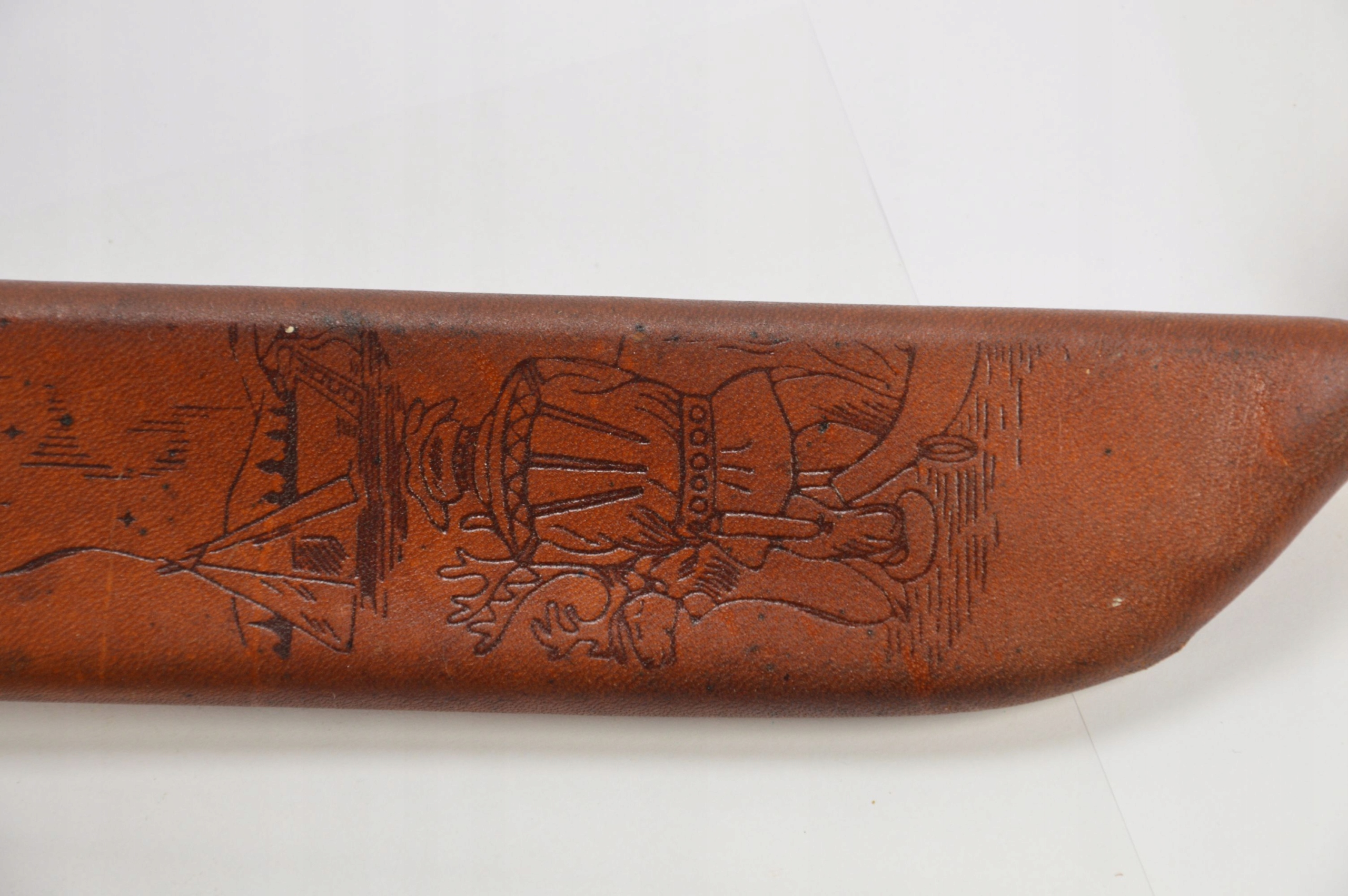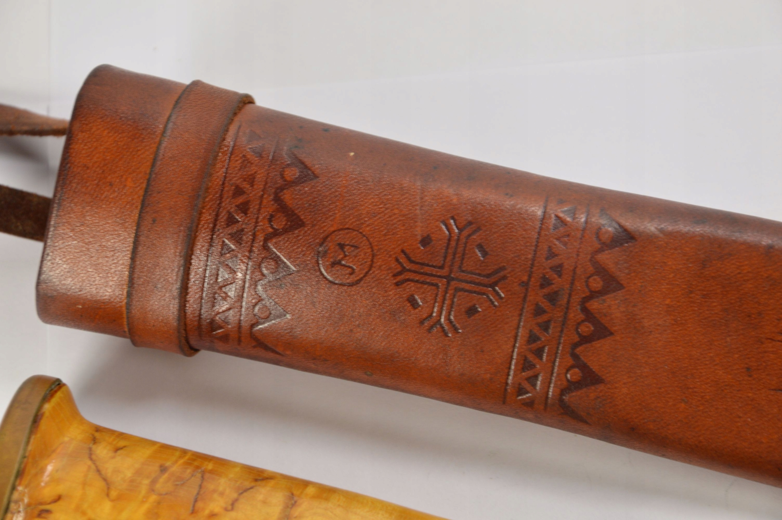 Оригінальний, старий фінський ніж Дж. Мартіні. Лезо оформлене, підписане, гостре, рукоятка з берези. Підписана шкіряна піхва на ножі зі зламаним судном. На ножі видимими незначними слідами нормального використання.