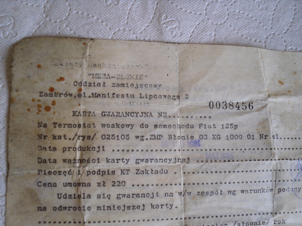 Старий гарантійний талон на термостат Fiat 125p 1984 року читається Fiat