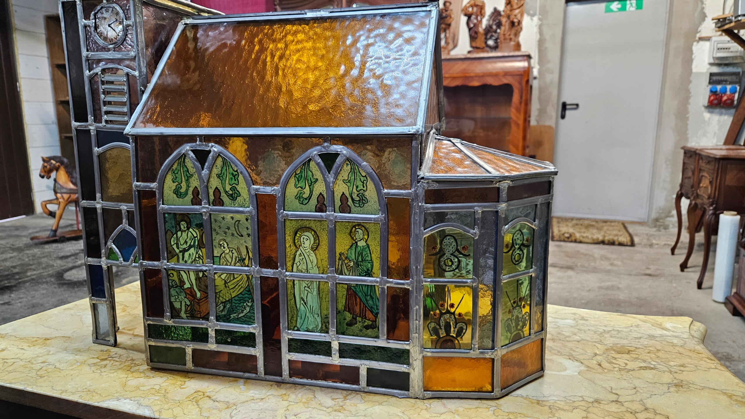 - Виготовлено зі скла, свинцевого кольору, ручна люстрована рама - виготовлена зі скла без тріщин - кольорове склеювання. Деталі відносяться до власне Деталі церкви.