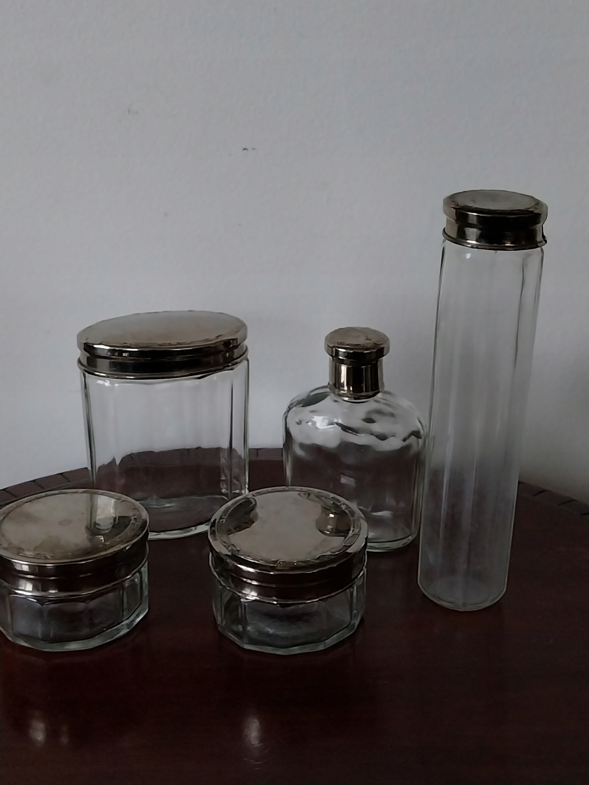 Гарний, старий туалетний набір, 5 штук, скло, металеві кришки, 2 ємності, діаметр 6 см, одна основа 6,5 х 4 см, висота 9 см, пляшка з пробкою, розмір основи 6 х 3,5 см, висота до пробки 6,5 см, довгий контейнер має пошкоджену кришку, решта в дуже хорошому стані як на фото