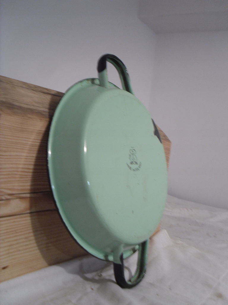 Ласкаво просимо на мій аукціон. На аукціонах я зазвичай пропоную вам речі часів Польської Народної Республіки. На цьому аукціоні пропоную ОРИГІНАЛЬНУ стару неглибоку каструлю та сковорідку з двома ручками/вушками. Емальований горщик, цілий горщик, зелений/м’ятний зовні та білий усередині з чорним обідком і кінцями ручок. На горщику тільки одна емальована підкладка, зміна кольору та невеликі подряпини. Гарний і розбірливий ПІДПИС. Горщик вимитий і нічим не змащений. Дивіться фотографії.