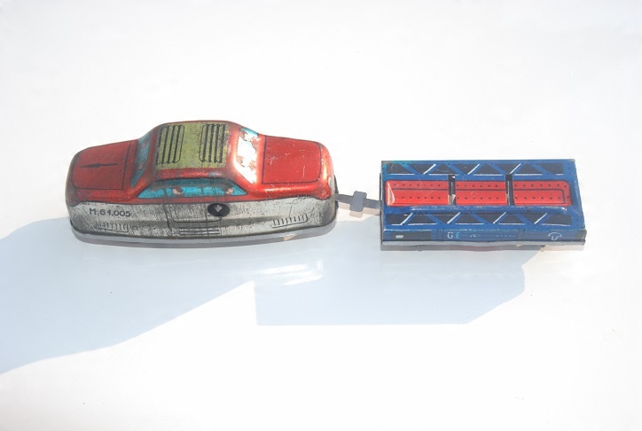 Старий іграшковий автомобіль, жерстяна машина, машина з причепом, старовинний пам'ятник