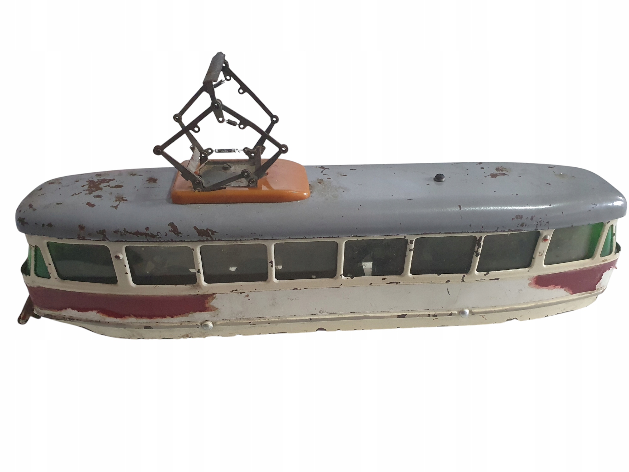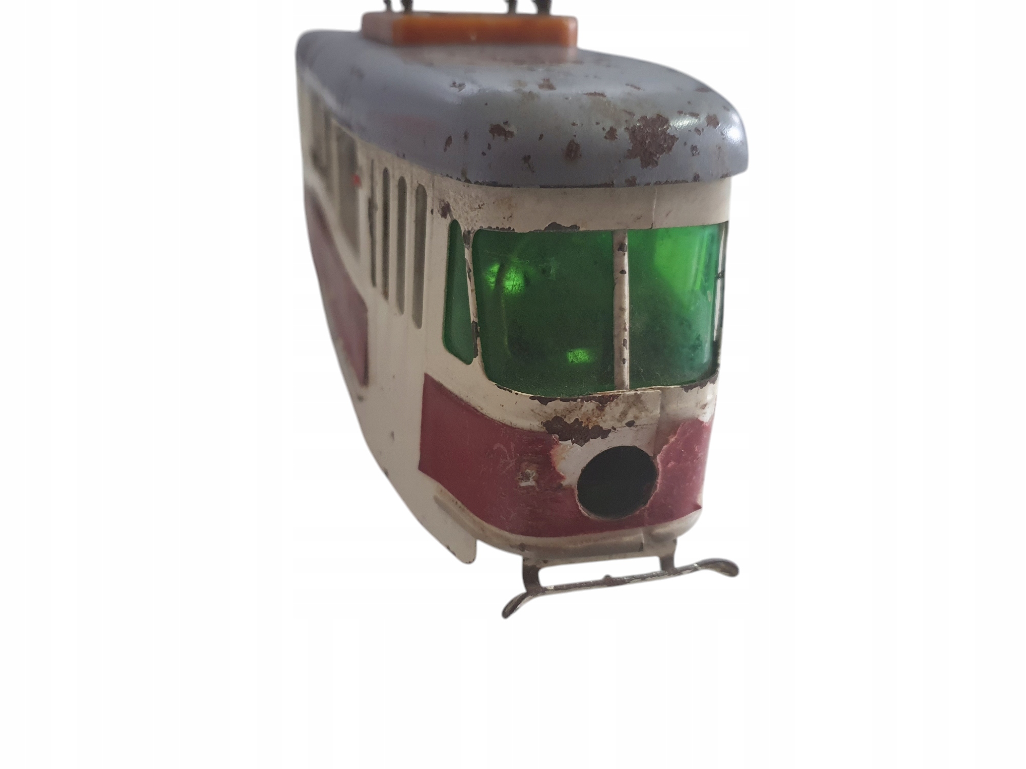 Період виробництва: 1950 -ті роки. > Поведінка: оригінал, з видимими слідами часу та використання - стирання фарби, невеликі багаття корозії (див. Фотографії). Структура збережена в повному обсязі. > 1. Класичний дизайн: трамвай має характерну форму даху, вирізки для вікон, типовий для іграшкових моделей залізниць із середини -20 століття. Оригінальні деталі: видимі тиснення та структурні деталі, що відображають увагу до деталей у виробництві. На стороні є логотип оригінального виробника "CH". Колеса: Метал, встановлений на суцільному шасі, яке зберегло повну функціональність. Патін часу: Видимі сліди природного споживання, що додає значення колектора. P> Ширина: 6,4 см