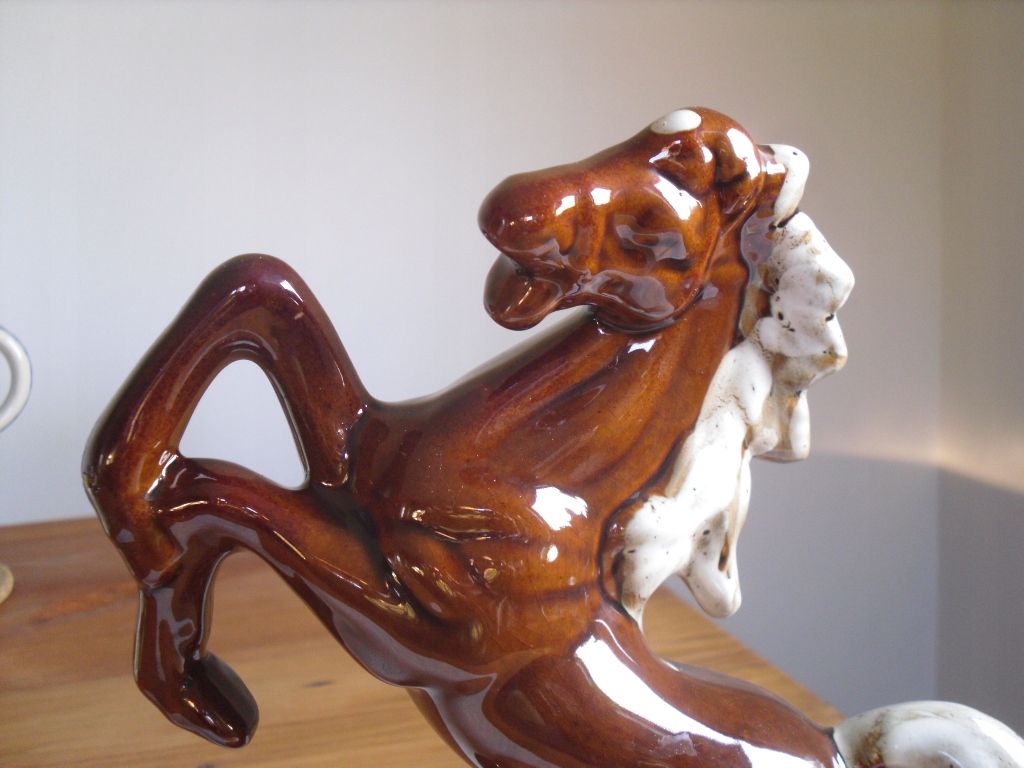 Ласкаво просимо на мій аукціон. На аукціонах я зазвичай пропоную вам предмети з періоду PRL. На цьому аукціоні я пропоную оригінальну керамічну стару фігуру коня, що стоїть на задніх ногах з хвостом і білою гривою з білим додаванням коричневого кольору, як ціла статуетка. Дуже приємна поведінка, ніжні тріщини під емалі і дуже мало, практично невидимі, вам потрібно добре влаштувати статуетку під хорошим кутом в хорошому світлі, щоб щось побачити. Прекрасна прикраса колекції середовища проживання. Дивіться фотографії Запитайте.