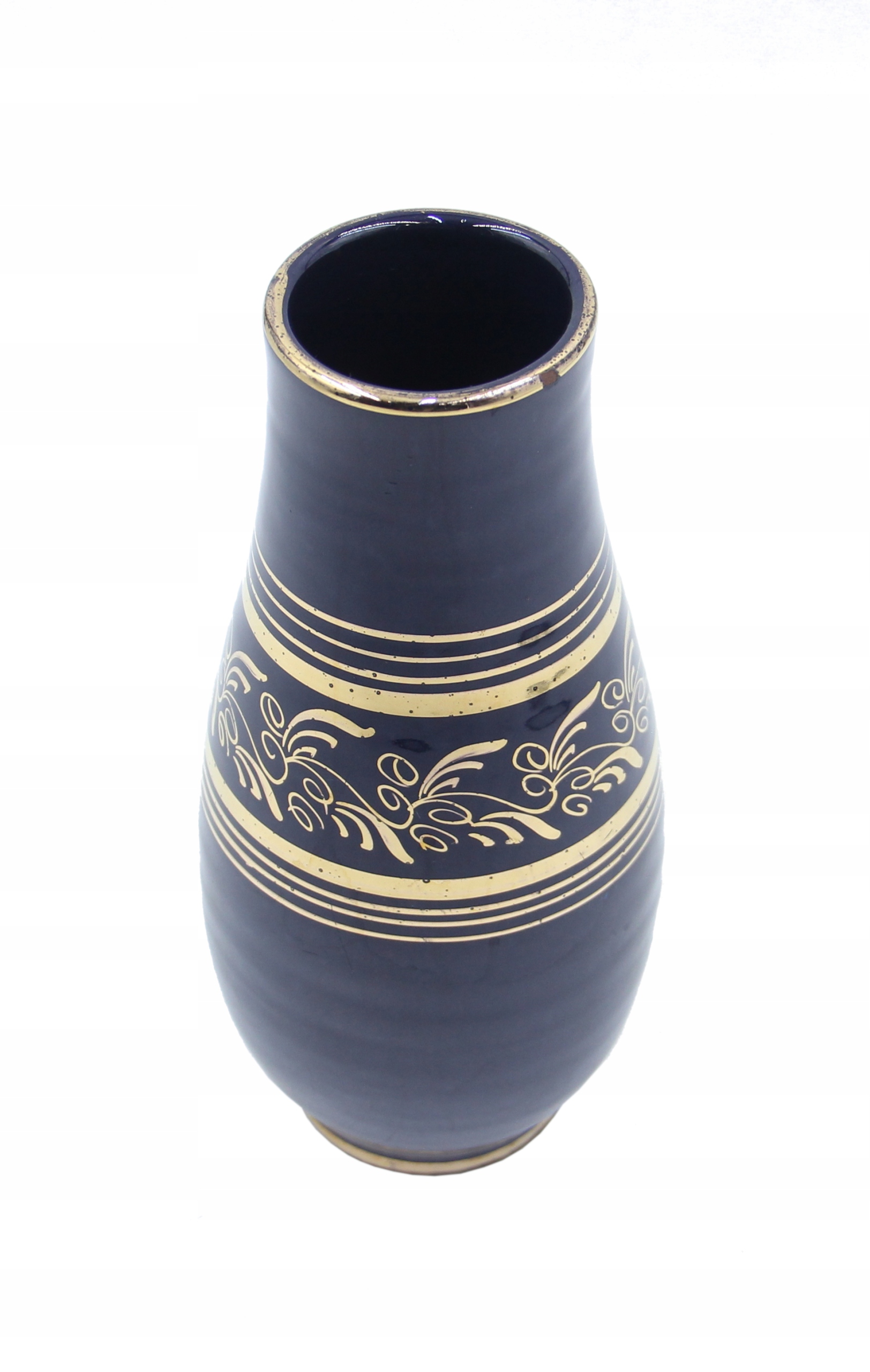 Ваза з червоної глини з кобальтово-блакитною поливою та золотим візерунком, ймовірно, періоду Польської Народної Республіки. Сліди використання, потертості до позолоти. Розміри; висота 20х9 см. Рекомендую