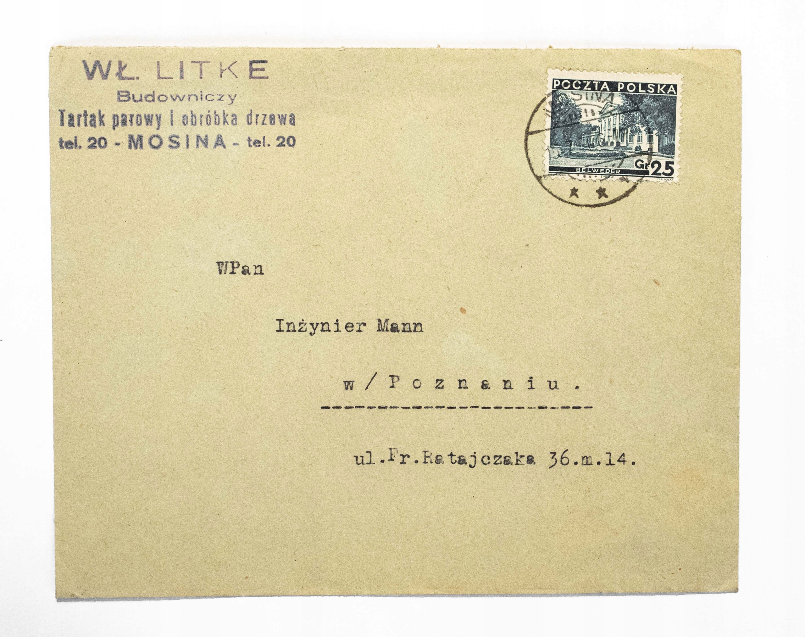 Старий конверт - Wł. Літке, пароварка, обробка дерев, Mosina 1936