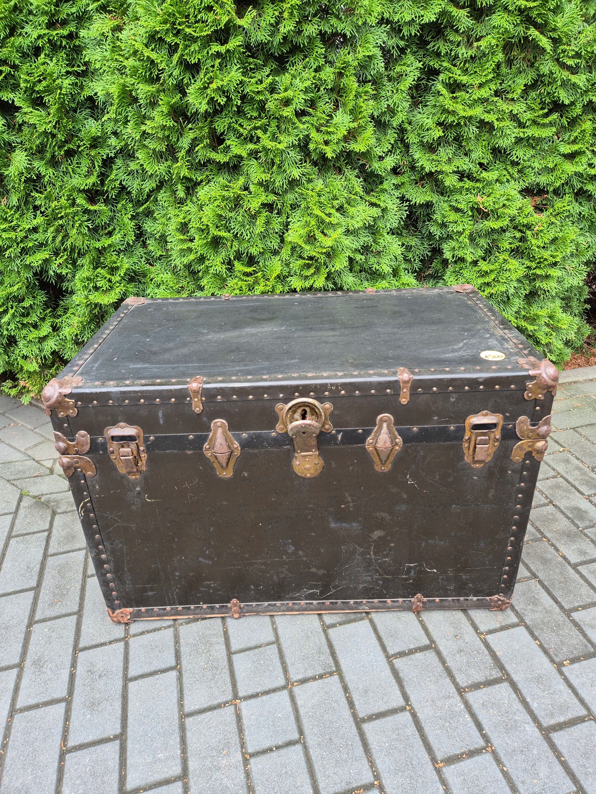 Оригінальна, стара чорна дорожня скриня. Оснащений металевою фурнітурою, замками та шкіряною боковою ручкою. Інтер'єр обшитий тканиною з квітковим малюнком. Ідеально підходить як прикраса, меблі для стилізації інтер'єру або ремонту.