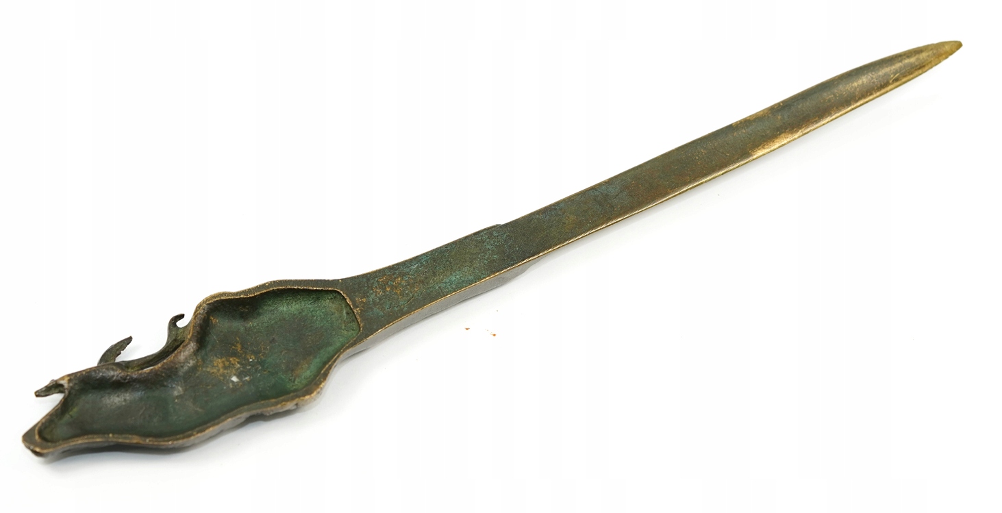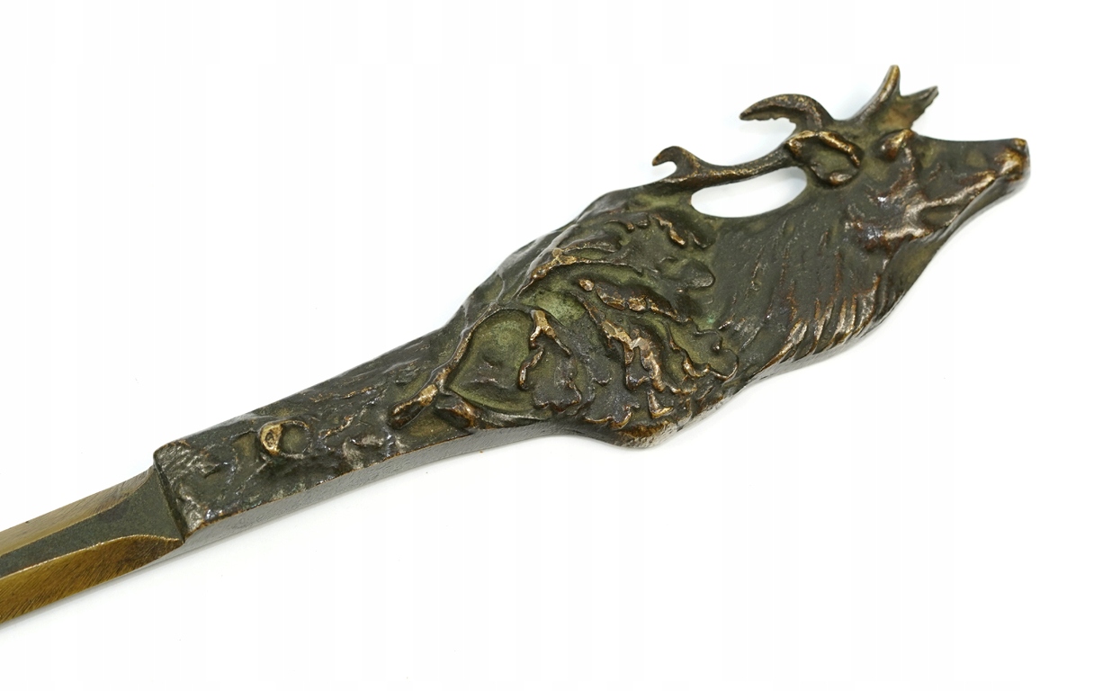 Оригінальний, винятково красивий, старий, довоєнний, дуже декоративний мисливський ніж-буква з оленем, оброблений. 19 століття, патинована бронза, розмір: загальна довжина 26,5 см, найбільша ширина 4 см, стан дуже хороший, натуральна патина. Стан добре видно на фото в описі аукціону.