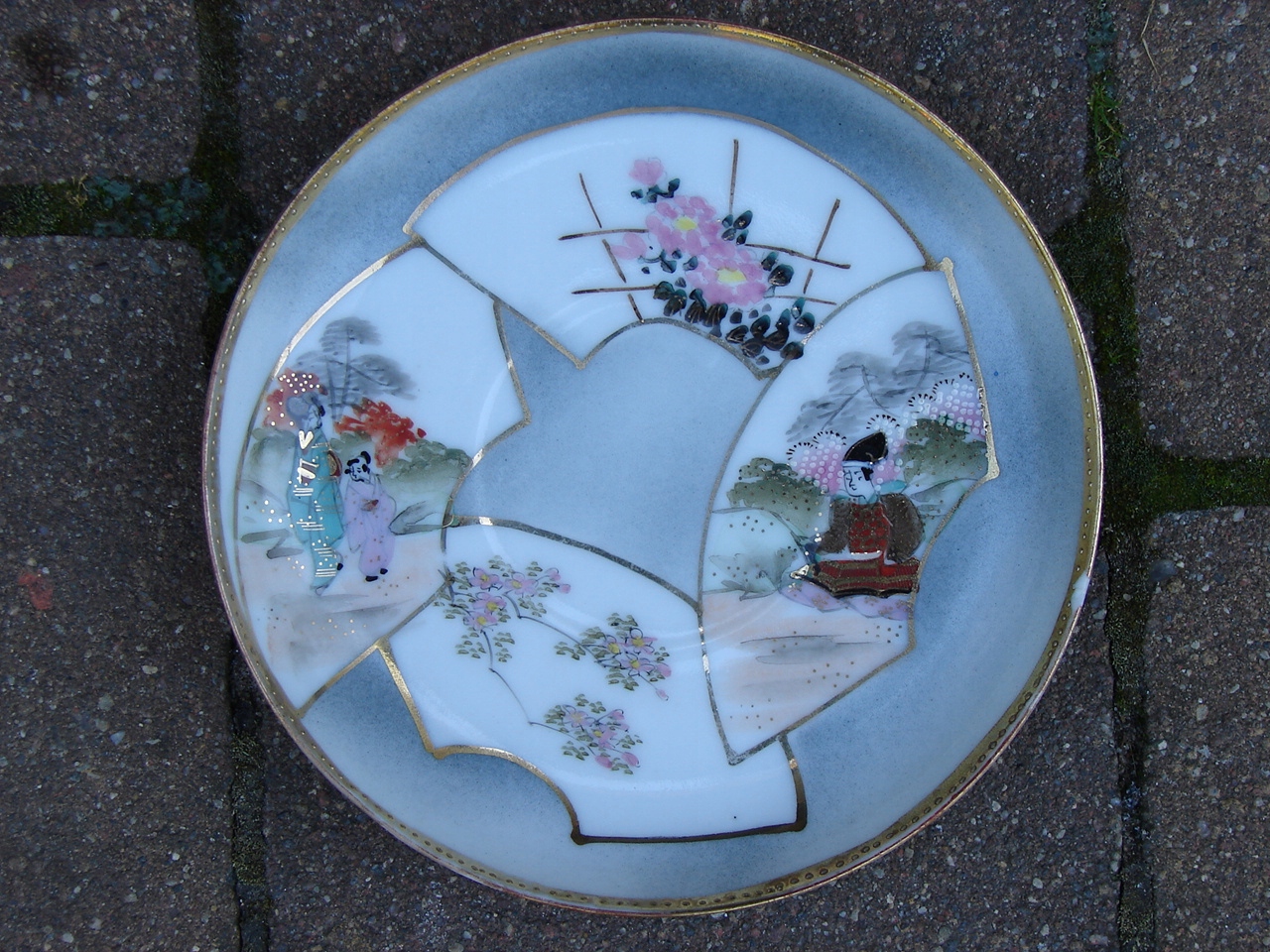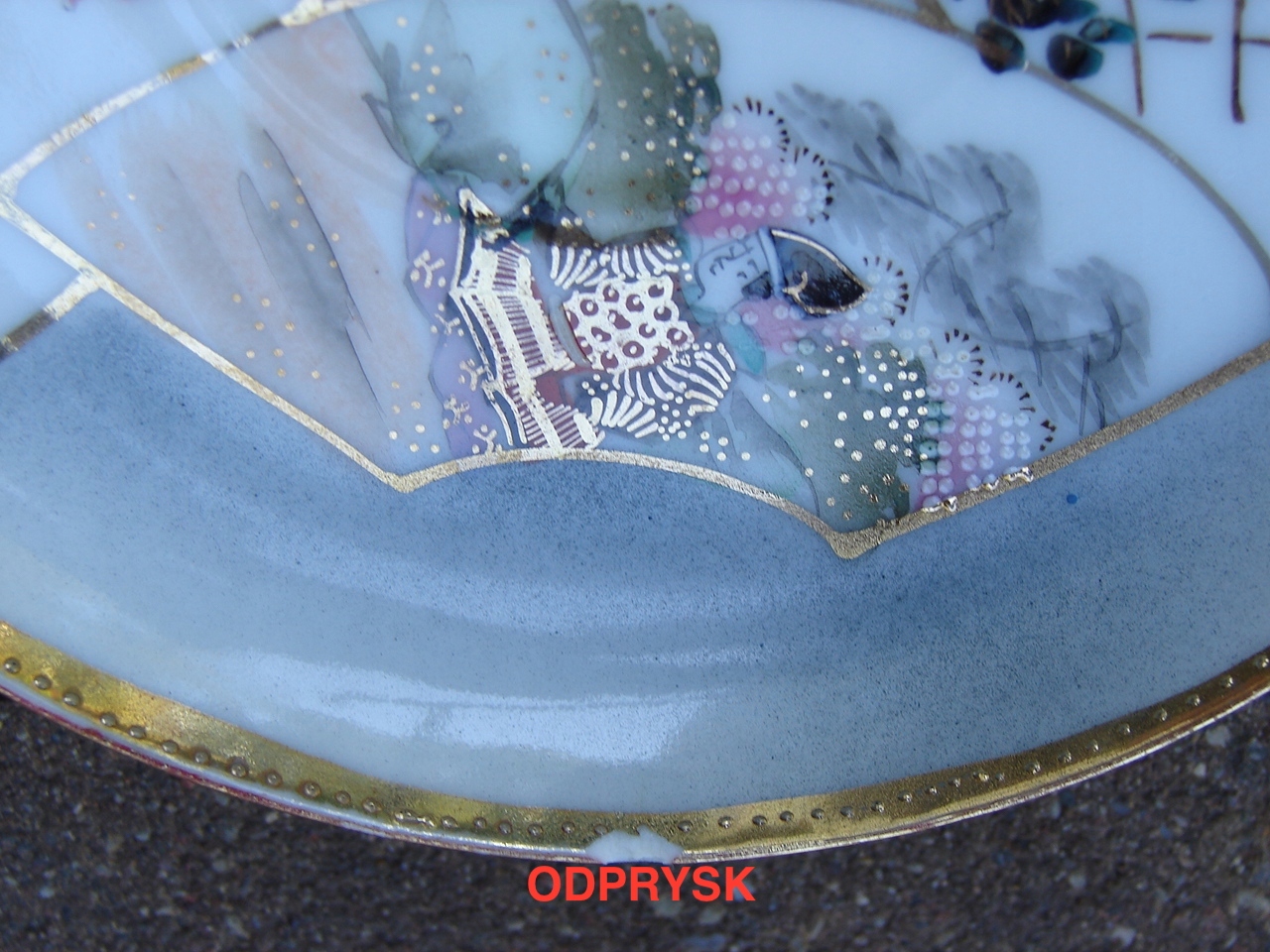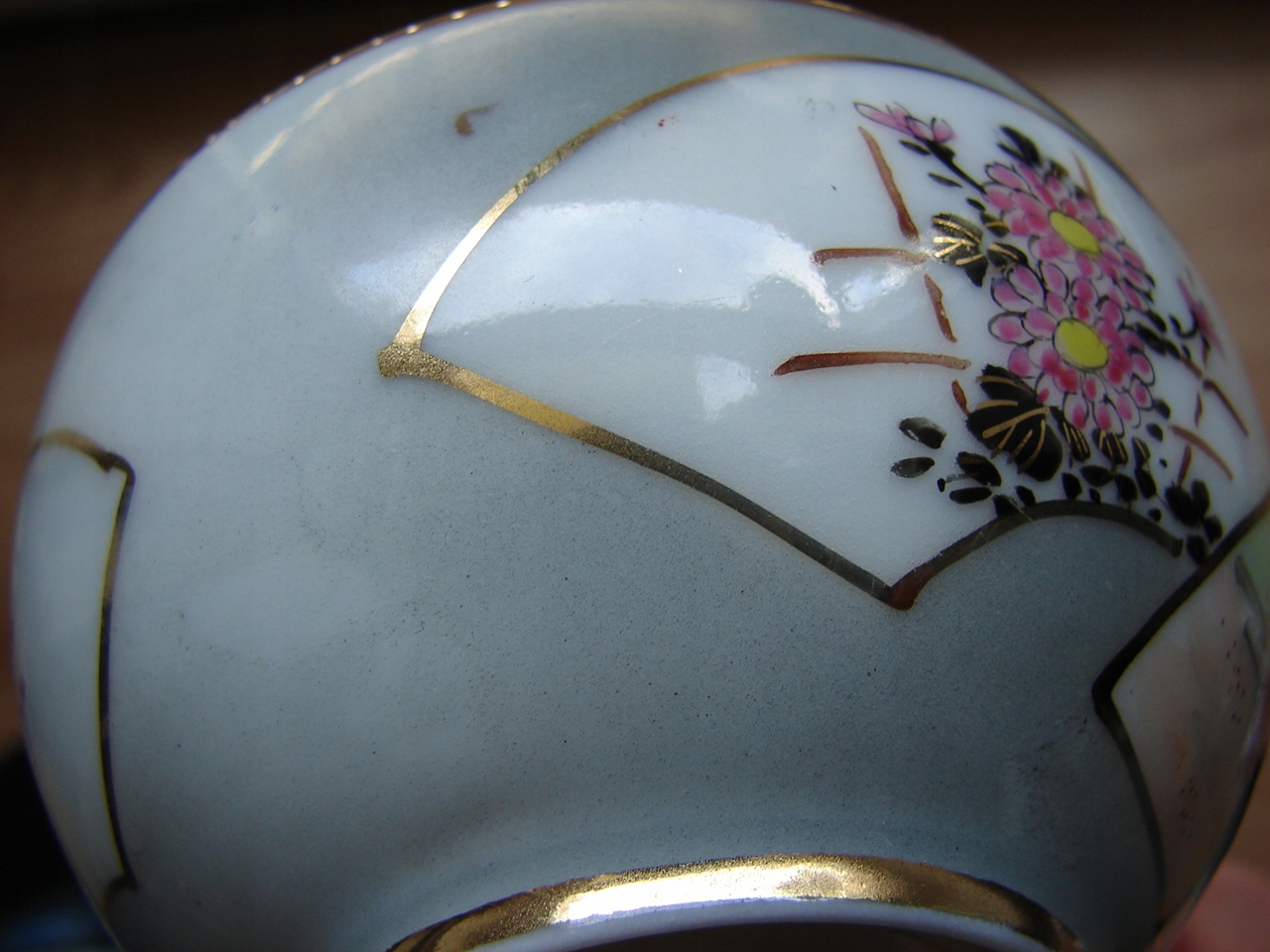 Весь добре зберігся без жодних тріщин - за винятком одного блюдця під чашкою, яке має скол на краю. На порцеляні є подряпини на фарбі.