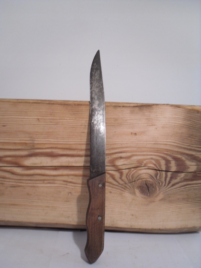 Ласкаво просимо на мій аукціон. На аукціонах я зазвичай пропоную вам речі часів Польської Народної Республіки. На даному аукціоні пропоную старий ВЕЛИКИЙ ніж з дерев'яною ручкою і цікаво виготовленим лезом. Ручка очищена та захищена деревним воском. Ніж не має вигинів і дефектів, тільки кінчик з невеликими ямками. Лезо захищене від корозії. Дуже цікавий експонат минулої епохи. Гарний сувенір, ідеальний для колекції. Дивіться фото.